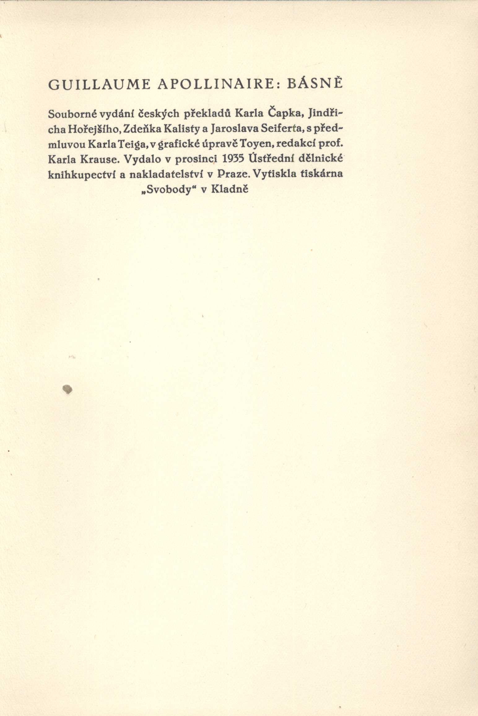 Keywords Čapek K. * francouzská literatura * poezie * Apollinaire G. * básně * české překlady * Hořejší J. * Kalista Z. * Seifert J. * frontispis * Toyen * r. 1935