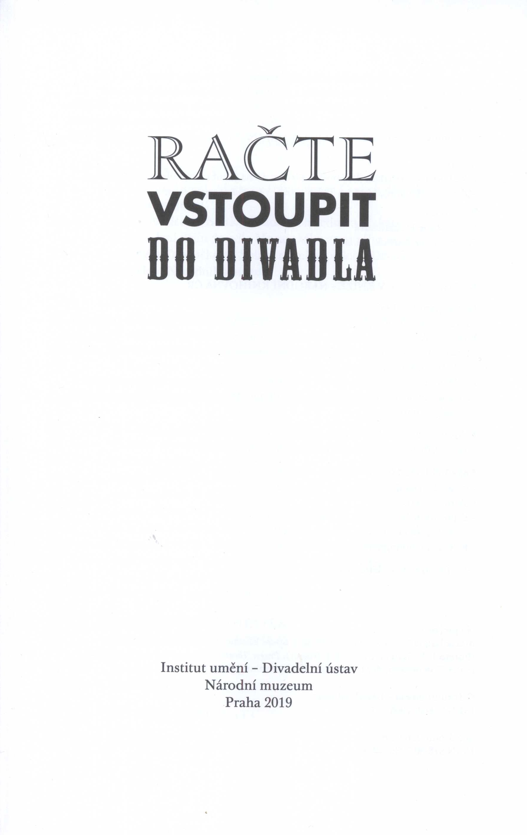 | Title information | Račte vstoupit do divadla = Komm rein ins Theater = Please enter our theatre / autoři textů: Jitka Ludvová, Jaroslav Blecha, Alena Jakubcová, Vojtěch Poláček, Milan Pospíšil, Markéta Trávníčková, Věra Velemanová ; překlad do němčiny Silke Klein, překlad do angličtiny Barbara Day ; graficky upravila a přebal navrhla Michaela Blažejová