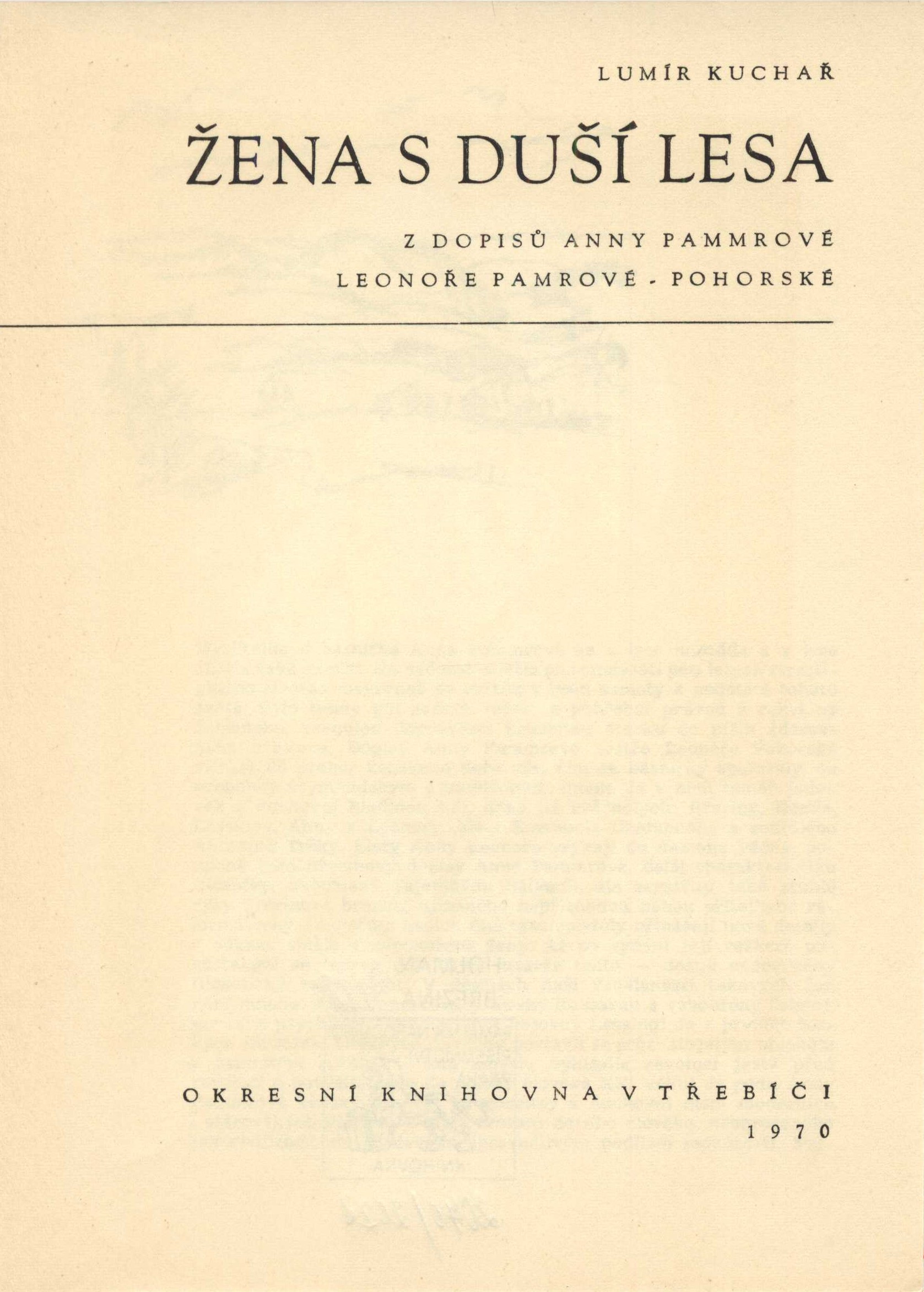 1. Title informationŽena s duší lesa : z dopisů Anny Pammrové Leonoře Pamrové Pohorské / Lumír Kuchař ; ilustrace Antonín F. Stehlík ; původní linořez, portrét A. Pammrové, grafická úprava, obálka a redakce Vladimír Lavický