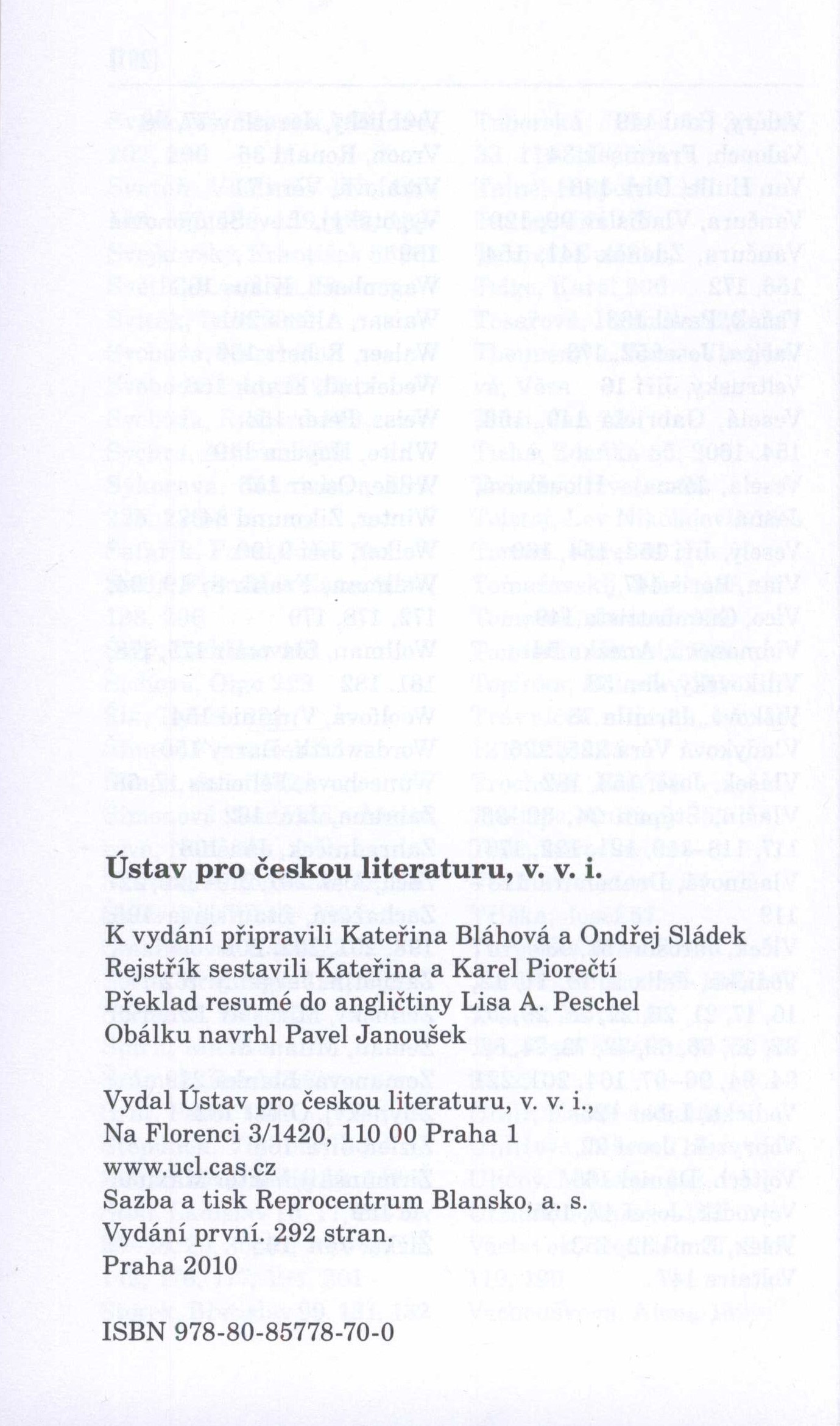 1. Title informationÚstav pro českou literaturu AV ČR, v.v.i. / Kateřina Bláhová, Ondřej Sládek (eds.) ; rejstřík sestavili Kateřina a Karel Piorečtí ; překlad resumé do angličtiny Lisa A. Peschel ; obálku navrhl Pavel Janoušek