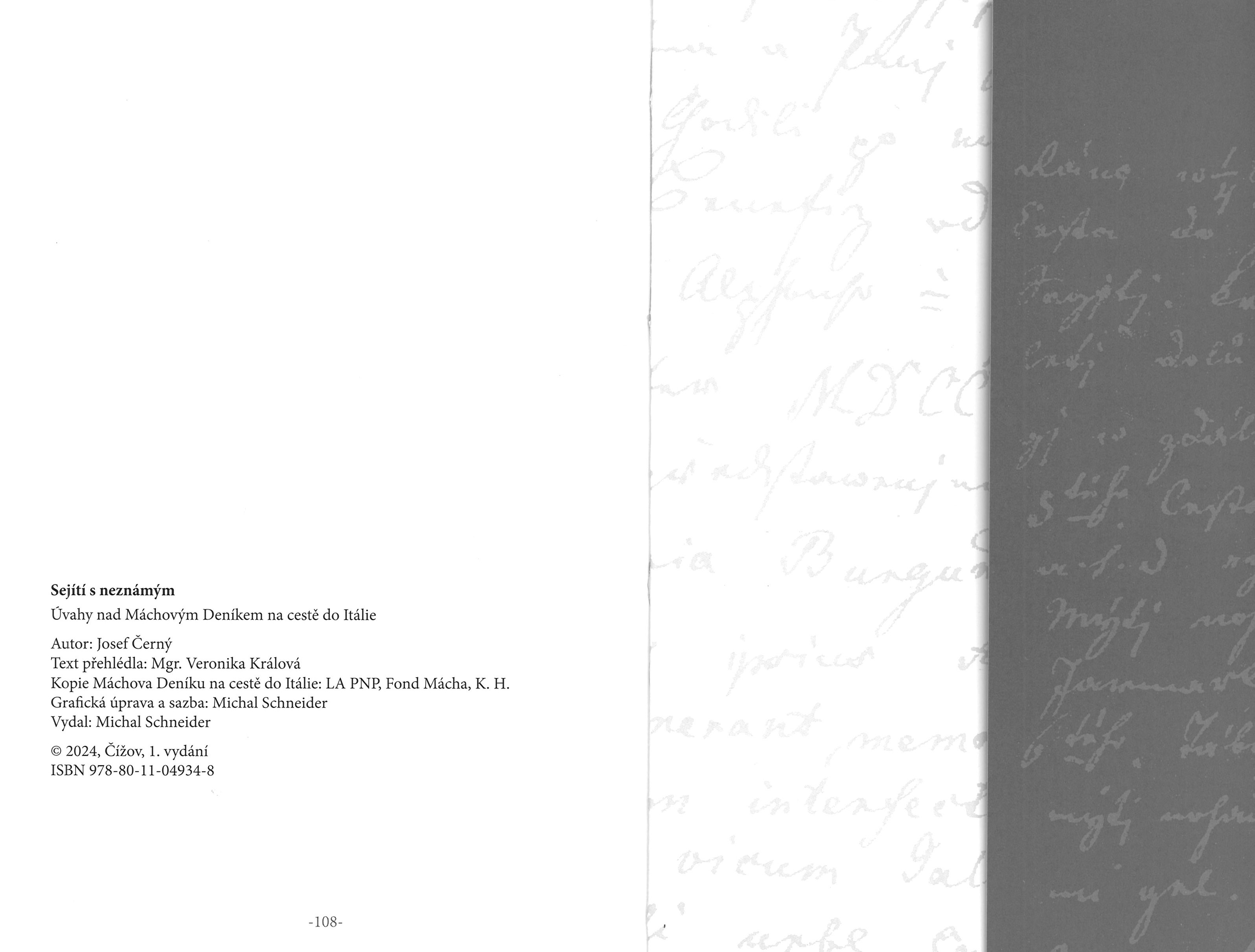 1. Title informationSejítí s neznámým : úvahy nad Máchovým Deníkem na cestě do Itálie / Josef Černý ; grafická úprava a sazba: Michal Schneider