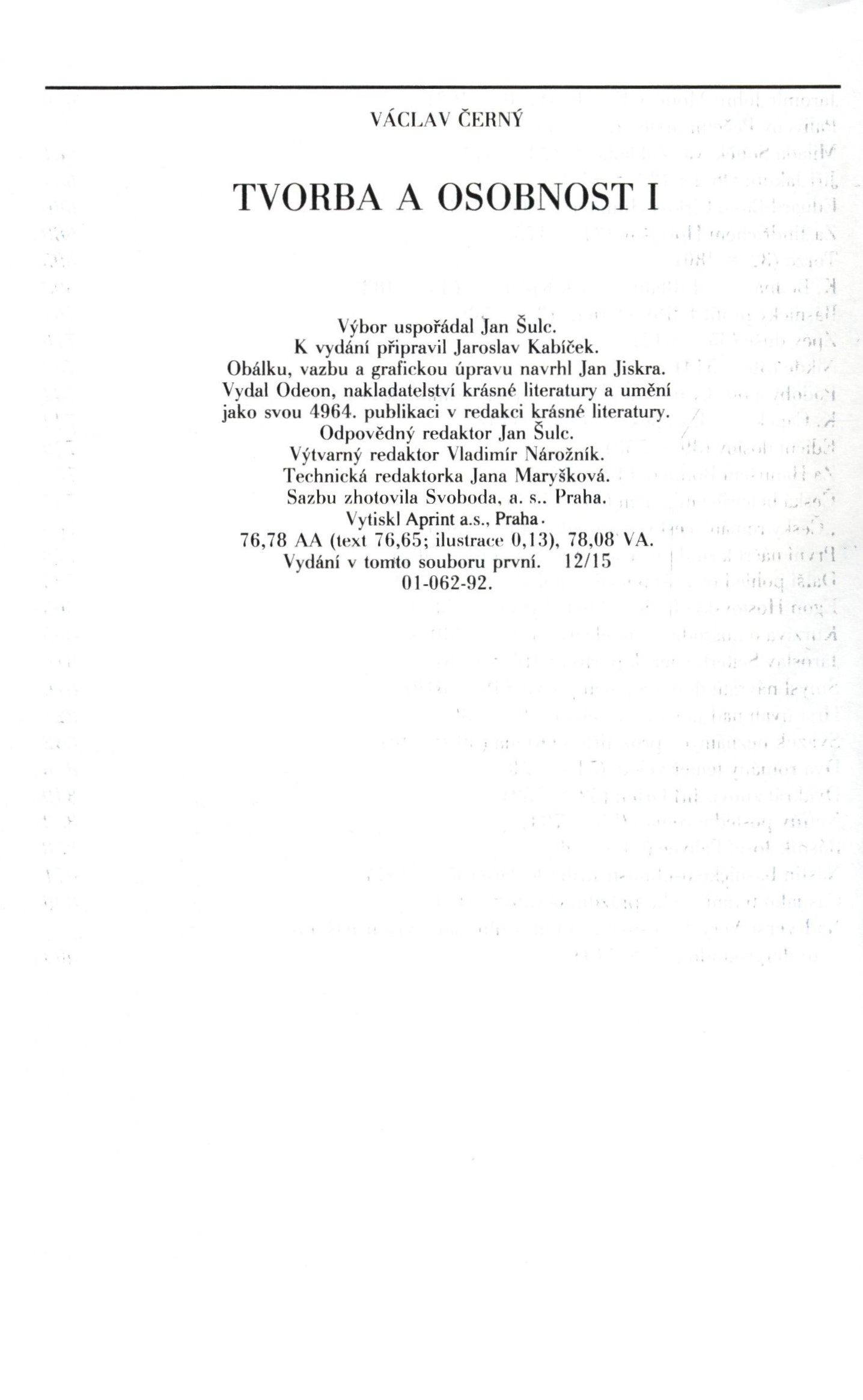 Title information Tvorba a osobnost I/ Václav Černý ; Sestavil Jan Šulc ; K vydání připravil Jaroslav Kabíček ; Obálku, vazbu a grafickou úpravu navrhl Jan Jiskra Personal name Černý, Václav, 1905-1987 (Author) Další autoři Šulc, Jan, 1965- (Compiler) (Editor) Kabíček, Jaroslav, 1931-1996 (Editor) Jiskra, Jan, 1949- (Graphic technician) Nárožník, Vladimír, 1939-2002 (Editor) Corporation Odeon (nakladatelství) (Publisher) Aprint a. s. (Printer) Edition statement 1. vydání v tomto souboru Publication V Praze : Odeon, 1992 V Praze : Aprint a. s. Scope 908 stran ; 21 cm ISBN 80-207-0411-6 (vázáno) Country Czech Republic Language Czech Note Barevný, typografický přebal. - Šedá obálka s bílou ražbou. - Portrét V. Černého na frontispisu, černobílá fotografie. - Barevný titulní list. - Text dělen římskými číslicemi. - Tiráž.