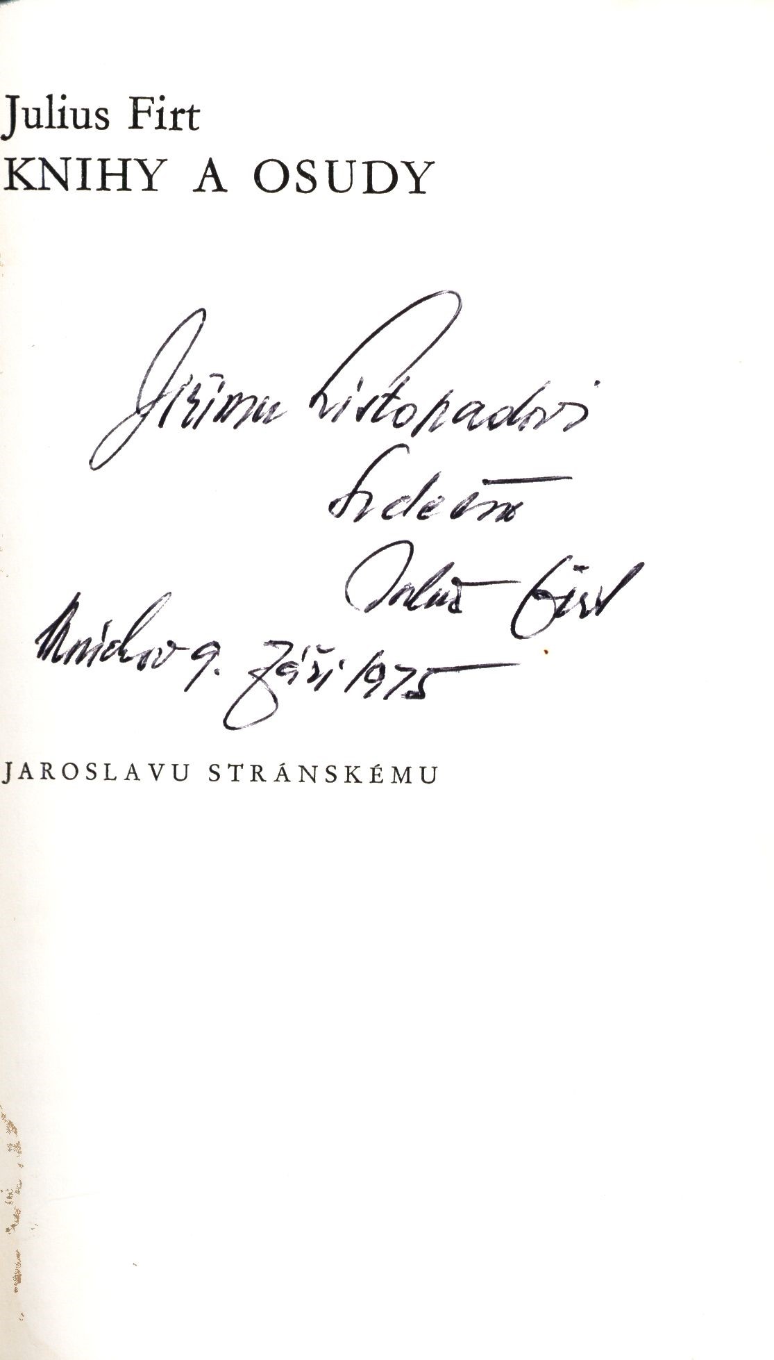 Title information Knihy a osudy / Julius Firt ; Do tisku připravil a doslov napsal Ludvík Veselý ; Obálku navrhl a grafickou úpravu provedl Jan Kotík Personal name Firt, Julius, 1897-1979 (Author) (Dedicator) Další autoři Veselý, Ludvík, 1920-1998 (Editor) (Author of afterword, colophon, etc.) Listopad, František, 1921-2017 (Dedicatee) Kotík, Jan, 1916-2002 (Graphic technician) (Bookjacket designer) Corporation Index (nakladatelství) (Publisher) Publication Köln : Index, 1972 Scope 294 stran, číslovaná příloha : faksimile, fotografie ; 17 cm + volně vložené listy ISBN (brožováno) Edition INDEX poezie