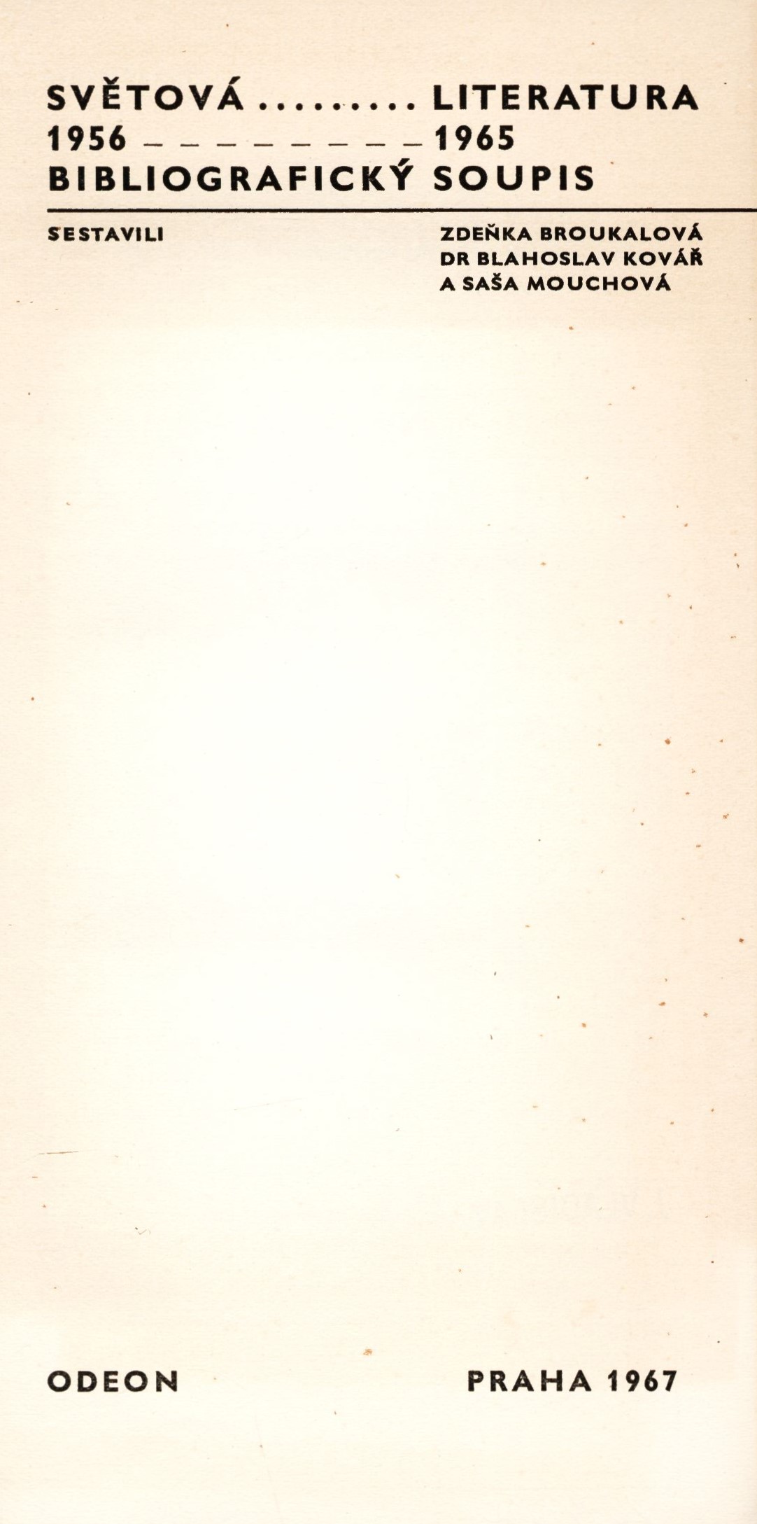 Title information Světová literatura 1956-1965 : Bibliografický soupis / Sestavili Zdeňka Broukalová, Blahoslav Kovář, Saša Mouchová ; Předmluvu napsali Josef Kadlec a Jan Řezáč ; Obálku s použitím reprodukce Alberta Giacomettiho navrhl Miloslav Fulín ; Graficky upravila Ludmila Zapletalová Personal name Broukalová, Zdeňka, 1922- (Author) (Compiler) Další autoři Kovář, Blahoslav, 1926-2002 (Author) (Compiler) Mouchová, Stanislava, 1921- (Author) (Compiler) Kadlec, Josef, 1919-2003 (Author of introduction) Řezáč, Jan, 1921-2009 (Author of introduction) Fulín, Miloslav, 1928-2019 (Graphic technician) Giacometti, Alberto, 1901-1966 (Illustrator) Zapletalová, Ludmila (Graphic technician) Corporation Odeon (nakladatelství) (Publisher) Rudé právo (tiskárna, Praha) (Printer) Publication Praha : Odeon, 1967 Manufacture Rudé právo Scope 379 stran, 16 stran nečíslované obrazové přílohy : fotografie ; 20 cm ISBN (vázáno) Country Czech Republic Language Czech Note Zdobená obálka. - Seznam děl. - Černobílé fotografie na přílohách. - Rejstříky. - Seznam šifer. - Základní redakční údaje o Světové literatuře. - Obsah. - Tiráž.