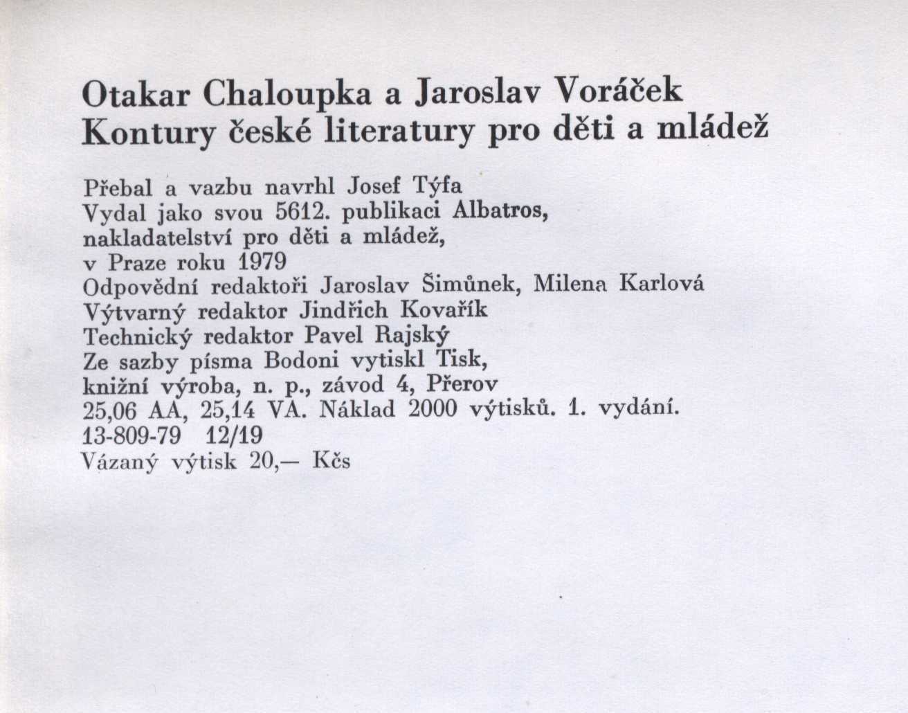 Title information Kontury české literatury pro děti a mládež / Otakar Chaloupka a Jaroslav Voráček ; [přebal a vazbu navrhl Josef Týfa] Personal name Chaloupka, Otakar, 1935-2013 (Author) Další autoři Voráček, Jaroslav, 1927-1997 (Author) Týfa, Josef, 1913-2007 (Graphic technician) Slabý, Zdeněk Karel, 1930-2020 (Dedicatee) Corporation Nakladatelství Albatros (Publisher) Edition statement 1. vyd. Publication Praha : Albatros, 1979 Manufacture Tisk 4) Scope 296 s. ISBN (váz.) Country -cs Language Czech Note Obsahuje rejstřík. -- Ruské a německé resumé. -- Medailony autorů.