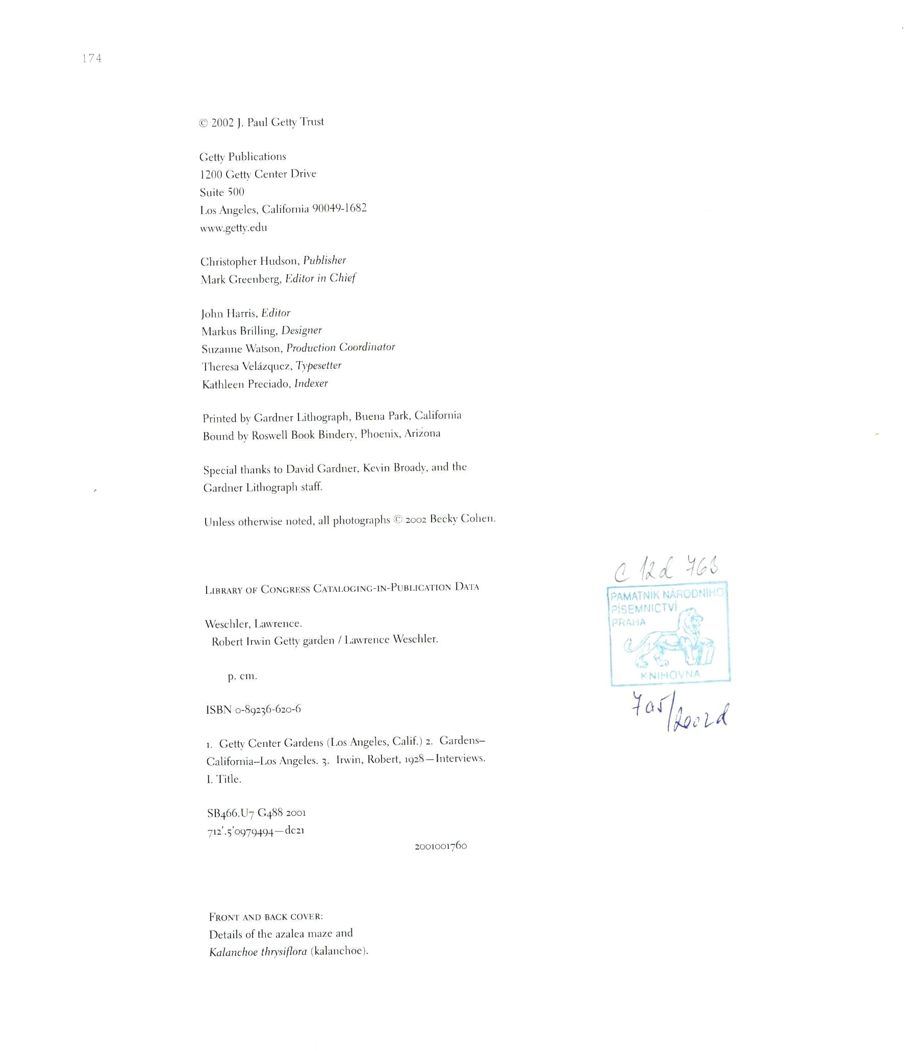 AnnotationFotografická publikace o zahradních úpravách a vegetaci zahrady Getty Center v kalifornském Los Angeles, podle návrhu současného umělce Roberta Irwina.