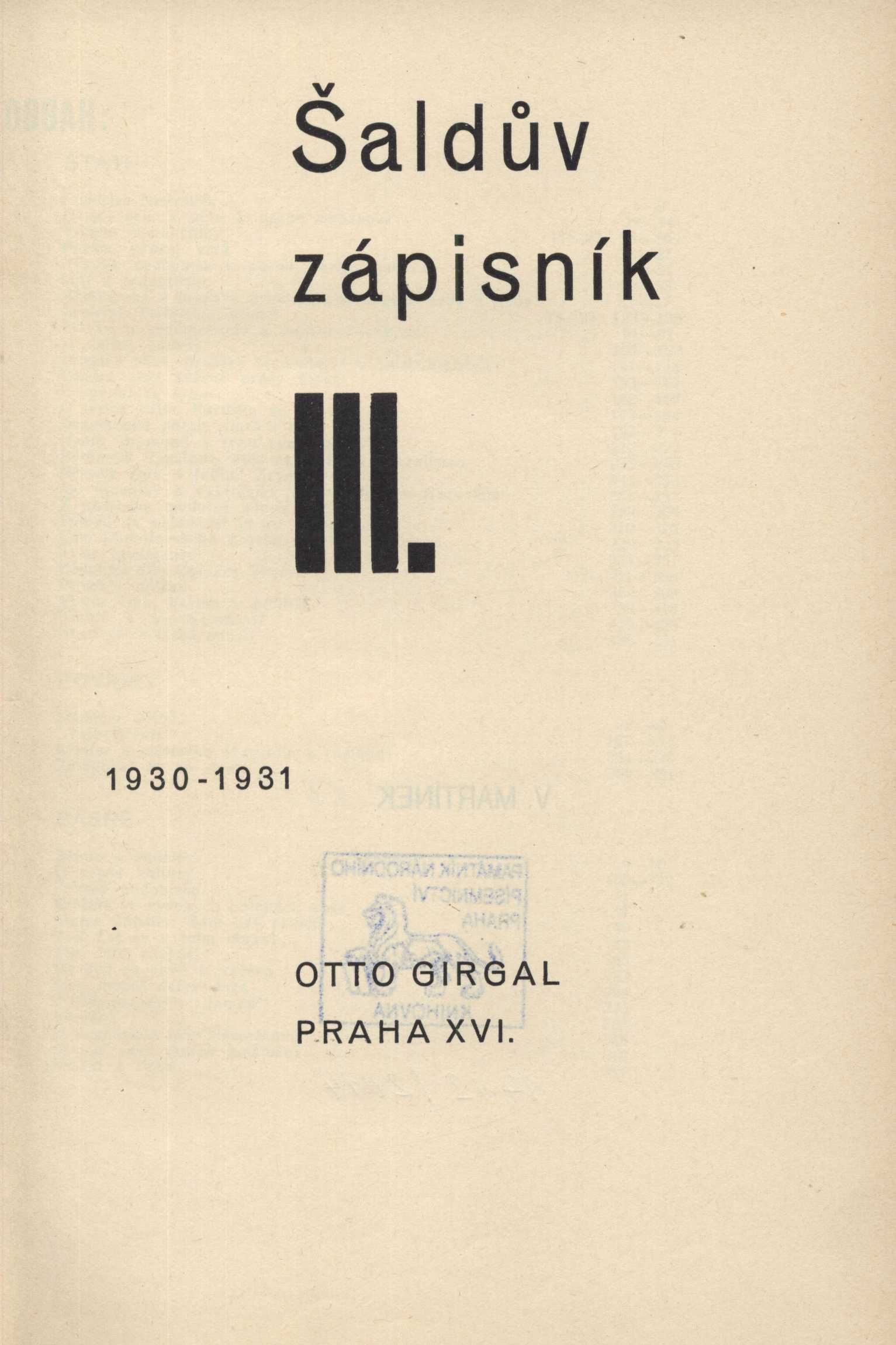 Title information Šaldův zápisník : list pro poesii, politiku a život Personal name Šalda, F. X., 1867-1937 (Editor) Další autoři Otto Girgal (nakladatelství) (Publisher) Jaroslav Hoffmann (knihtiskárna) (Printer) Roč., číslo Ročník 3, číslo 1-14, 1930/1931 Publication Praha : Otto Girgal, 1930-1931 Manufacture Jar. Hoffmann Scope 444 stran ; 21 cm Country Czech Republic Language Czech Note 1-14 (dvojčísla 5-6, 8-9, 11-12, 13-14; září 1930 - červen 1931)