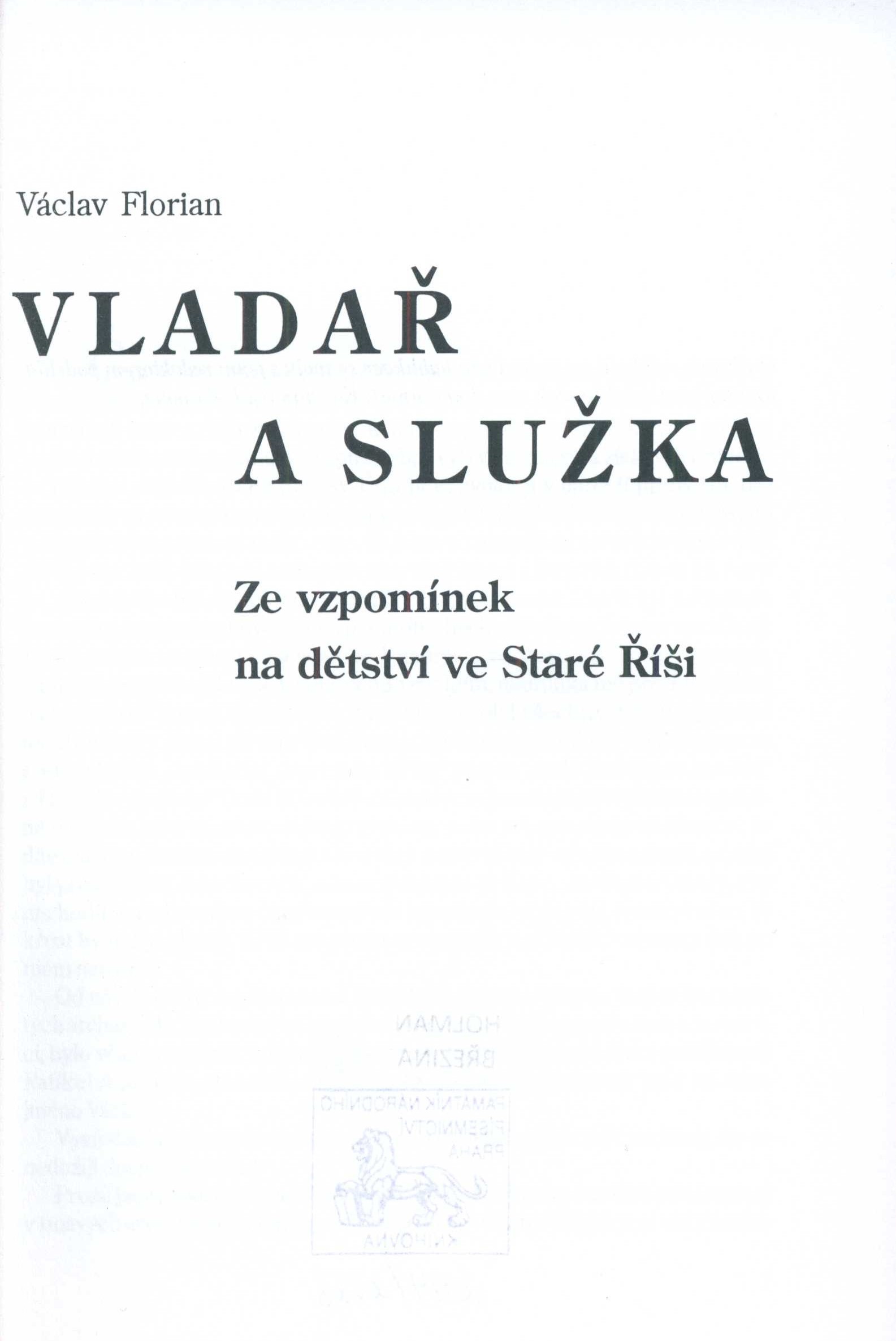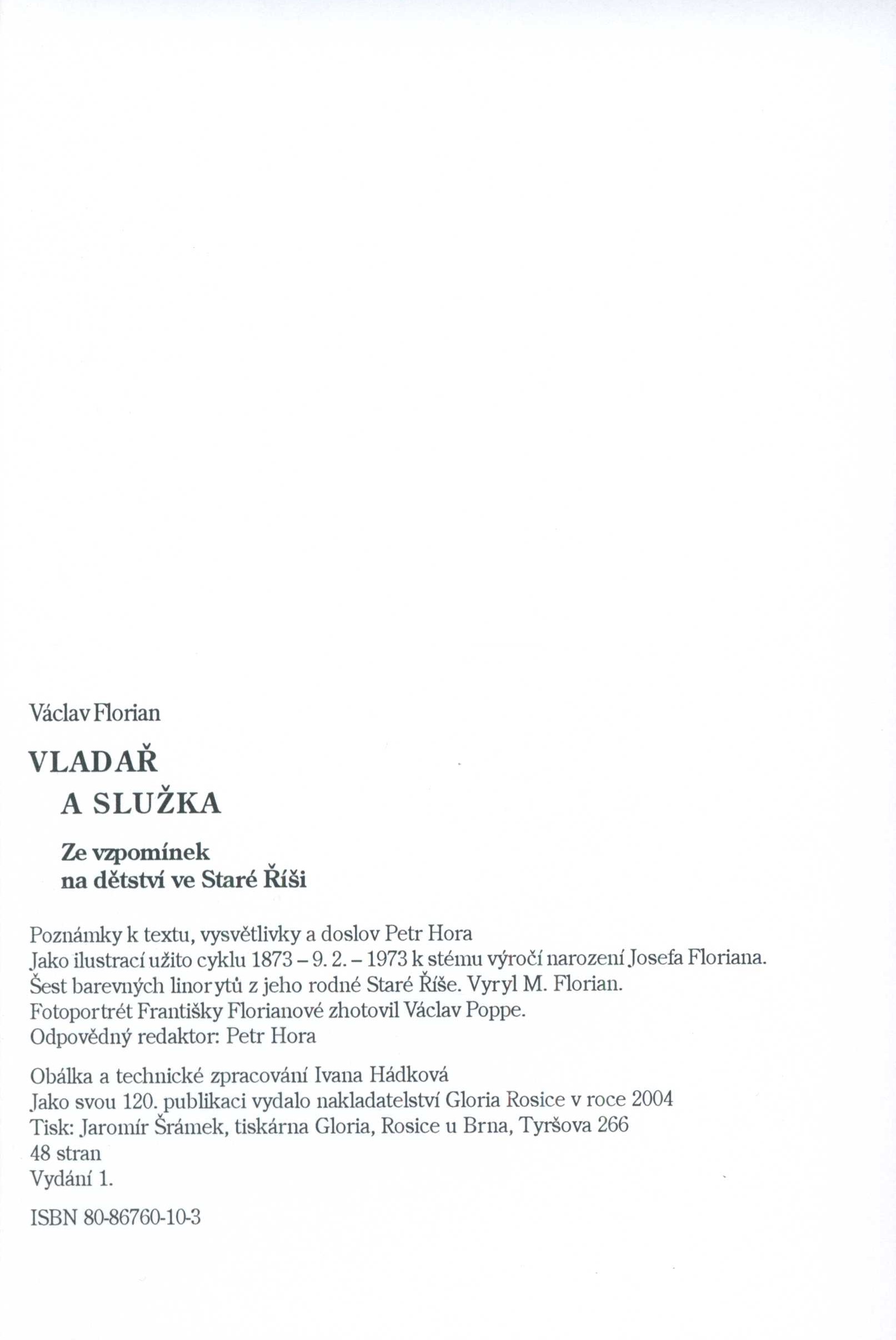 Title information Vladař a služka : ze vzpomínek na dětství ve Staré Říši / Václav Florian ; poznámky k textu, vysvětlivky a doslov Petr Hora ; fotoportrét Františky Florianové zhotovil Václav Poppe ; obálka a technické zpracování Ivana Hádková Personal name Florian, Václav, 1927-2007 (Author) Další autoři Hora, Petr, 1958-2012 (Author of afterword, colophon, etc.) Poppe, Václav, 1909-1981 (Photographer) Hádková, Ivana (Bookjacket designer) Florian, Michael, 1911-1984 (Artist) (Illustrator) Corporation Gloria (firma) (Publisher) (Printer) Edition statement Vydání 1. Publication Rosice u Brna : Gloria, 2004 Scope 36 stran, 8 nečíslovaných stran obrazových příloh : ilustrace, portréty ; 21 cm ISBN 80-86760-10-3 (brožováno) Country Czech Republic Language Czech Note Dvoubarevná typografická obálka. - Poznámky. - Doslov. - Ediční poznámky. - Barevné reprodukce linorytů a tónovaný fotografický portrét Františky Florianové v obrazové příloze na křídovém papíře. - Obsah.