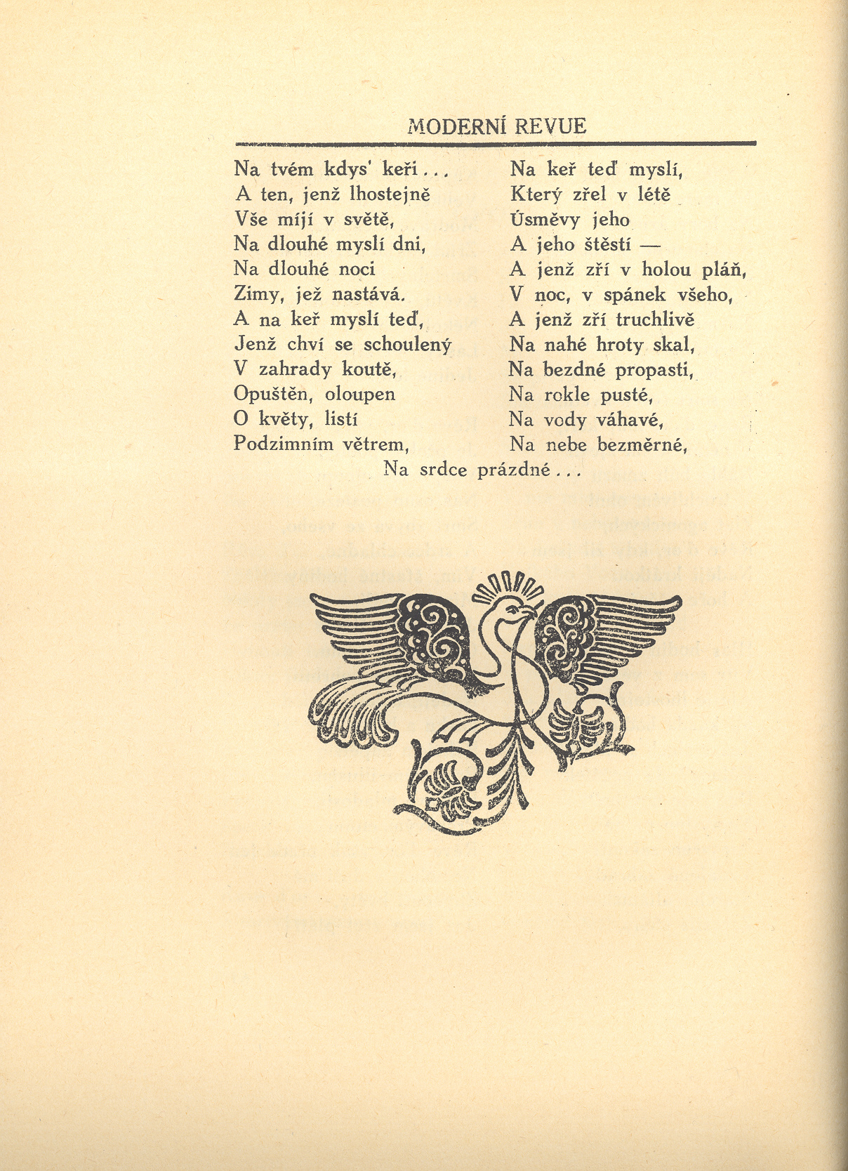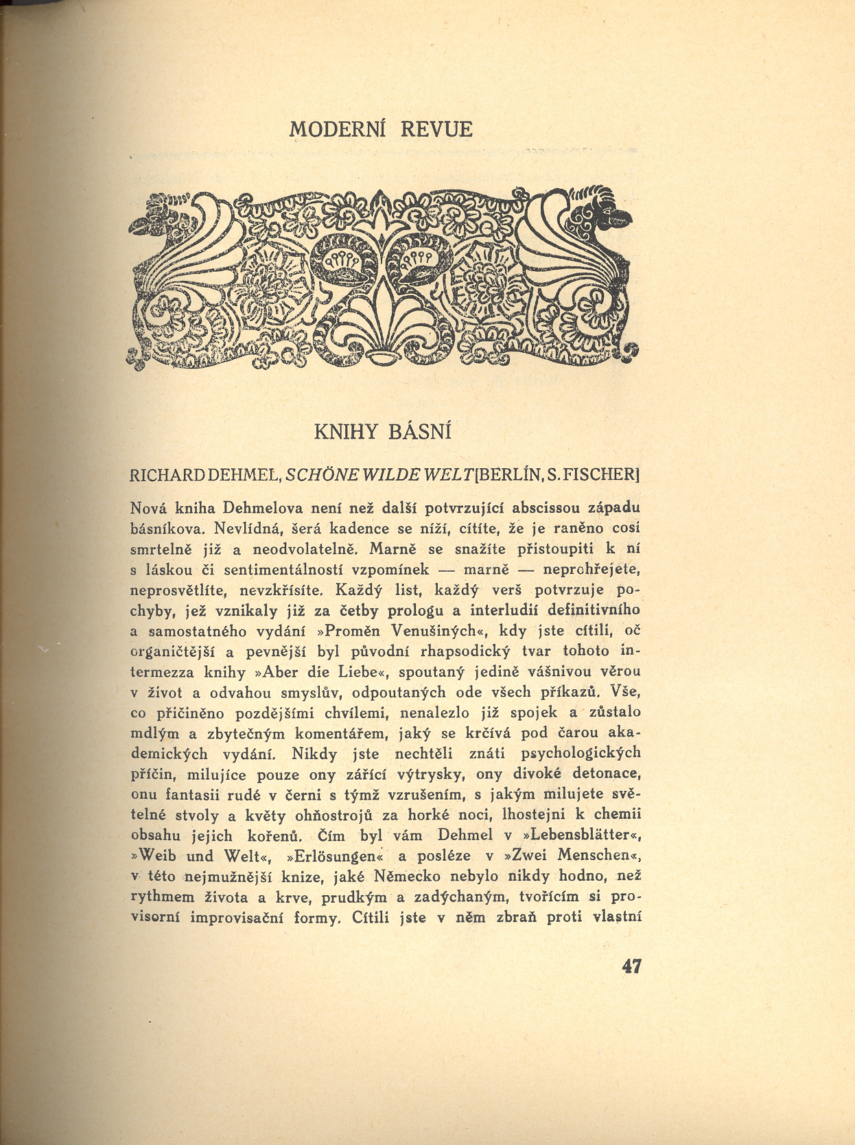 Názvové údaje Moderní revue : pro literaturu, umění a život Další autoři Procházka, Arnošt, 1869-1925 (Editor) Karásek ze Lvovic, Jiří, 1871-1951 (Editor) Rassenfosse, Armand, 1862-1934 (Grafický technik) Boutet, Henri, 1851-1919 (Grafický technik) Whistler, James McNeill, 1834-1903 (Grafický technik) Kobliha, František, 1877-1962 (Grafický technik) (Dřevorytec) Hodek, Josef, 1888-1973 (Grafický technik) (Dřevorytec) Charmoy, José de, 1879-1919 (Grafický technik) Tusar, Slavoboj, 1885-1950 (Grafický technik) (Dřevorytec) Launay, Fabien, 1877-1904 (Grafický technik) Roč., číslo Ročník 20, svazek 28, číslo 1-12, 1913/1914 Nakladatel V Praze : Arnošt Procházka, 1913-1914 Rozsah 526 stran, 11 nečíslovaných listů obrazových příloh : ilustrace ISSN 1212-5962 Země vyd. Česko Jazyk dok. čeština Poznámky Dřevoryty (grafiky na obálkách, viněty a koncovky ve všech číslech) od Miloše Klicmana. - Obálky různých barev, vždy se stejnou grafikou. - Ročník obsahuje 11 příloh na nečíslovaných listech (zahrnutých do stránkování): 1 reprodukovaný obraz "Pokušení" (před s. 3) a 1 rytina "Čiň dobře a doufej v lepší" (za s. 526) Armanda Rassenfosse; 1 reprodukovaný obraz Henriho Bouteta "Žena hledající blech" (před s. 21); 1 dřevoryt Františka Koblihy "Ex Libris M. Dýšek" (před s. 103); 2 dřevoryty Josefa Hodka, "Malý akt" (před s. 151) a z cyklu "Pan" (před s. 167); 2 fotografie soch Josého de Charmoy, bysta "Renan" (před s. 295) a "Anděl z pomníku Beethovena" (před s. 345); 2 dřevoryty Slavoboje Tusara, "Villiers de L'Isle-Adam" (před s. 363) a "Ze staré Prahy - Dům U Jezulátka na malostranském tržišti" (před s. 491); 1 kresba Fabiena Launaye "U moře" (před s. 507)