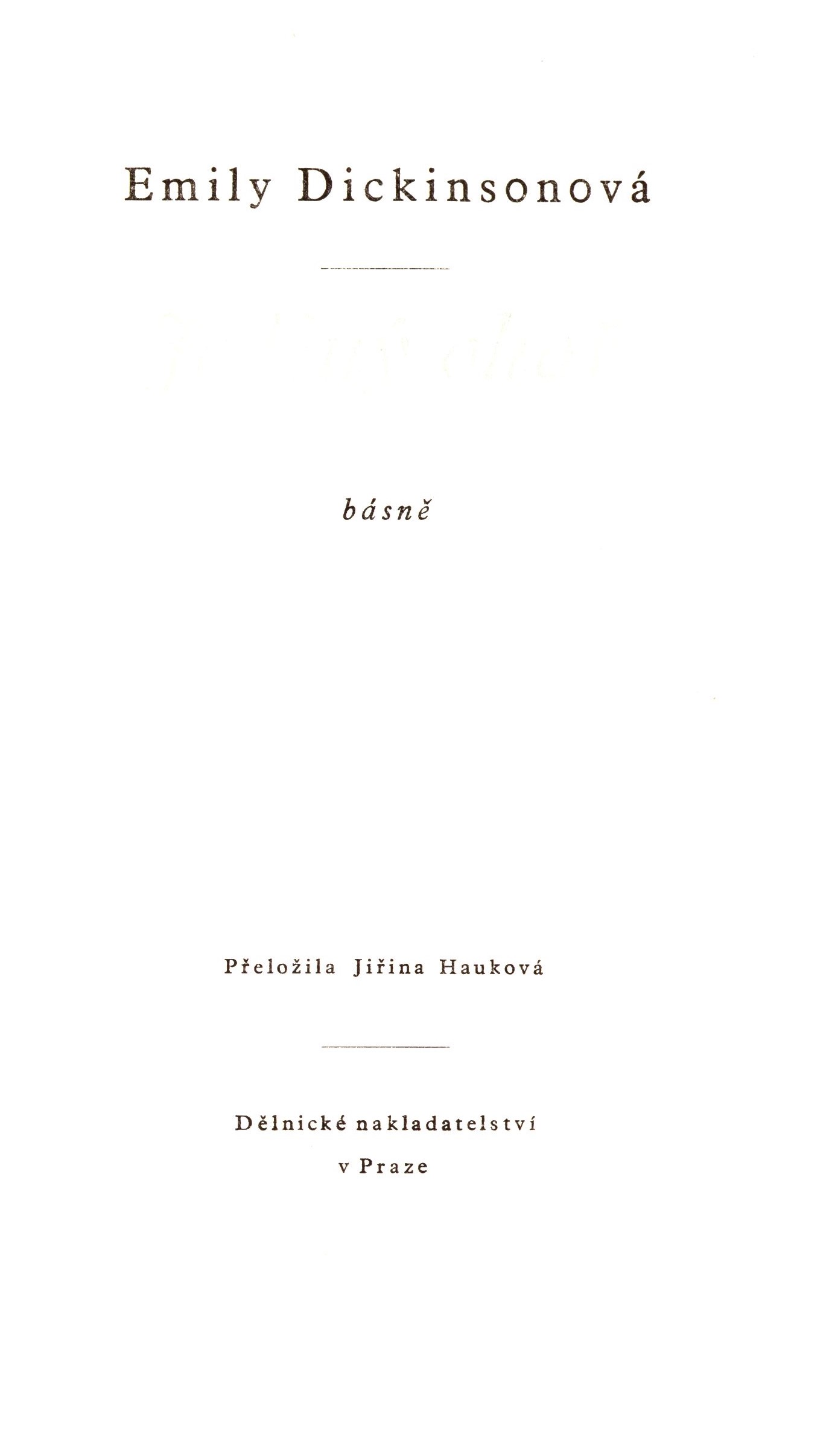 Title information Jediný ohař : básně / Emily Dickinsonová ; přeložila Jiřina Hauková ; s obálkou a frontispicem Václava Bartovského Personal name Dickinson, Emily, 1830-1886 (Author) Další autoři Hauková, Jiřina, 1919-2005 (Translator) (Former owner) (Dedicator) Bartovský, Václav, 1903-1961 (Bookjacket designer) (Illustrator) Chalupecký, Jindřich, 1910-1990 (Former owner) Vladislav, Jan, 1923-2009 (Dedicatee) Corporation Dělnické nakladatelství (Publisher) Cíl (tiskárna v Praze) (Printer) Edition statement první vydání Publication V Praze : Dělnické nakladatelství, 1948 Manufacture Cíl Scope 64 stran ; 22 cm ISBN (brožováno) Edition Edice Souhvězdí 2. svazek