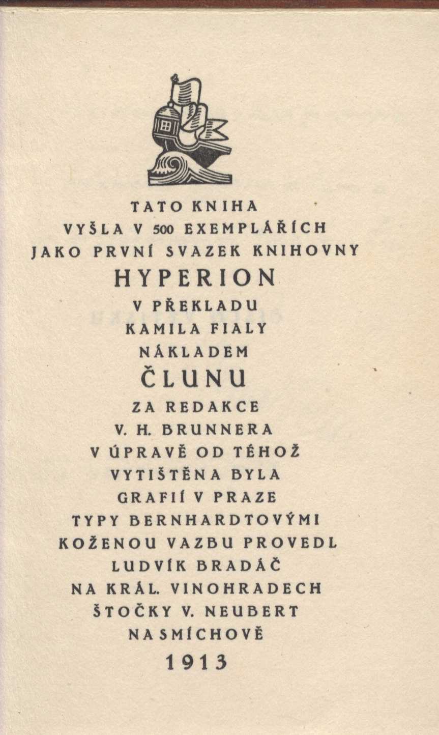 Hyperion, (Člun)Country Czech Republic Language Czech Language of the original French Note Zdobená umělecká kožená vazba Ludvíka Bradáče. - Vinětová a iniciálová výzdoba patrně V. H. Brunnera. - Náklad 500 exemplářů. - Sazba typy Bernhardtovými. - Dvojbarevný (červený a černý) tisk titulního listu. - Tiráž: "Tato kniha vyšla v 500 exemplářích jako první svazek knihovny Hyperion v překladu Kamila Fialy nákladem Člunu za redakce V. H. Brunnera v úpravě od téhož. Vytištěna byla Grafií v Praze typy Bernhardtovými. Koženou vazbu provedl Ludvík Bradáč na Král. Vinohradech. Štočky V. Neubert na Smíchově."