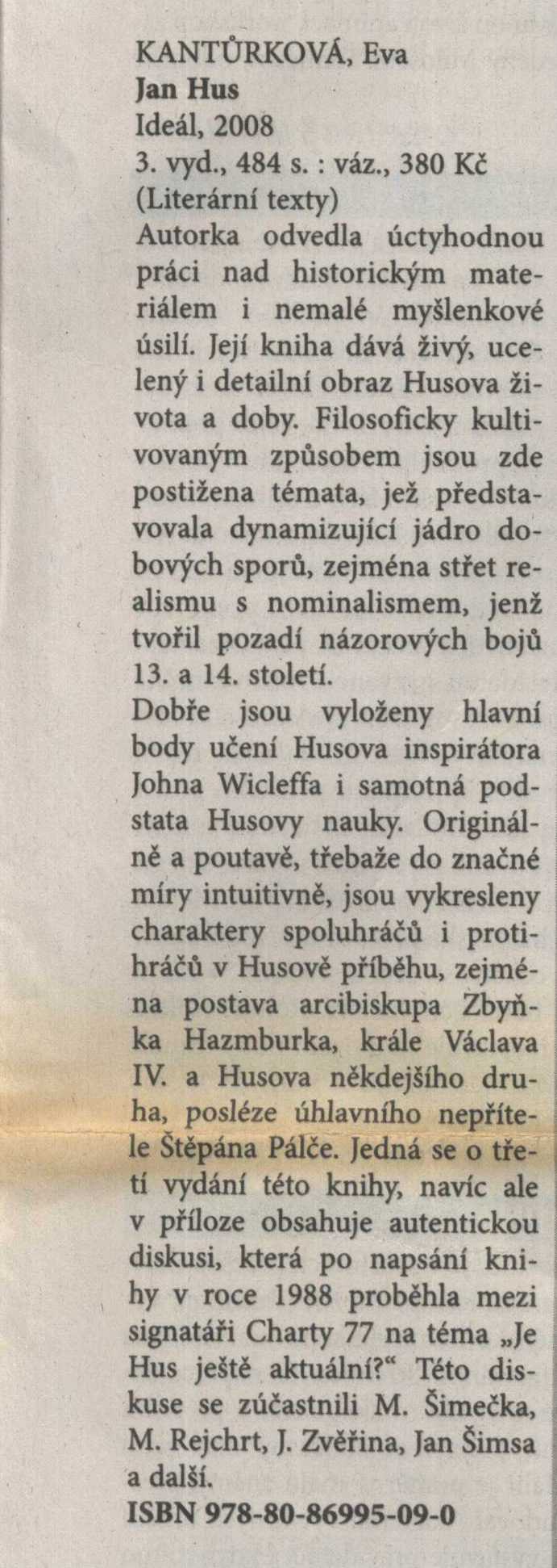 Literární texty, (Vydavatelství Ideál)Country Czech Republic Language Czech Note Na modrošedém přebalu použita barevná reprodukce obrazu A. Muchy Mistr Jan Hus v kapli Betlémské ze Slovanské epopeje, dvoubarevný text a nakladatelská značka. - Fialová vazba s reprodukcí obrazu, s dvoubarevným textem a s nakladatelskou značkou, na zadní straně vazby úryvek z textu "Světlo a stín českých dějin". - Na přední záložce anotace knihy (úryvek z textu "Je Jan Hus ještě aktuální?"), na zadní barevné foto autorky a stručná bibliografie. - Přídeští a předsádky s faksimile rukopisných textů. - Nakladatelská značka na vakátě. - Nakladatelská značka na titulním listu. - Obsah. - Věnování. - Citát J. Husa. - Drobné černobílé ilustrace na začátku kapitol. - Poznámka autorky. - Poděkování. - Seznam autorů textů diskuse ke studii E. Kantůrkové. - Poznámka vydavatele. - Diskuse (texty). - Ediční poznámka. - O nakladatelství Ideál. - Úryvek z textu "Světlo a stín českých dějin" na zadní straně obálky. - Přebal.