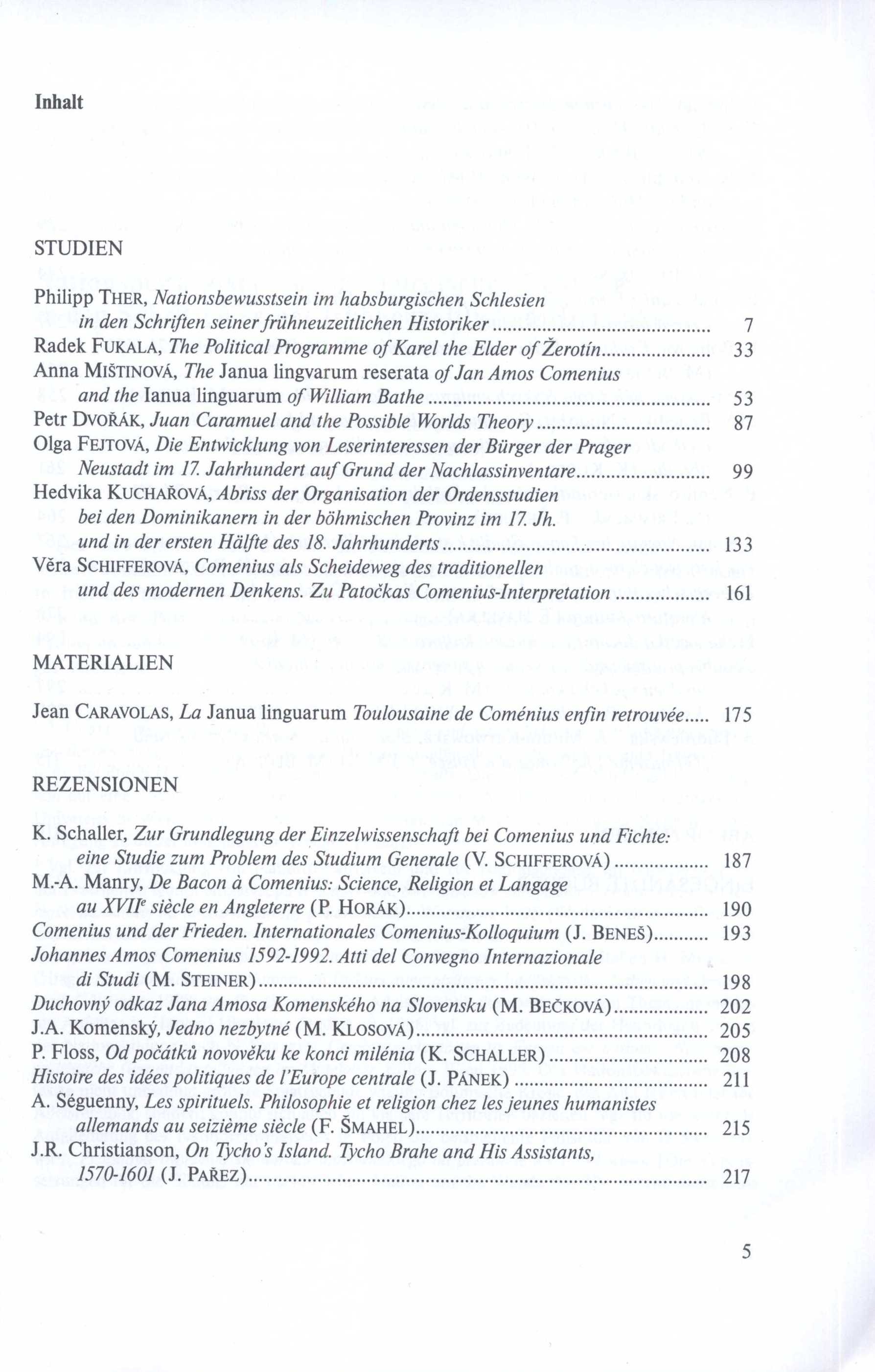 Title information Acta Comeniana : Archiv pro bádání o životě a díle Jana Amose Komenského XXXVIII. Begründet 1910 von Ján Kvačala = Internationale Revue für Studien über J.A. Comenius und Ideengeschichte der Frühen Neuzeit = International review of Comenius studies and early modern intellectual history Další autoři Kvačala, Ján, 1862-1934 (Editor) Bečková, Marta, 1930- (Publishing director) Corporation Filozofický ústav (Akademie věd ČR) (Publisher) Filosofia (nakladatelství) (Publisher) Ústav jaderných informací Zbraslav, a.s. (tiskárna) (Printer) Roč., číslo 14=XXXVIII, 2000 Edition statement 1. vydání Publication Praha : Filosofia, 2000 Manufacture Ústav jaderných informací, a.s. Scope 321 stran ; 24 cm ISBN 80-7007-152-4 (brožováno) ISSN 0231-5955 Country Czech Republic Language German * English * French Note Německý, anglický text a francouzský text. - Anglická, německá a česká resumé. - Seznam zkratek. - 400 výtisků
