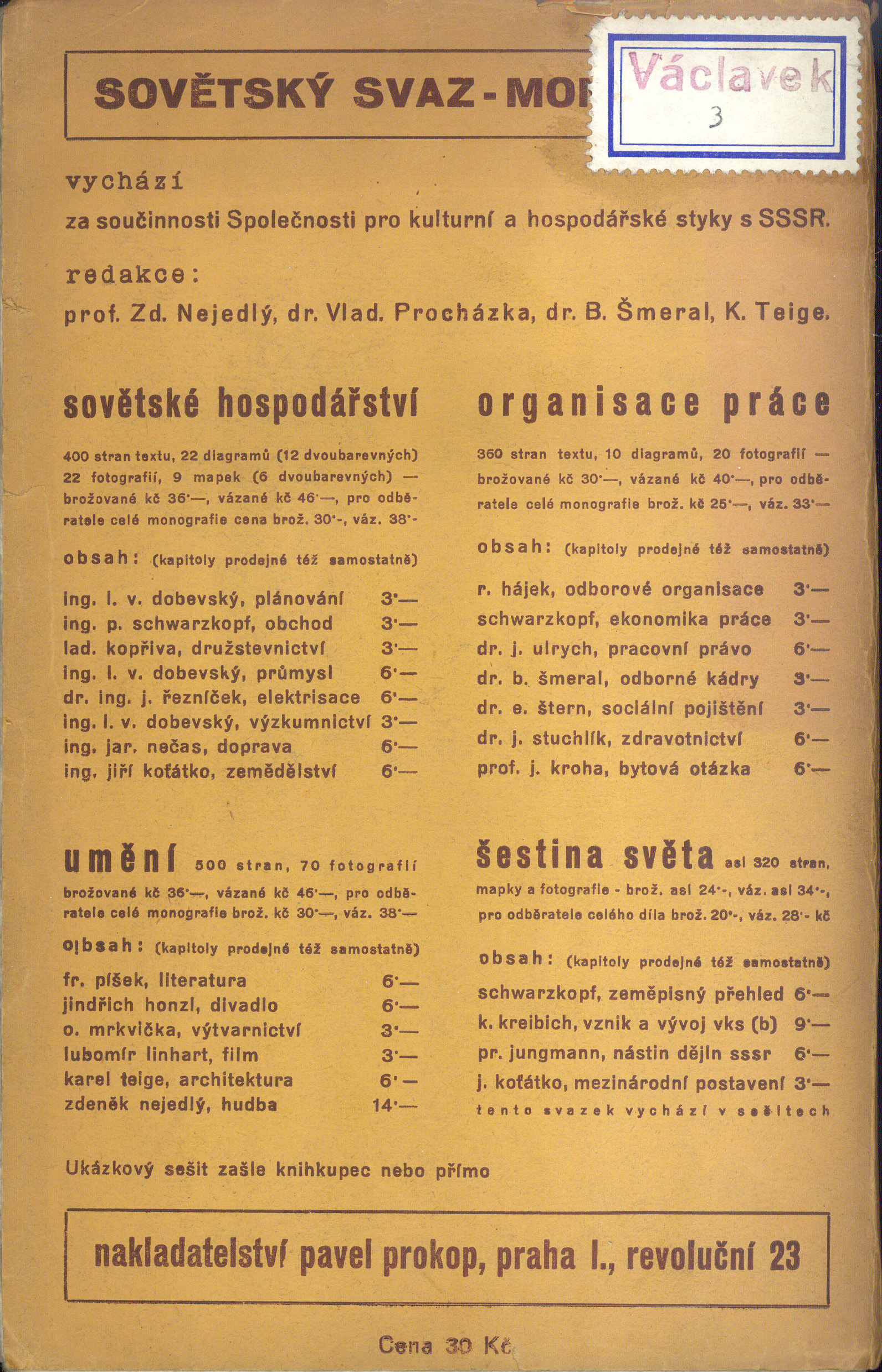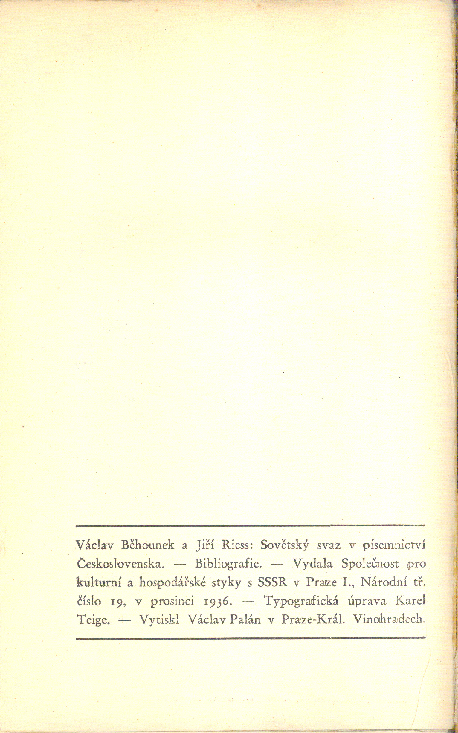 Title information Sovětský svaz v písemnictví Československa : bibliografie / Václav Běhounek, Jiří Riess ; [typogafická úprava Karel Teige] Personal name Běhounek, Václav, 1902-1980 (Author) (Author of introduction) Další autoři Rys, Jiří, 1901-1986 (Author) Teige, Karel, 1900-1951 (Graphic technician) (Bookjacket designer) Corporation Společnost pro kulturní a hospodářské styky s SSSR (v Praze) (Publisher) V. Palán (knihtiskárna) (Printer) Publication Praha : Společnost pro kulturní a hospodářské styky s SSSR, 1936 Manufacture (vytiskl Václav Palán v Praze-Král. Vinohradech) Scope xvi, 253, [3]s. ; 21,1 cm Country -cs Language Czech * Russian Note Titulní list a předmluva souběžně rusky.