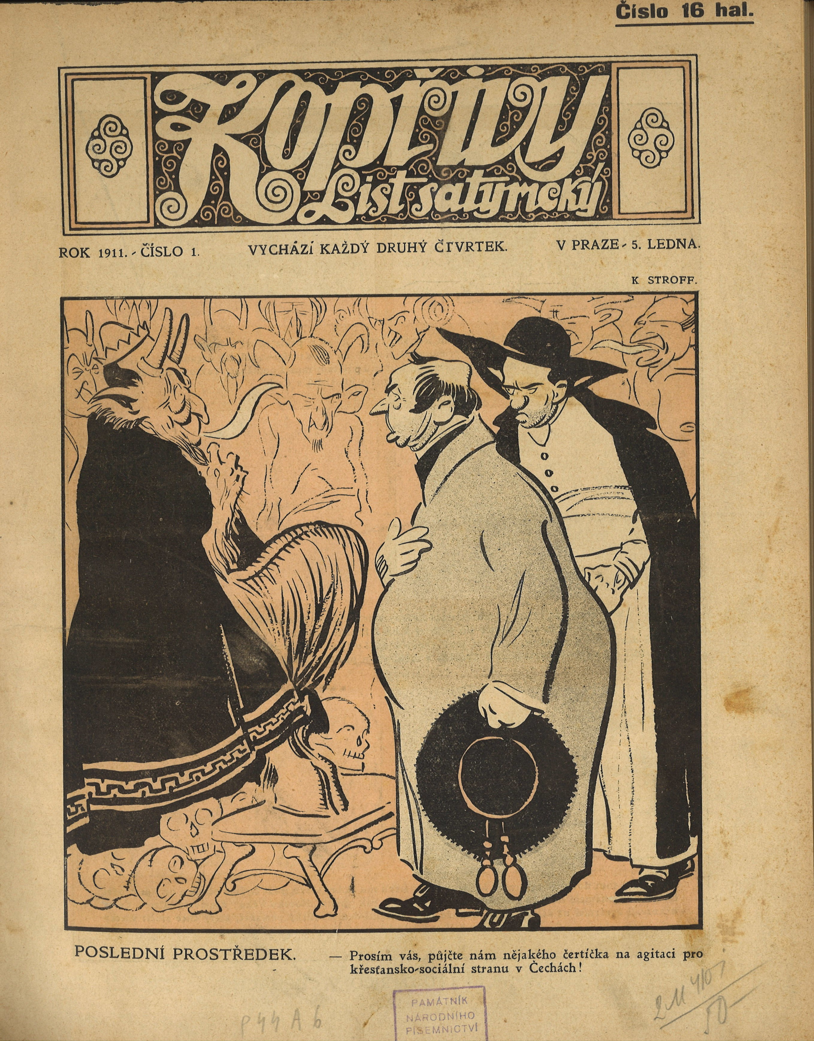 AnnotationSatirický časopis socialistické, resp. sociálnědemokratické orientace. Byl bohatě ilustrován celostránkovými satirickými vtipy četných autorů (např. J. Panuška, K. Nejedlý, K. Stroff, V. H. Brunner, J. T. Blažek, F. Tratnik, Angelo Zeyer, Z. Kratochvíl) a obsahoval krátké vtipy, básně a prózy. Útočil především na politické konkurenty sociální demokracie, průmyslníky a církev. -- (kkper)