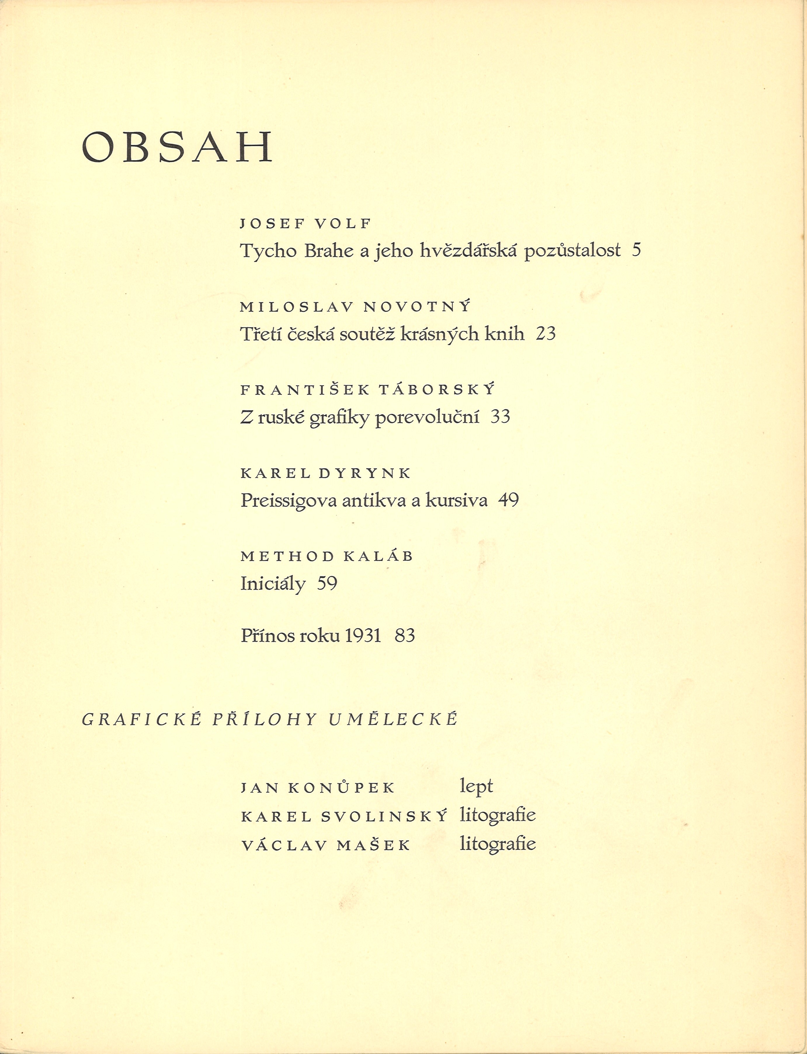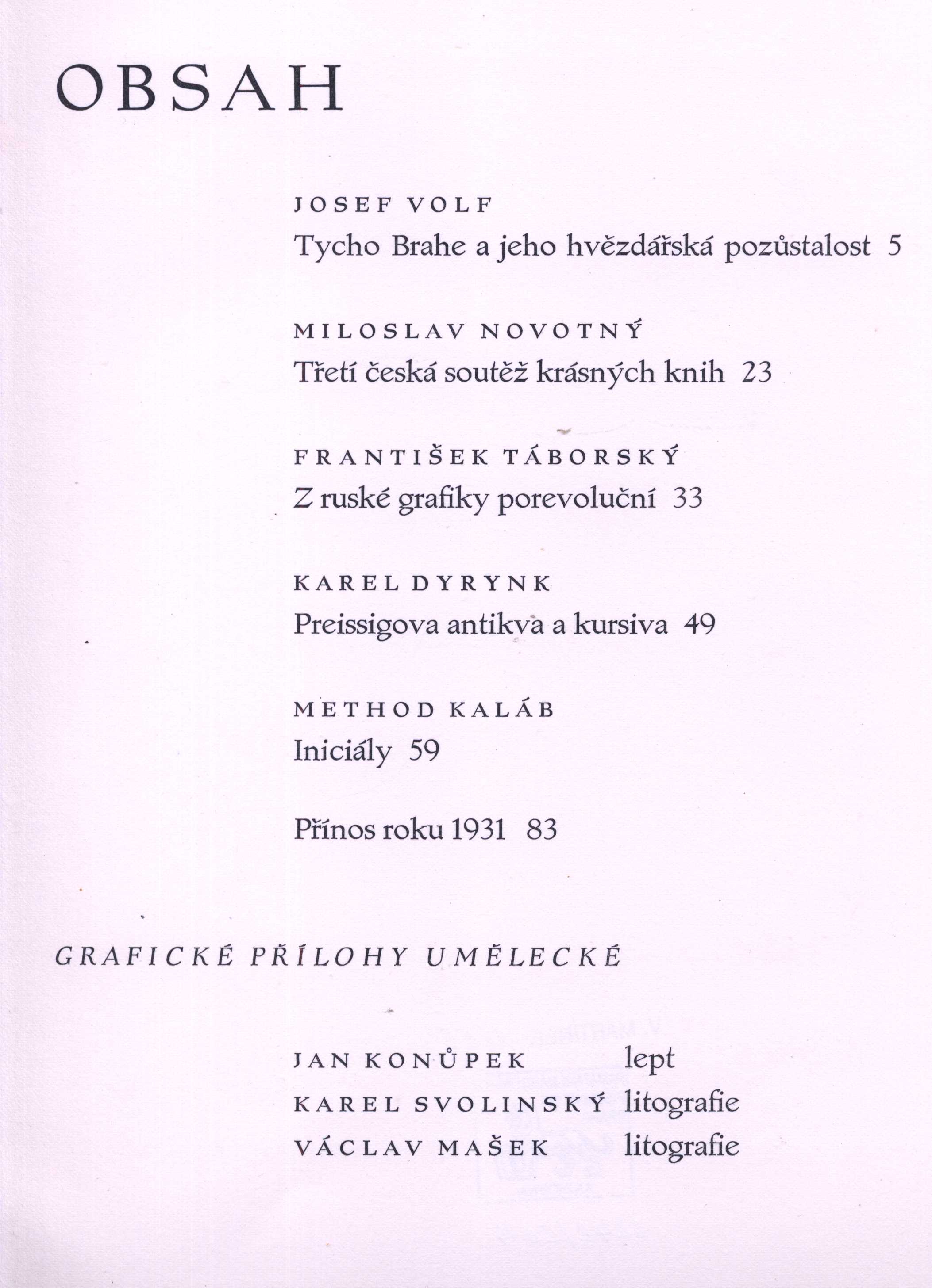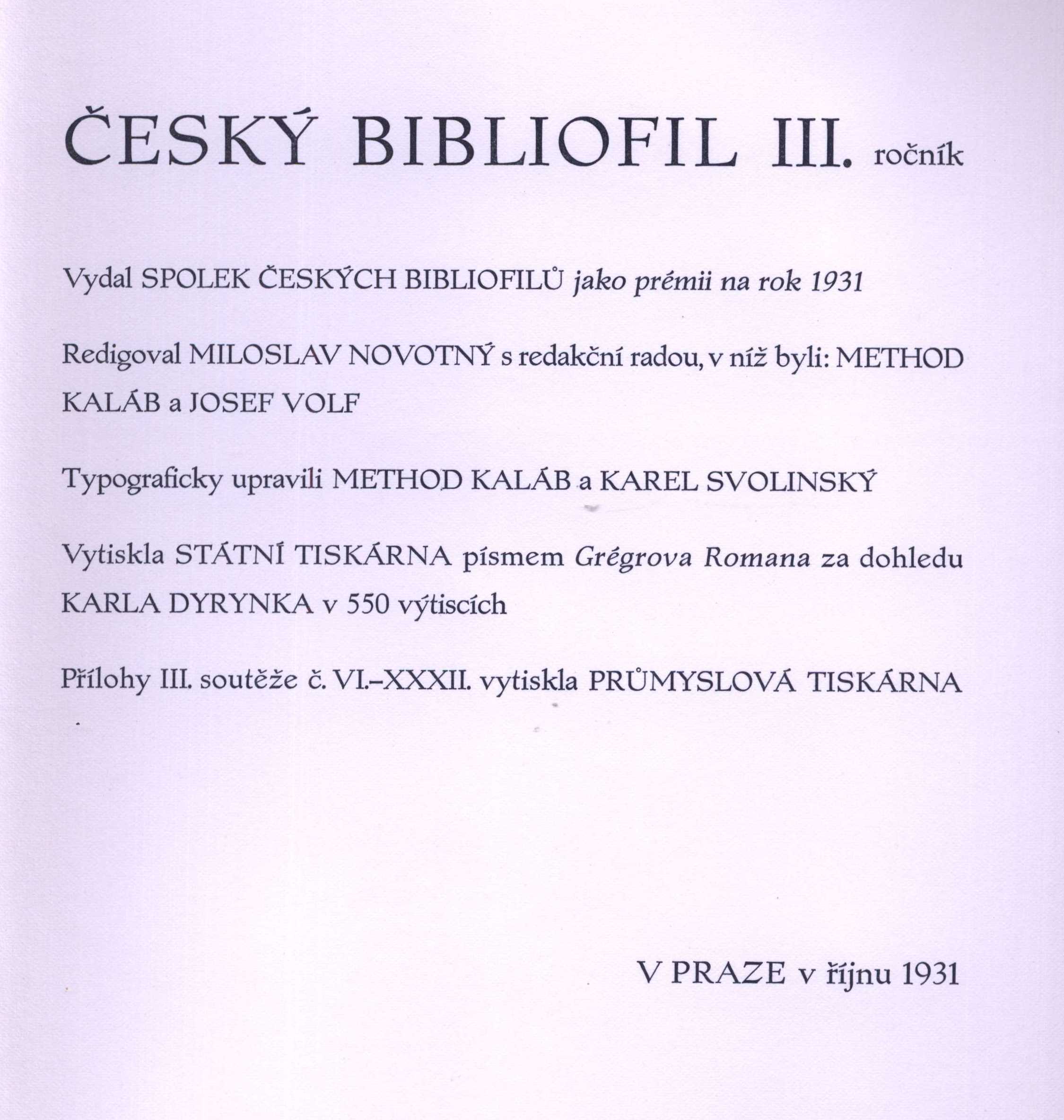 Title information Český bibliofil : prémie Spolku českých bibliofilů 1931 Další autoři Novotný, Miloslav, 1894-1966 (Editor) Kaláb, Method, 1885-1963 (Editor) (Typographer) Volf, Josef, 1878-1937 (Editor) Svolinský, Karel, 1896-1986 (Typographer) (Graphic technician) (Lithographer) Dyrynk, Karel, 1876-1949 (Printer) Knytl, Jaroslav, 1891-1970 (Former owner) Konůpek, Jan, 1883-1950 (Graphic technician) (Etcher) Mašek, Václav, 1893-1973 (Graphic technician) (Lithographer) Karásek ze Lvovic, Jiří, 1871-1951 (Inscriber) Corporation Spolek českých bibliofilů v Praze (Publisher) Státní tiskárna v Praze (Printer) Průmyslová tiskárna v Praze (Printer of plates) Roč., číslo Ročník 3, 1931 Publication Praha : Spolek českých bibliofilů, 1931 Manufacture Státní tiskárna Scope 89 stran, 42 nečíslovaných stran obrazové přílohy : ilustrace ; 31 cm + 3 grafické přílohy ISBN (Brožováno) Country Czech Republic Language Czech Note Přesný rozsah: [4], 89, [3] s., [42] s. obr. příl., [3] l. obr. příl. - Obsahuje tři signované listy grafické přílohy: 1. Jan Konůpek: lept ; 2. Karel Svolinský: litografie ; 3. Václav Mašek: litografie. - Průsvitný ochranný přebal a papírové pouzdro. - Dvoubarevný (červený a černý) tisk titulního listu. - Černobílé reprodukce ruských grafik a iniciál různých českých výtvarných umělců (Mánes, Aleš, Braunerová, Preissig, Kašpar, Benda, Brunner, Kysela, Kobliha, Dyrynk, Bouda, Svolinský), ukázky písma a sazeb. - Obsahuje barevné (resp. černě a červeně tištěné) faksimile sazeb a ilustrací z knih oceněných ve 3. soutěži nejkrásnějších knih (celkem 42 stran). - 550 výtisků