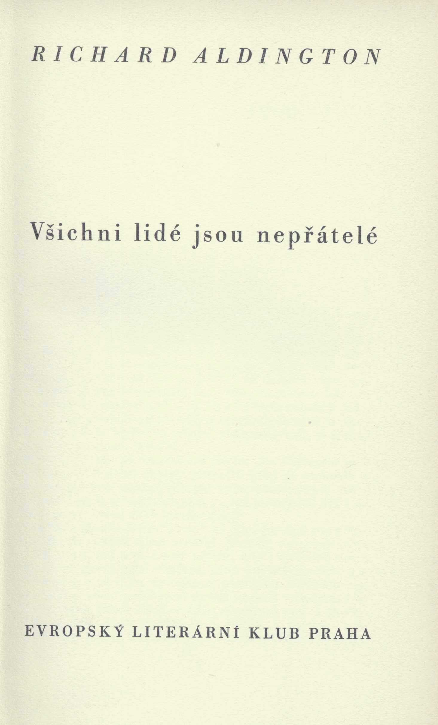 Druh dok. monografie Klíčová slova překladová literatura * anglická literatura * próza * román * Aldington R. * český překlad * Pober J. * Vokrová-Ambrožová L. * r. 1936 * romance MDT 821.111 * 82-3 * 82-31 * =030 * (0:82-39) Uživatelské pole PNP Kniha se sign. AVrbova 130 - Knihovna Aleny Vrbové: Zdob. barev. plát. vazba s tiskem na hřbetě. -- Černé přídeští. -- Nakl. značka na vakátě. -- Pozn. aut. U knihy se sign. AVrbova 130 chybí pův. ochranný obal. Sign. P 28 a 68 - Retrokatalog U sign. ELK 0106 a ELK 0106a (stejné vázané výtisky) typizovaná, barevná, zdobená obálka (F. Muzika) se značkou nakladatelství. - Světle zelená plátěná vazba (F. Muzika) s barevnou raženou nakladatelskou značkou. - Na přední záložce poznámka o autorovi. - U nakladatelské značky razítko Archiv Čs. spisovatel, č. P 622. - Patitul. - Titulní list. - Autorova poznámka. - Obsah. - Tiráž. - Zdobená zadní strana obálky. U sign. ELK 0106 a ELK 0106a jsou podlepované částečně poškozené obálky. Tiráž: "Richard Aldington: Všichni lidé jsou nepřátelé. Romance. Z anglické předlohy přeložil Jiří Pober a Liuše Vokrová-Ambrosová. Podle typografické úpravy Jindřicha Štyrského vytiskla knihtiskárna Orbis v Praze garmondem písma Ideal-News. Pro členy Evropského literárního klubu v Praze XVI, Přemyslova 16, vyšlo 1. září 1936. Vazba i ochranný obal jsou provedeny podle návrhu Františka Muziky." Rozsah: 439, [9] s. Rozměr: 21,7 cm U sign. AHO (Archiv Hořejší) - vázaný výtisk bez obálky. - Hnědá polokožená (pře)vazba s barevným papírovým polepem, ražený text s ozdůbkami na hřbetu se 4 falešnými vazy, dvoubarevný kapitálek. Rozměr po převazbě: 20,8 cm. Originál All men are ennemies vyšel roku 1932. Signatura Přír.číslo Lokace Info AVrbova 130 1840/2009 Sbírka ELK 0106 2374/2012 Sbírka ELK 0106a 2375/2012 Sbírka P 28 a 68 5048/72 AHO 0283 0328/2022 Sbírka