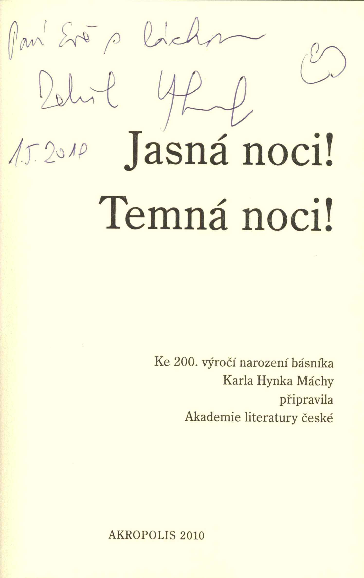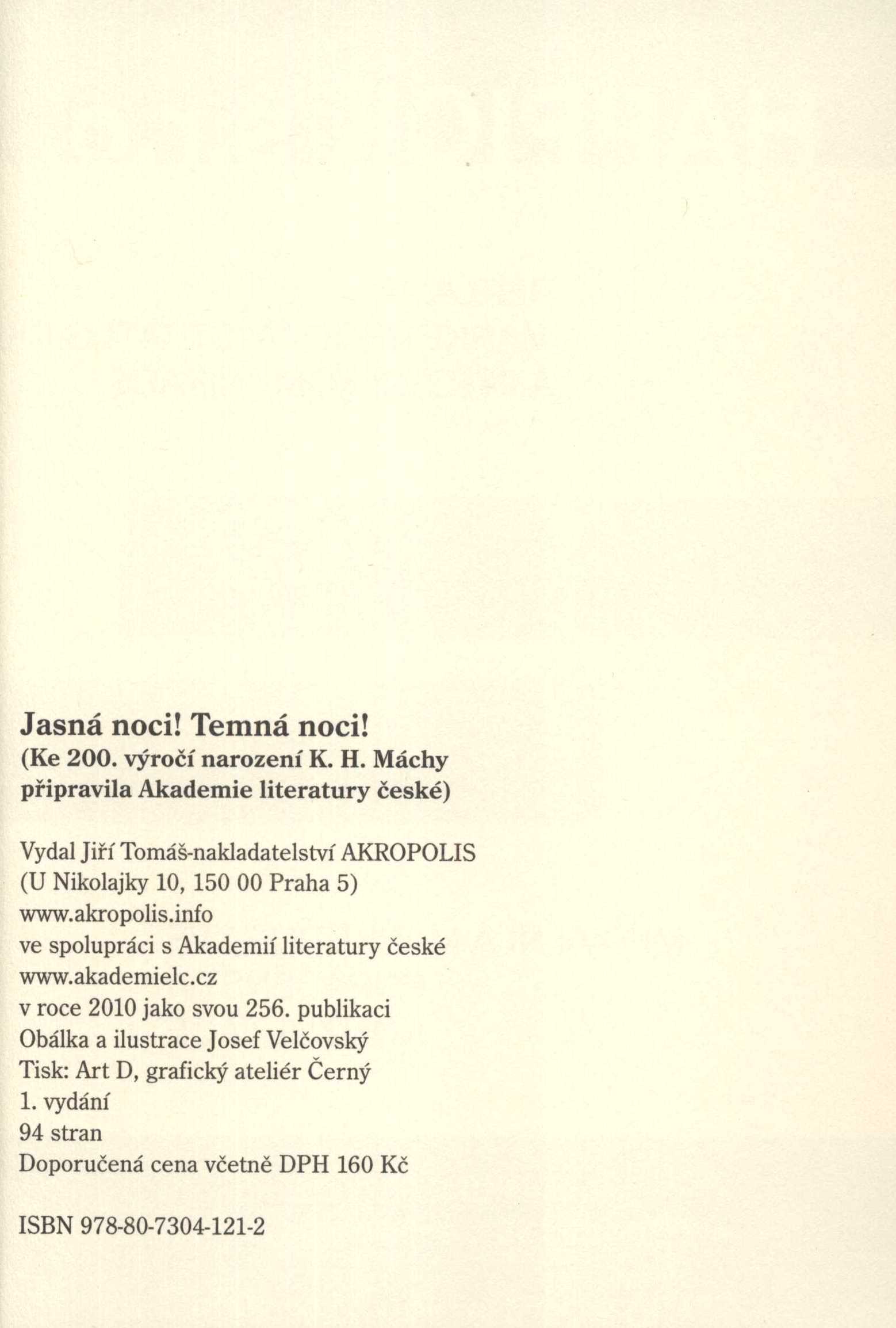Title information Jasná noci! Temná noci! : ke 200. výročí narození básníka Karla Hynka Máchy / připravila Akademie literatury české ; obálka a ilustrace Josef Velčovský Main entry-corp. Akademie literatury české (Author) Další autoři Velčovský, Josef, 1945- (Bookjacket designer) (Illustrator) Vašák, Pavel, 1941-2011 (Author of introduction) Corporation Akropolis - Jiří Tomáš (nakladatelství) (Publisher) ART D - Grafický atelier Černý (Printer) Edition statement 1. vydání Publication Praha : Akropolis, 2010 Manufacture Art D, grafický ateliér Černý Scope 89 stran : ilustrace ; 20 cm ISBN 978-80-7304-121-2 (brožováno) Country Czech Republic Language Czech Note Modrá obálka s ilustrací, s dvoubarevným textem a s nakladatelskou značkou. - Černá přídeští a předsádky. - Nakladatelská značka na vakátě. - Frontispis. - Abecední seznam autorů. - Úvod P. Vašáka. - Texty, básně. - Černobílé celostránkové ilustrace. - Epilog. - Obsah. - Inzerce. - Černá zadní strana obálky s ilustrací.
