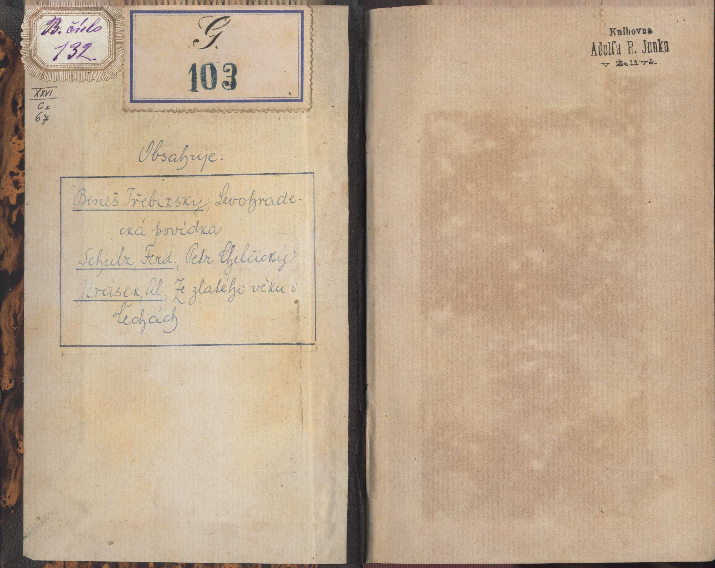 Title information Levo-hradecká povídka / od Vácslava Beneše-Třebízského Personal name Beneš Třebízský, Václav, 1849-1884 (Author) Další autoři Junek, Adolf R. (Former owner) Corporation Matice lidu. Spolek pro vydávání laciných knih českých (Praha) (Publisher) Dr. Ed. Grégr (nakladatelství, tiskárna) (Printer) Publication V Praze : Nákladem spolku pro vydávání laciných knih českých, 1882 Manufacture (Tiskem dra. Edvarda Grégra) Scope 122 s. ISBN (váz.) Edition Matice lidu. ročník 16. č. 1 (běžné číslo 91.)