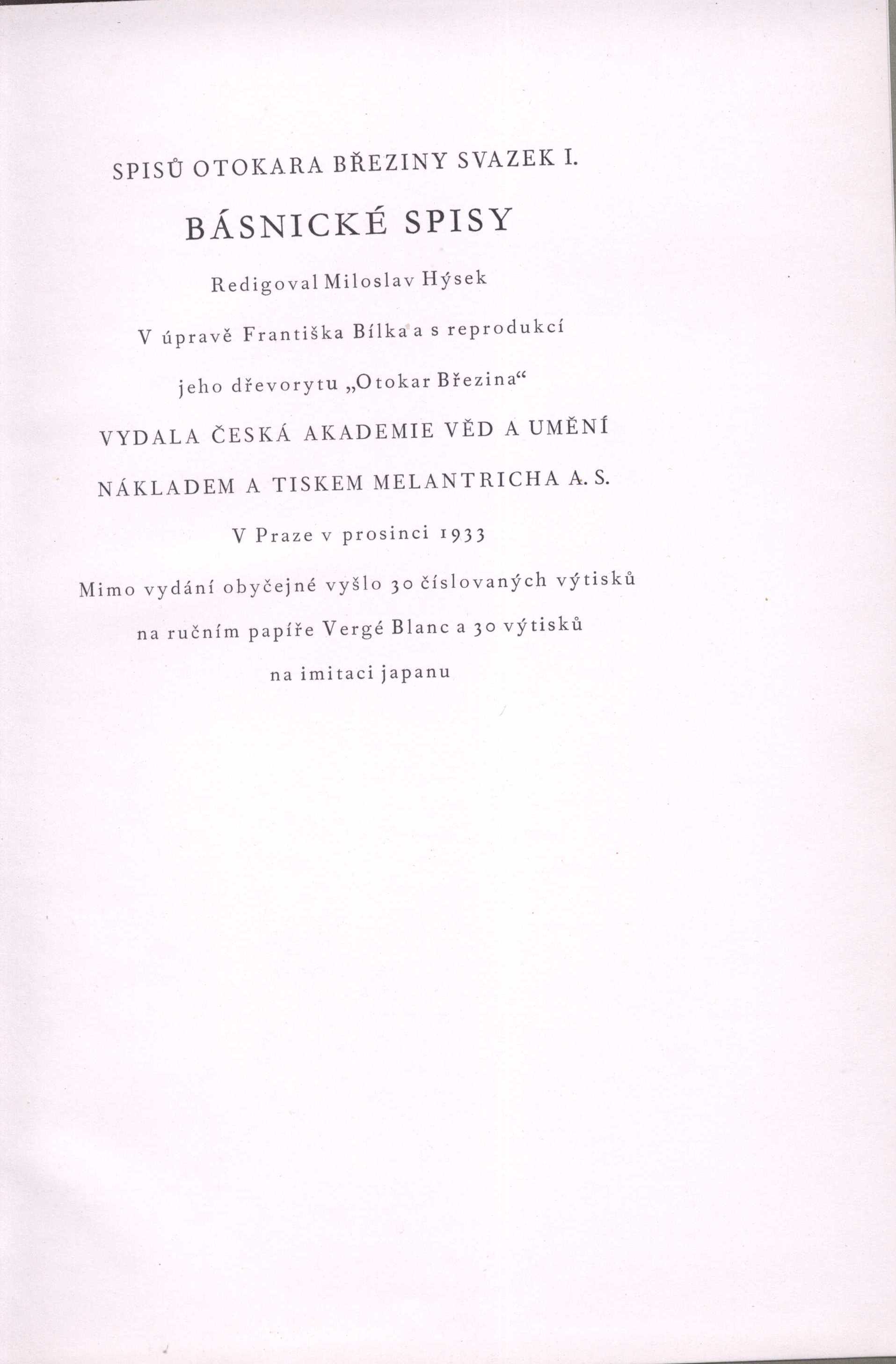 Zdobená obálka. - Frontispis s portrétem O. Březiny. - Dvoubarevný titulní list. - Faksimile Březinova rukopisu. - Poznámky
