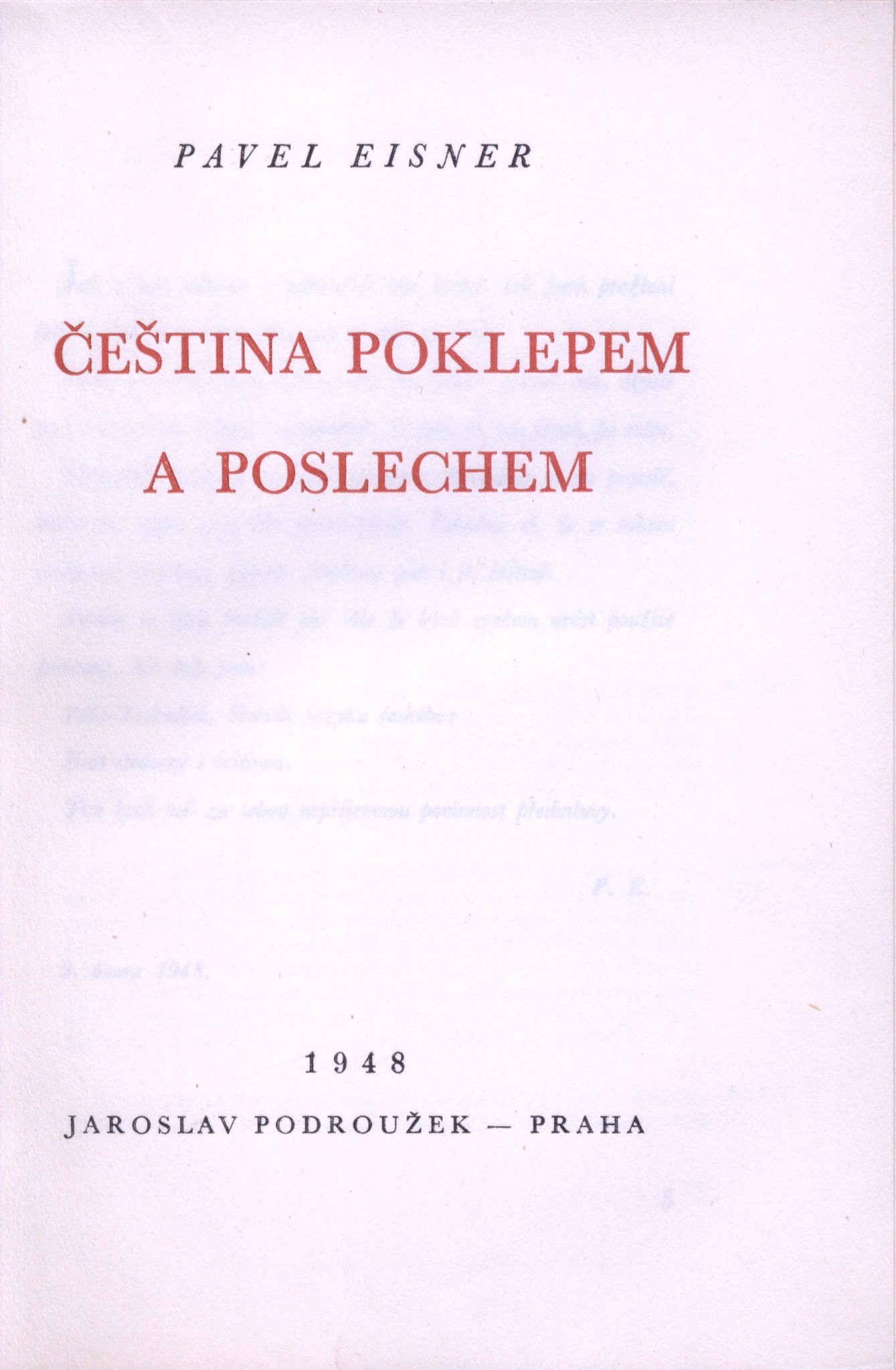 Title information Čeština poklepem a poslechem / Pavel Eisner ; [obálku a vazbu navrhl Jaroslav Šváb] Personal name Eisner, Pavel, 1889-1958 (Author) Další autoři Šváb, Jaroslav, 1906-1999 (Bookjacket designer) (Binding designer) Corporation Jaroslav Podroužek (nakladatelství) (Publisher) Cíl (tiskárna v Praze) (Printer) Edition statement První vydání Publication Praha : Jaroslav Podroužek, 1948 Manufacture knihtiskárna Cíl) Scope 369, [3] s. ; 17,7 cm ISBN brož. Country -cs Language Czech Note Barevná typografická obálka. - Na přední záložce poznámka o knize. - Dvoubarevný titulní list. - Úvodní slovo. - Abecedně pojmy. - Tiráž se značkou nakladatele. - Na zadní záložce nakladatelské upoutávky.