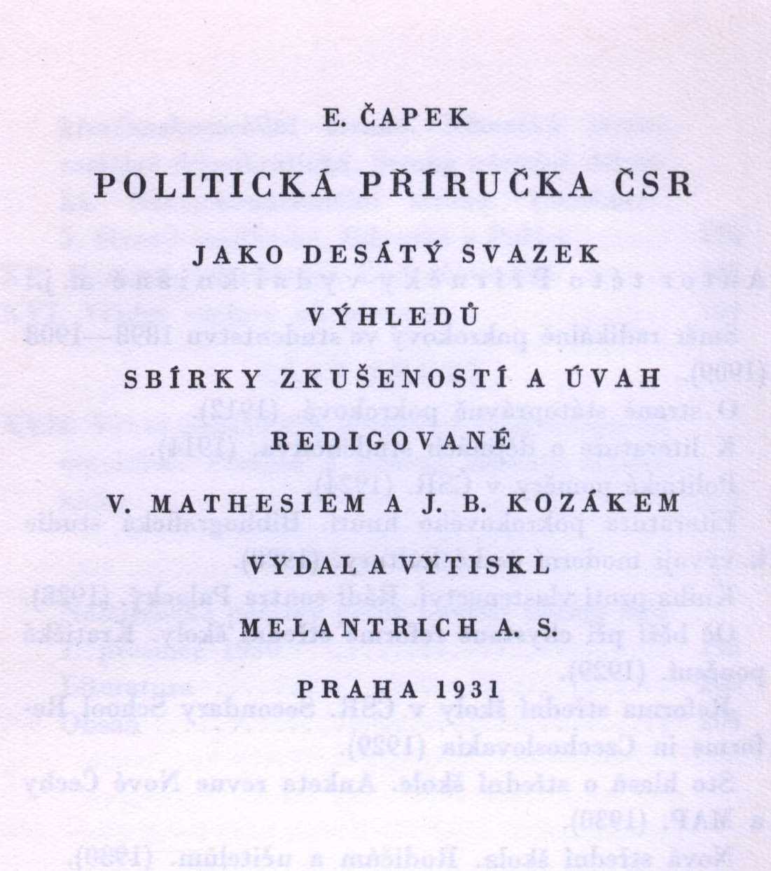 Title information Politická příručka ČSR : sociologická studie / E. Čapek Personal name Čapek, Emil, 1880-1960 (Author) Další autoři Mathesius, Vilém (Other) Kozák, J. B. (Other) Čapek, E. (Author) Corporation Melantrich (nakladatelství) (Publisher) Publication V Praze : Melantrich, 1931 Scope 205 s. ISBN (váz.) Edition Výhledy knihy zkušeností a úvah sv. 10