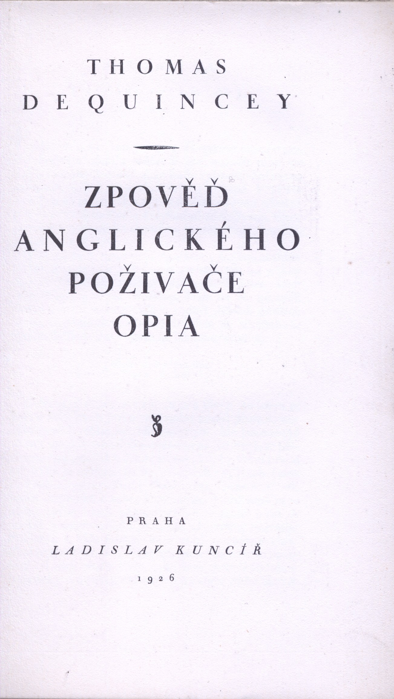 Tiráž: "Thomas De Quincey Zpověď anglického poživače opia. Přeložil Jaroslav Skalický, upravil A. Vyskočil, vytiskl Frant. Obzina ve Vyškově na Moravě. Vydala nakladatelská společnost s r. o. Rozmach v Praze II. Voršilská ul. č. 3 A. D. 1926."
