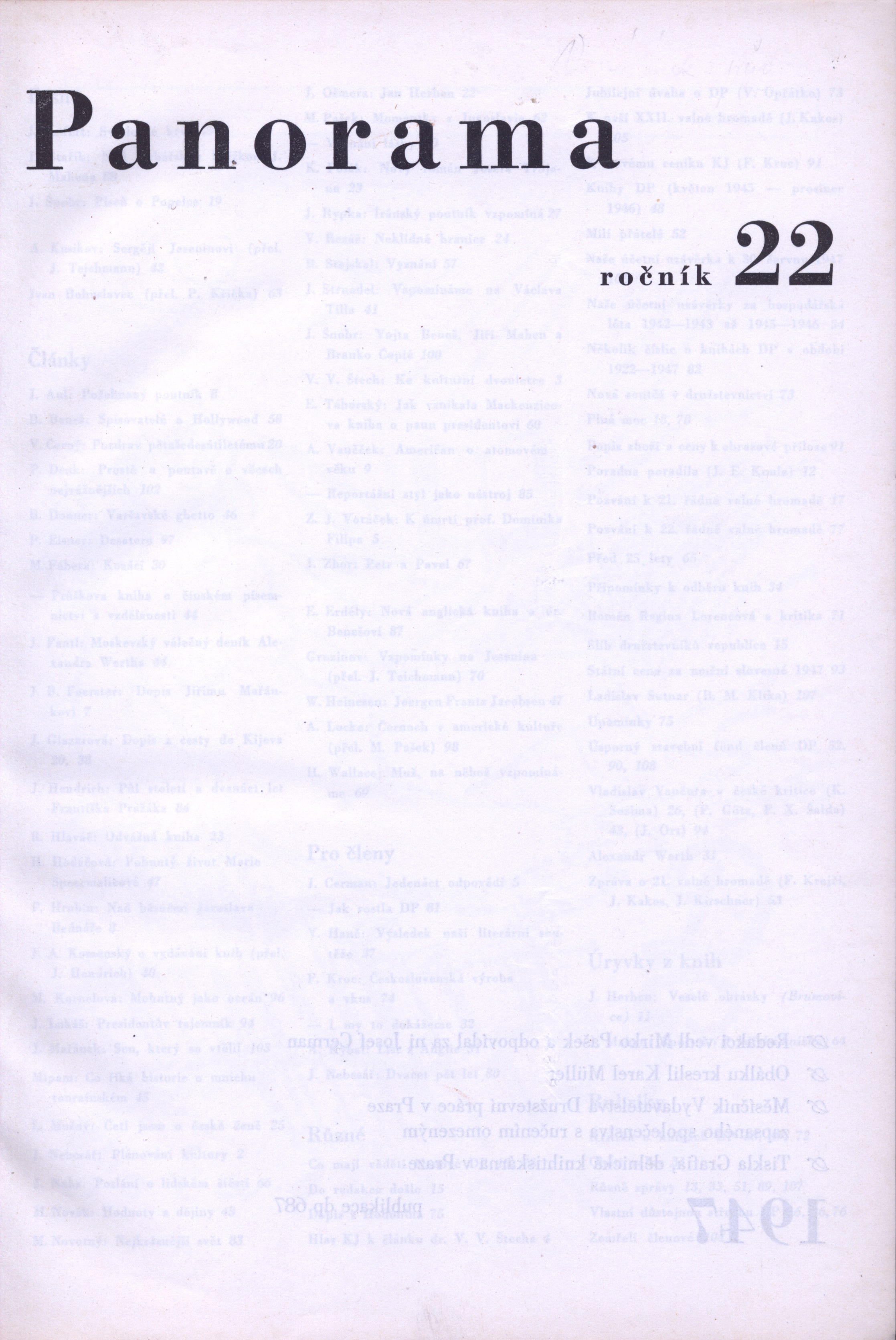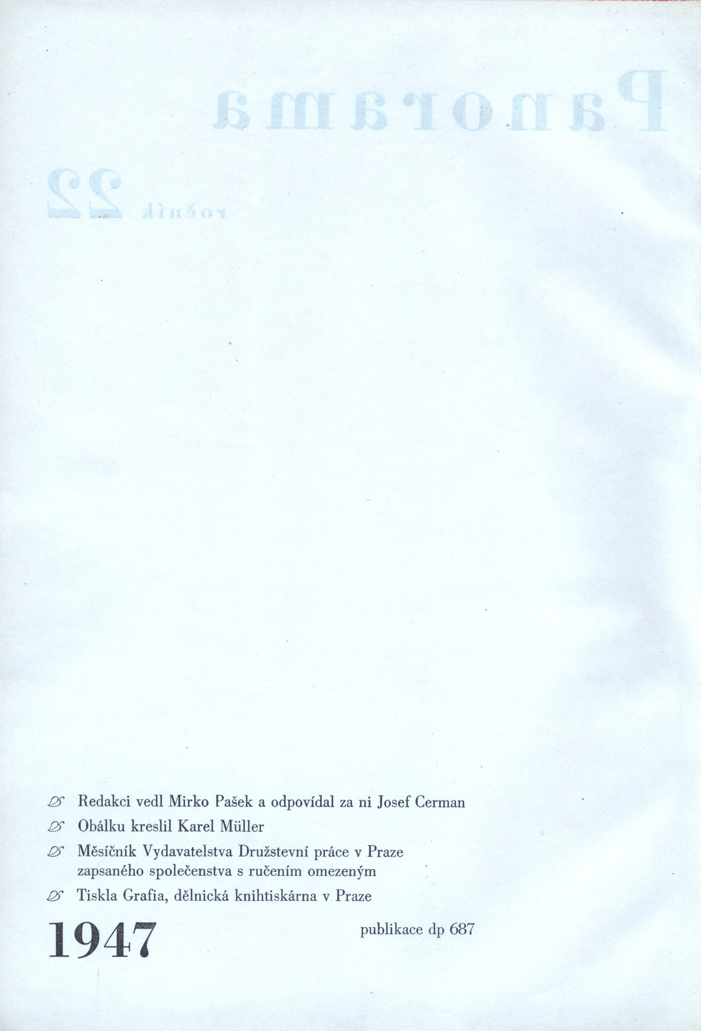 Title information Panorama : literární měsíčník Další autoři Pašek, Mirko, 1910-2002 (Editor) Cerman, Josef, -1949 (Editor) Müller, Karel, 1899-1977 (Bookjacket designer) Corporation Družstevní práce (nakladatelství) (pbl (nakladatelství)) "Grafia", dělnická knihtiskárna (tiskárna, nakladatelství) (prt (Praha)) Roč., číslo ročník 22, číslo 1-11, 1947 Publication V Praze : Vydavatelstvo Družstevní práce, 1947 Scope 108 stran : ilustrace Country Czech Republic Language Czech Note Identická zdobená obálka v různých barevných provedeních (Karel Müller). - Ilustrováno černobílými ilustracemi, reprodukcemi a fotografiemi.