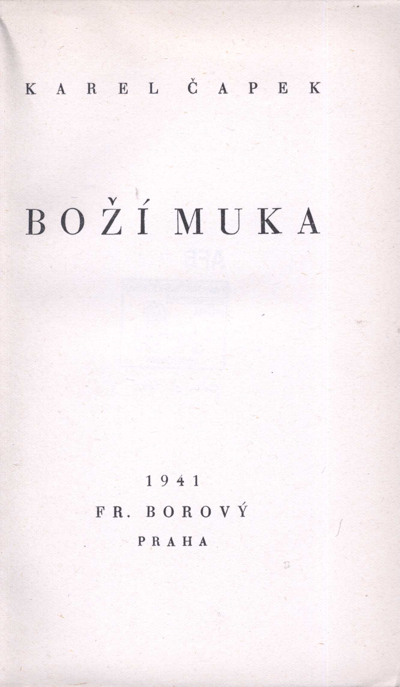Title information Boží muka : kniha novel / Karel Čapek Personal name Čapek, Karel, 1890-1938 (Author) Další autoři Fr. Borový (firma) (Publisher) Akciová moravská knihtiskárna Polygrafie (Printer) Publication Praha : Fr. Borový, 1941 Manufacture Akciová mor. knihtiskárna Polygrafie) Scope 149 s. ; 20 cm ISBN brož. Edition Spisy bratří Čapků sv. 3