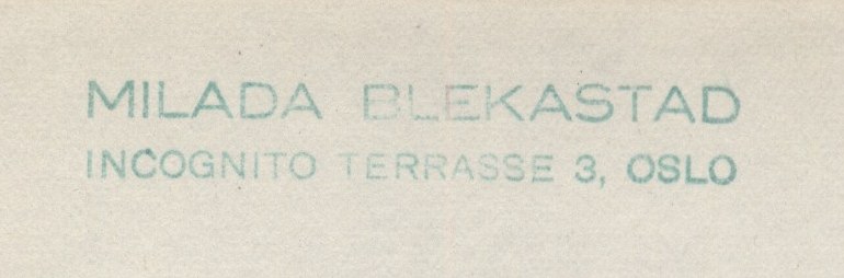 U sign. Topič 0083 razítko (zeleně): "Milada Blekastad, Incognito Terrasse 3, Oslo"