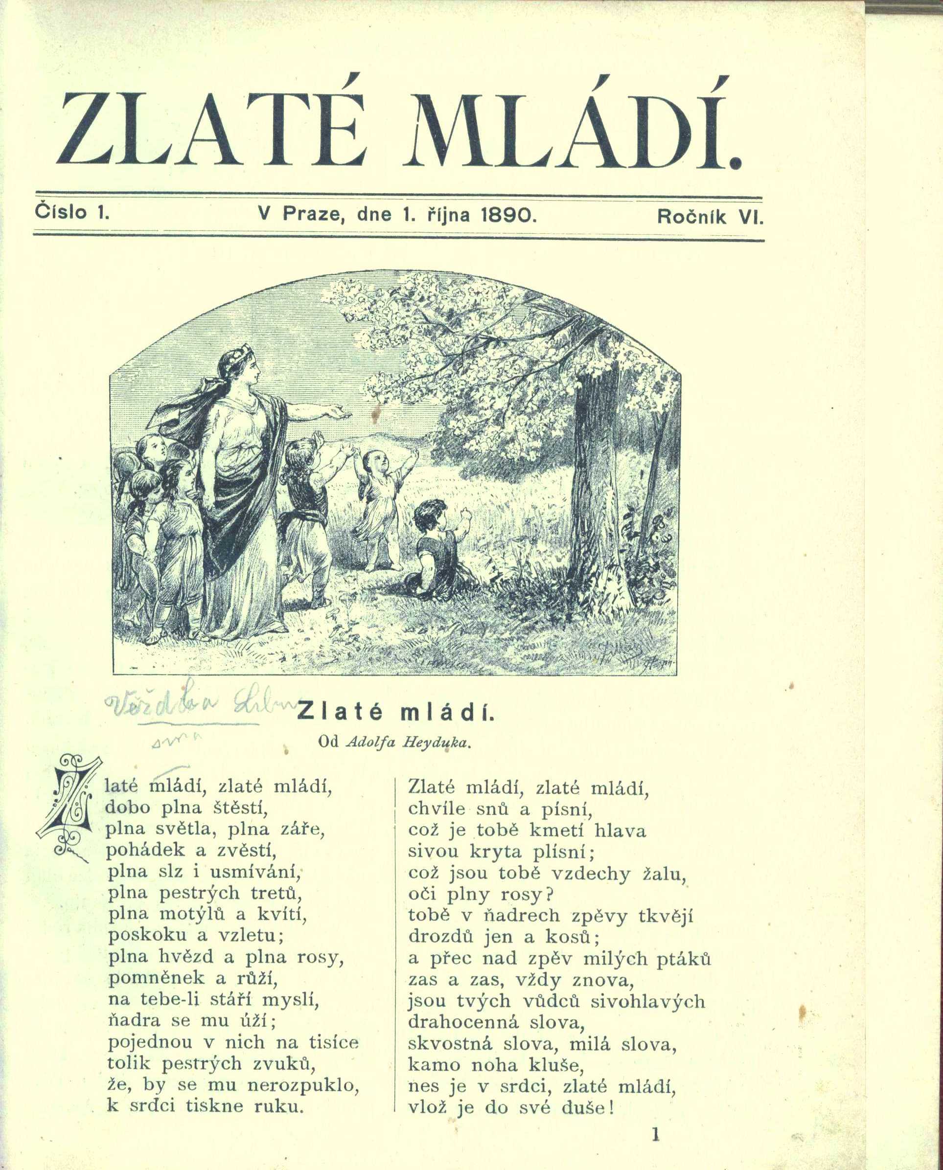 Title information Zlaté mládí : obrázkový časopis pro naši mládež Další autoři Mojžíš, Antonín, 1856-1927 (Editor) Marhan, Michael, 1851-1928 (Editor) Corporation F. Šimáček (nakladatelství, tiskárna) (Publisher) Roč., číslo ročník 6, číslo 1-10, 1890/1891 Publication Praha : F. Šimáček, 1890-1891 Scope il. Country Czech Republic Language Czech Note Čb. ilustrace, k jednotlivým číslům zvláštní přílohy s čb. dvoustránkovými ilustracemi, k č. 3 příloha formátu A3.