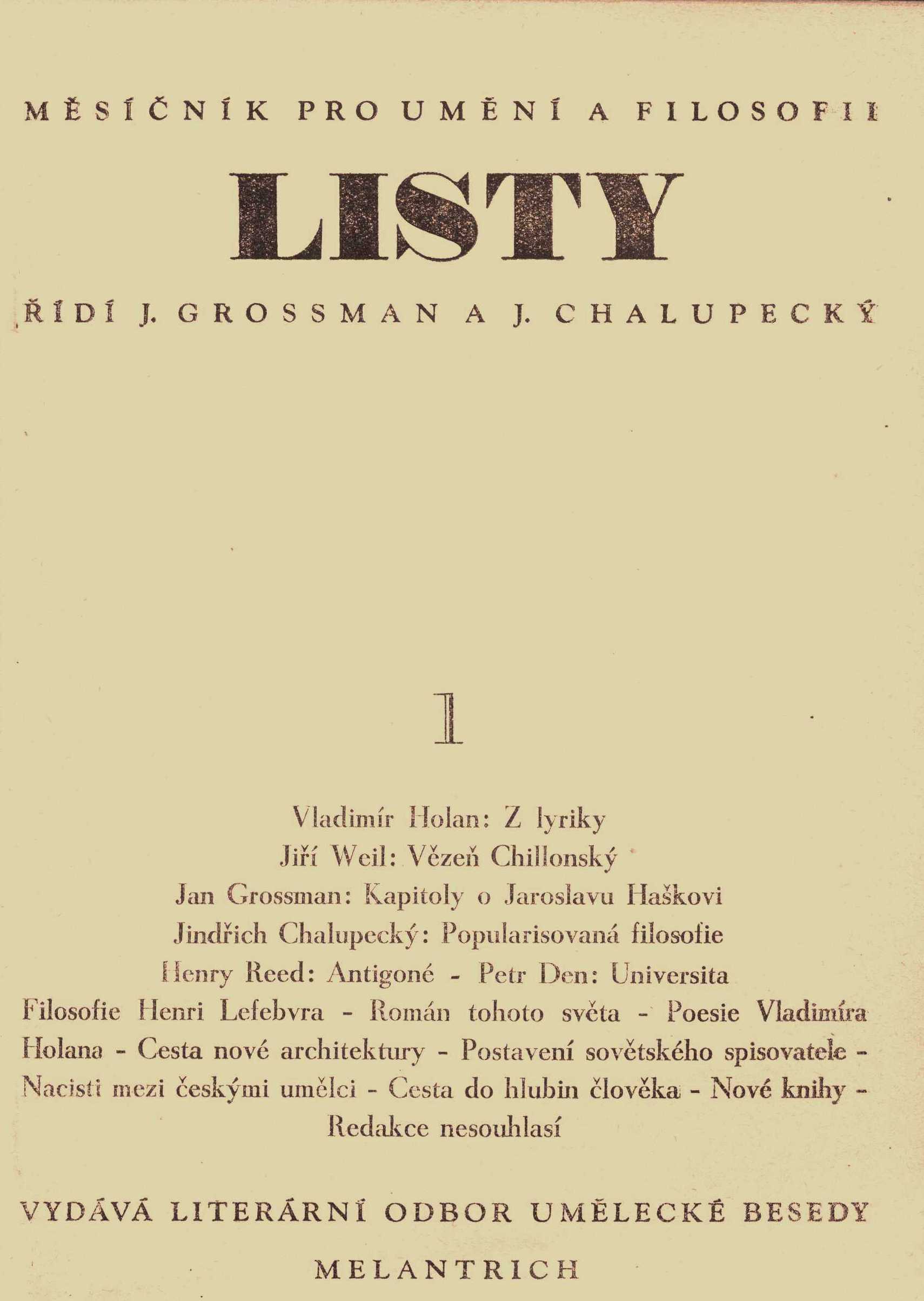 Title information Listy : měsíčník pro umění a filosofii Další autoři Chalupecký, Jindřich, 1910-1990 (Editor) Grossman, Jan, 1925-1993 (Editor) Kotrba, Václav, nejml. (Printer) Corporation Melantrich (nakladatelství) Literární odbor Umělecké besedy (Publisher) Roč., číslo Ročník 2, číslo 1-2, 1948 Publication Praha : Melantrich, 1948 Manufacture V. Kotrba Scope ilustrace ; 21 cm Country Czech Republic Language Czech Note Čb. reprodukce.
