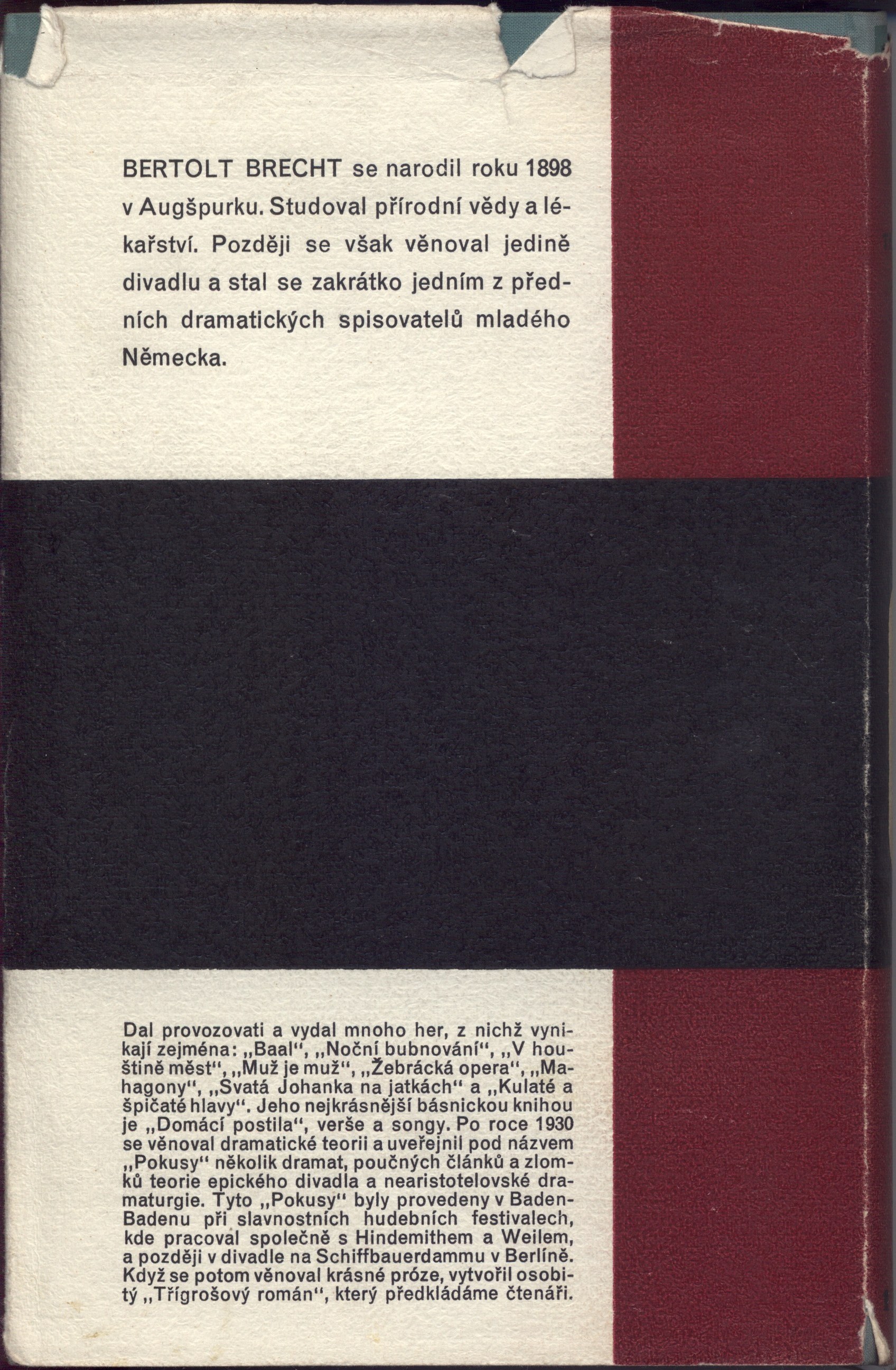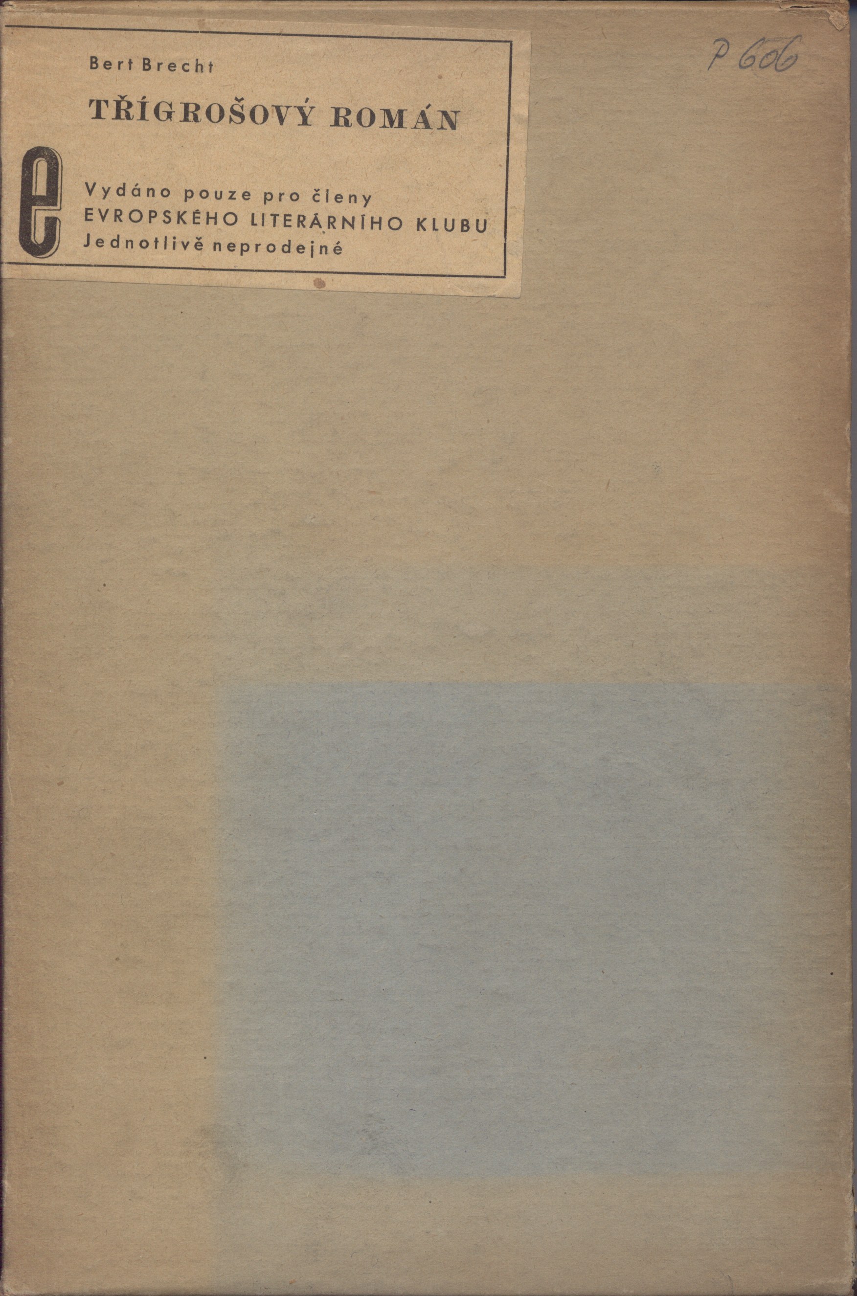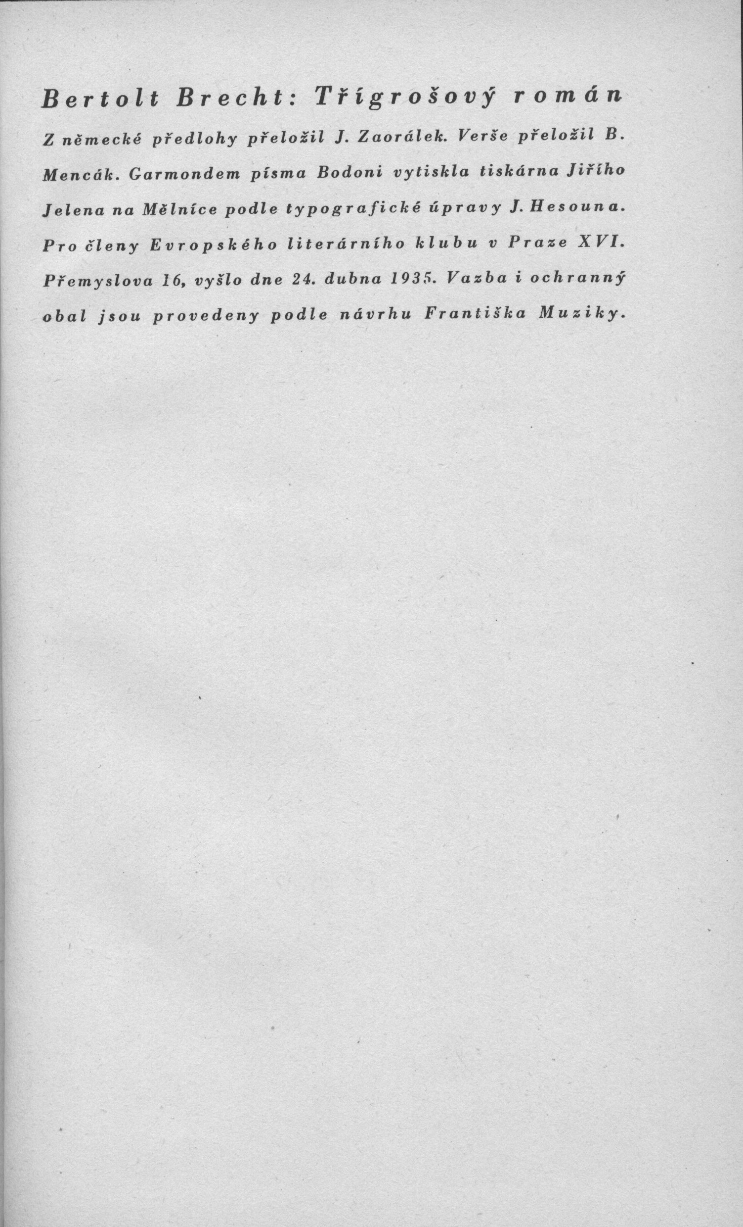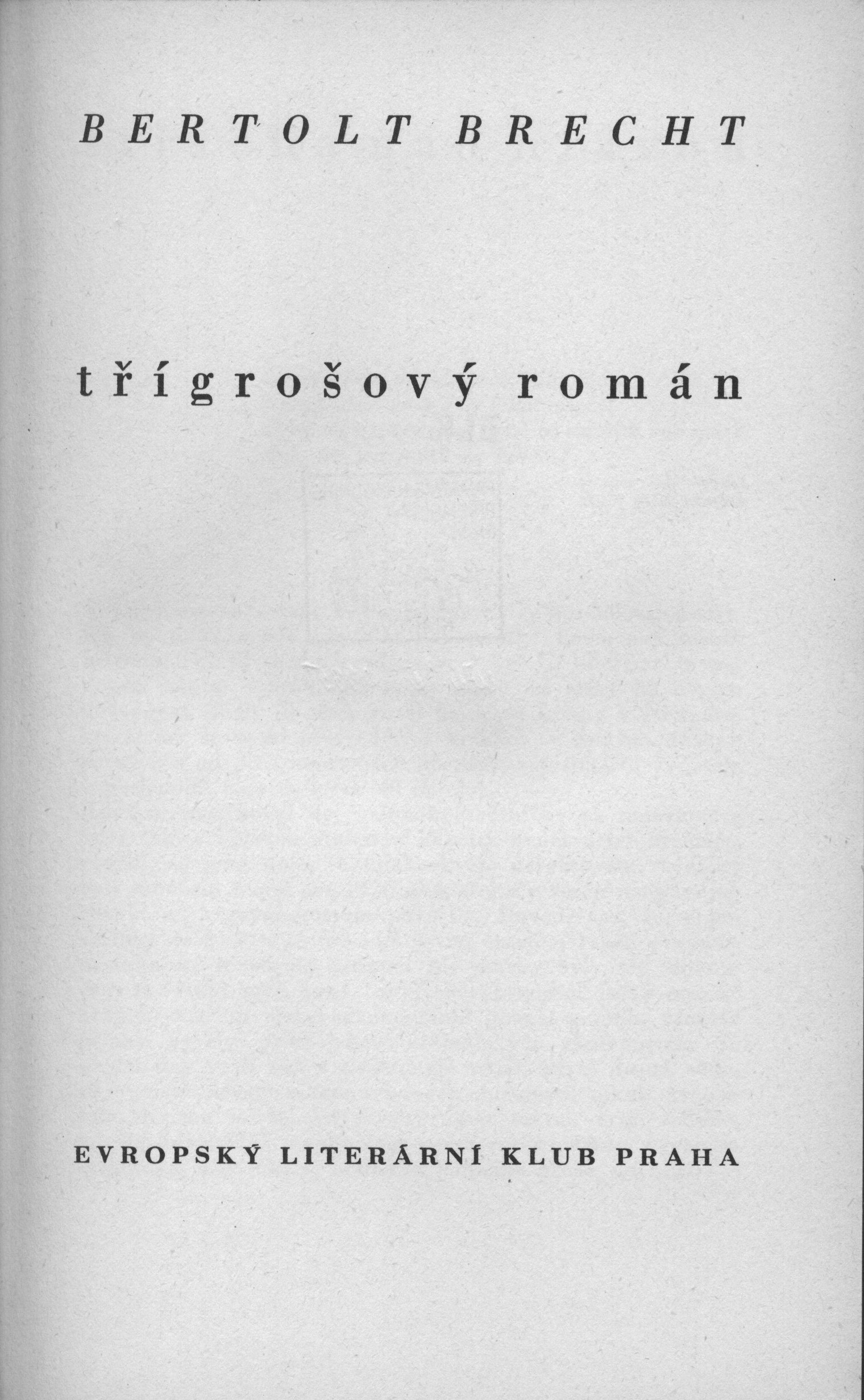 Title information Třígrošový román / Bertolt Brecht ; [z německé předlohy přeložil J. Zaorálek ; verše přeložil B. Mencák ; podle typografické úpravy J. Hesouna ; vazba i ochranný obal jsou provedeny podle návrhu Františka Muziky] Personal name Brecht, Bertolt, 1898-1956 (Author) Další autoři Zaorálek, Jaroslav, 1896-1947 (Translator) Mencák, Břetislav, 1903-1981 (Translator) Hesoun, Josef, 1903-1965 (Typographer) Muzika, František, 1900-1974 (Bookjacket designer) Corporation Evropský literární klub (nakladatelství) (Publisher) Jiří Jelen (tiskárna) (Printer) Publication Praha : Evropský literární klub, 1935 Manufacture tiskárna Jiřího Jelena) Scope 345 s. ; 22 cm ISBN (váz.) Country Czech Republic Language Czech Note Zdobená obálka. - Vazba s ražbou. - Na přední záložce upoutávka na knihu. - Černé předsádky. - Nakladatelská značka. - Patitul. - Titulní list. - Výslovnost anglických jmen a slov. - Obsah. - Tiráž. - Na zadní straně obálky poznámka o autorovi.