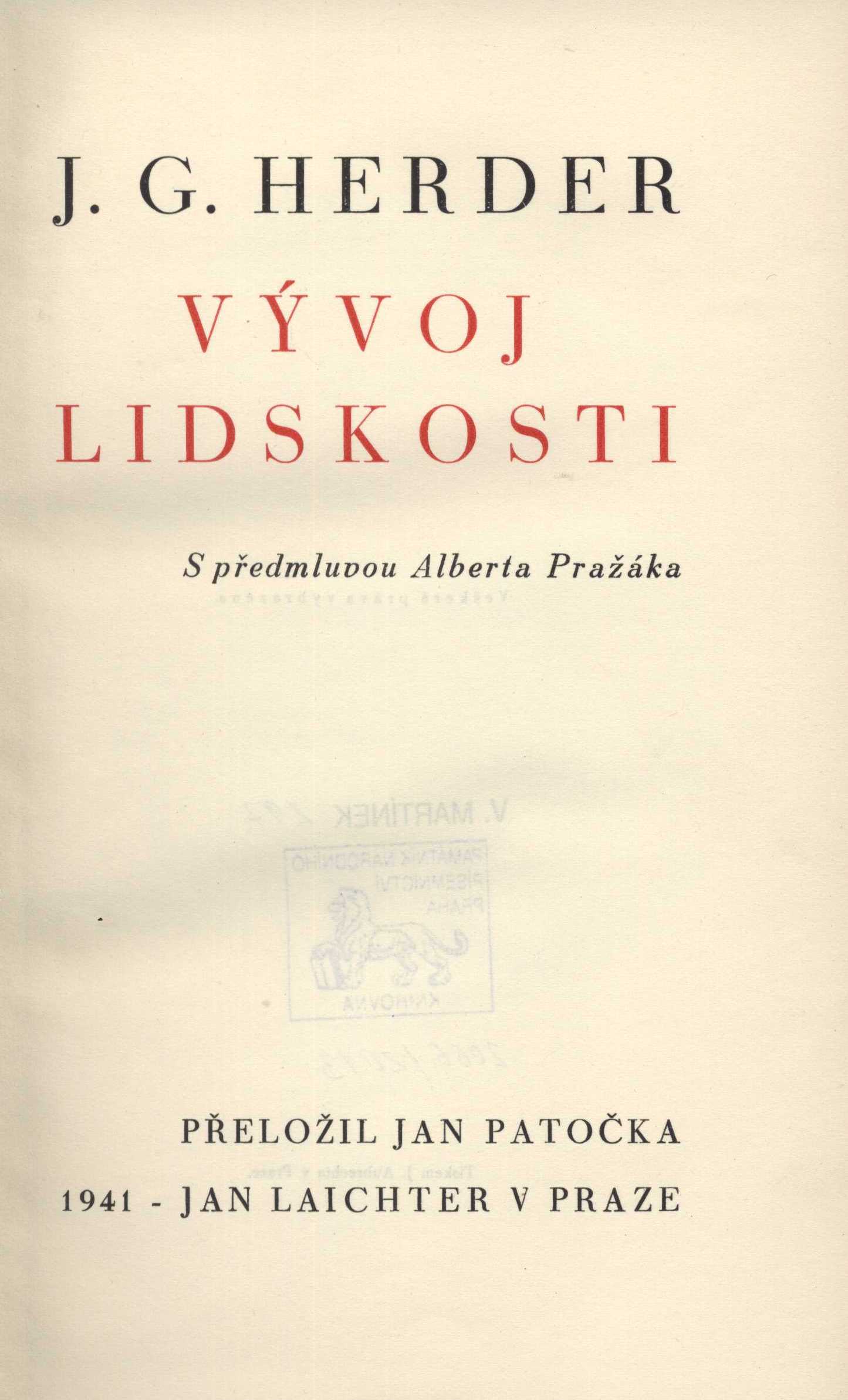 Title information Vývoj lidskosti / J.G. Herder ; s předmluvou Alberta Pražáka ; přeložil Jan Patočka Personal name Herder, Johann Gottfried von, 1744-1803 (Author) Další autoři Pražák, Albert, 1880-1956 (Author of introduction) Patočka, Jan, 1907-1977 (Translator) Corporation Jan Laichter (nakladatelství) (Publisher) Jan Aubrecht (tiskárna) (Printer) Publication V Praze : Jan Laichter, 1941 Manufacture (Tiskem J. Aubrechta) Scope xxxiii, 469 s. ISBN (Vázáno) Edition Laichterova filosofická knihovna sv. 26