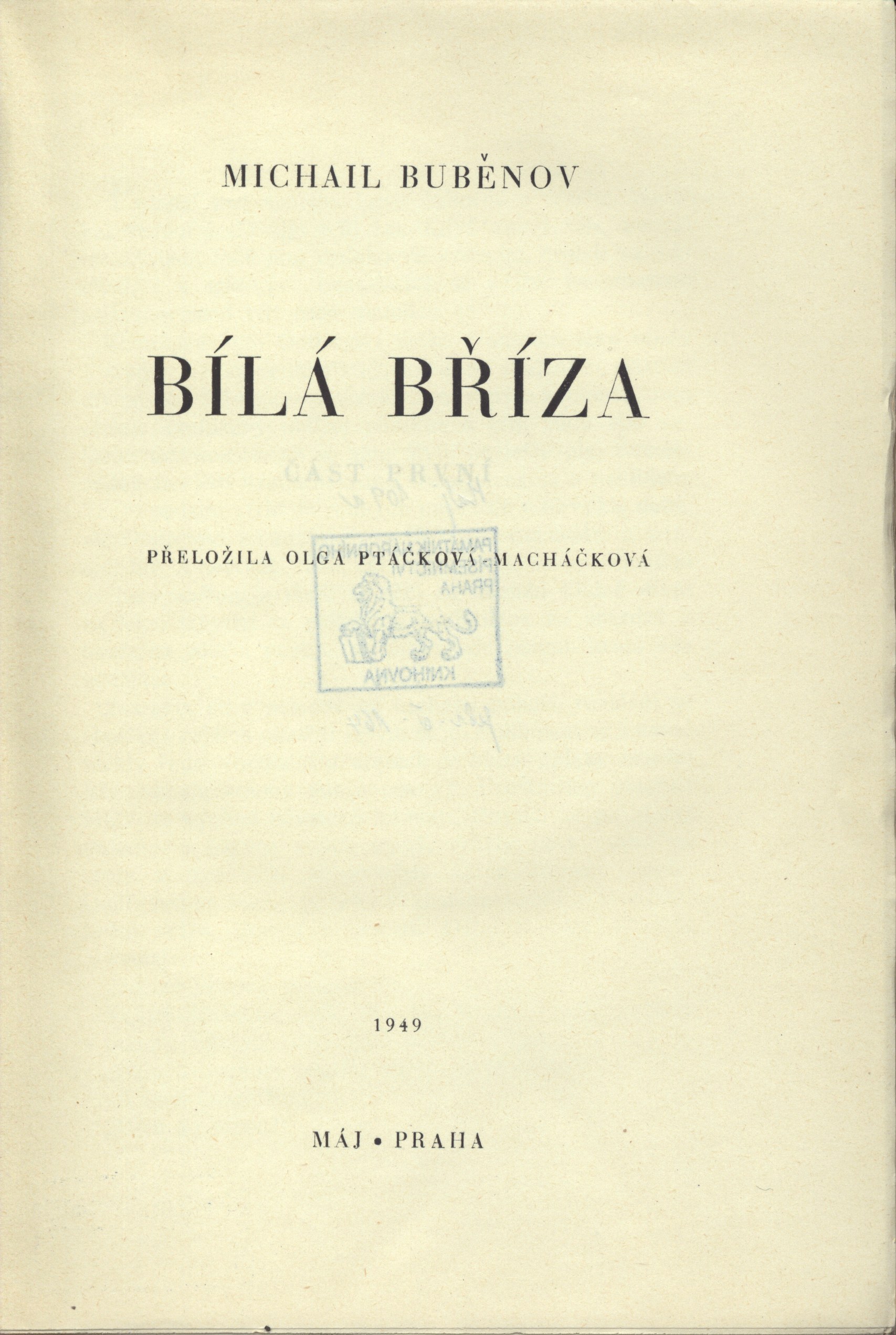 Title information Bílá bříza / Michail Buběnov [sic!] ; přeložila Olga Ptáčková-Macháčková ; [jazykovou korekturu provedl Karel Málek ; s obálkou Josefa Říhy] Personal name Bubennov, Michail Semenovič, 1909-1983 (Author) Další autoři Ptáčková-Macháčková, Olga, 1906-1992 (Translator) Říha, Josef, 1920-1994 (Bookjacket designer) Corporation Máj (nakladatelství) (Publisher) Svoboda (Liberec) (Printer) Publication V Praze : Máj, 1949 Manufacture tiskárna Svoboda) Scope 359 s. ; 22 cm ISBN brož. Edition Knihovna slovanské družby svazek 12