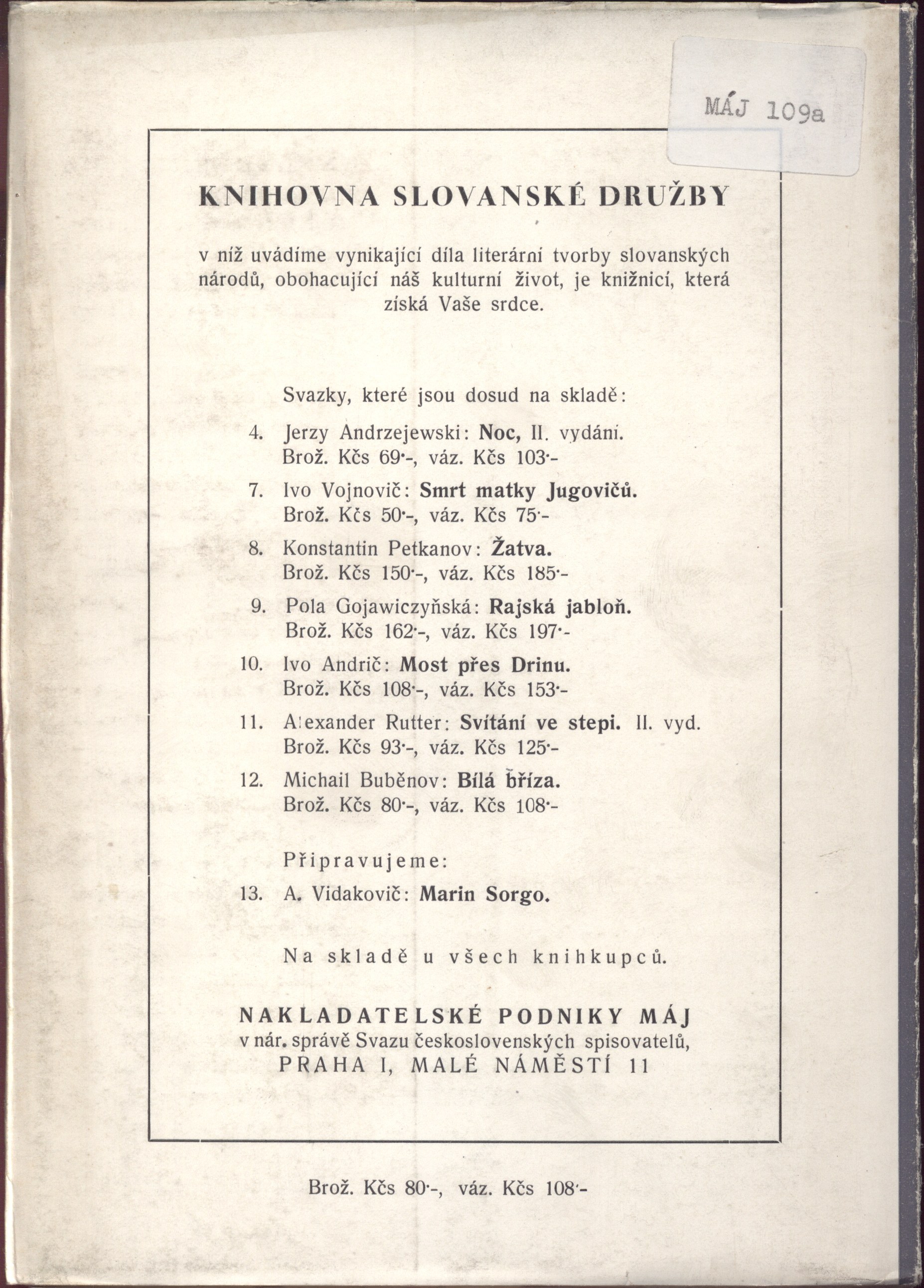 Knihovna slovanské družby, (Máj)Country Czech Republic Language Czech Language of the original Russian Note Zdobená obálka s ilustrací. - Na záložkách upoutávky na knihu. - Nakladatelská značka. - Patitul. - Titulní list. - Tiráž s edicí. - Na zadní straně obálky ediční upoutávky.