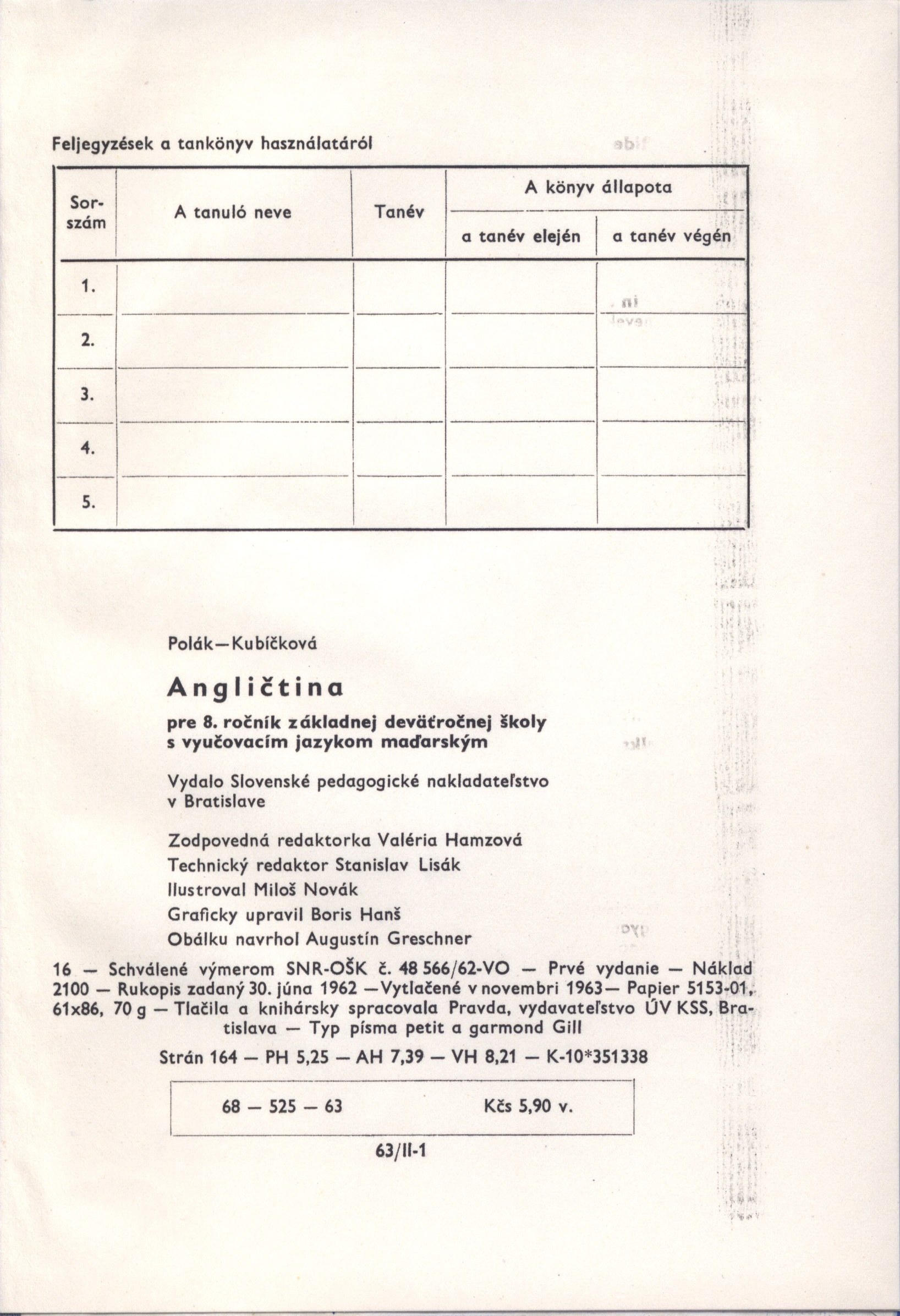 Title information Angol nyelvkönyv a kilencéves alapiskolák 8. évfolyama számára = Angličtina pre 8. ročník základnej deväťročnej školy [s vyučovacím jazykom maďarským] / Karel Polák, Julie Kubíčková ; [ilustroval Miloš Novák ; graficky upravil Boris Hanš ; obálku navrhol Augustín Greschner] Personal name Polák, Karel (Author) Další autoři Kubíčková, Julie (Author) Novák, Miloš, 1909-1988 (Illustrator) Hanš, Boris, 1912-1962 (Book designer) Greschner, Augustín (Bookjacket designer) Corporation Slovenské pedagogické nakladateľstvo (Publisher) Pravda (nakladatelství) (Printer) Edition statement Prvé vydanie Publication Bratislava : Slovenské pedagogické nakladateľstvo, 1963 Manufacture (Pravda) Scope 162 s. : il. ; 21 cm ISBN (váz.) Country Czech Republic Language Hungarian * English Language of the original Czech Note Zdobená vazba. - Patitul. - Titulní list. - Text maďarsky a anglicky. - Barevné ilustrace v textu. - Slovníčky. - Obsah. - Tiráž slovensky.
