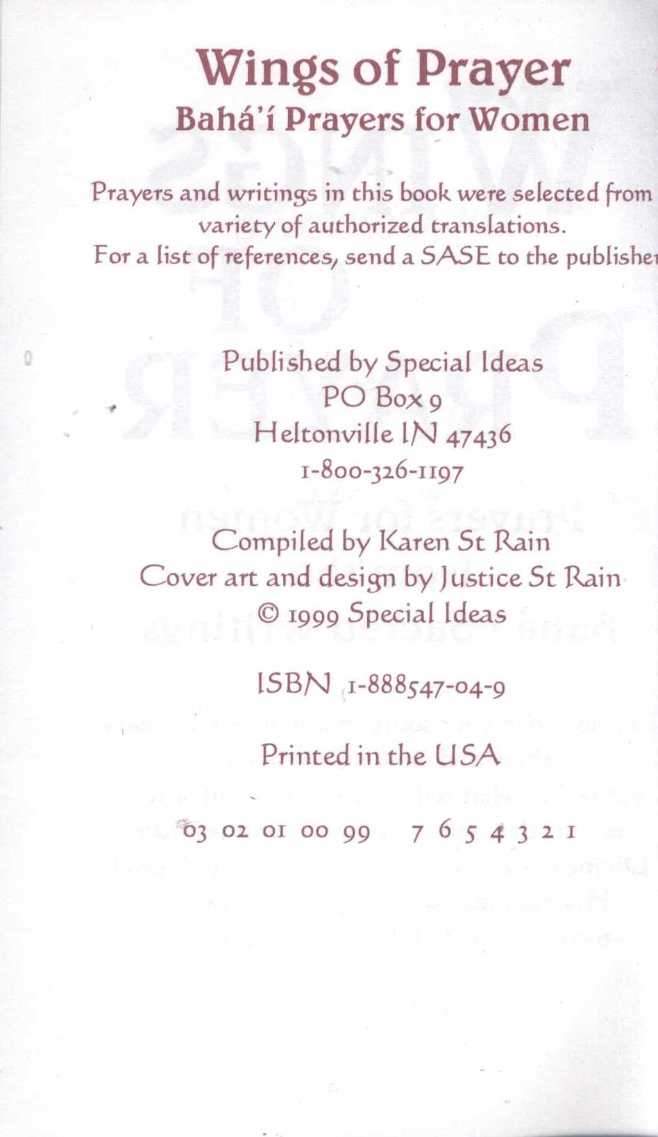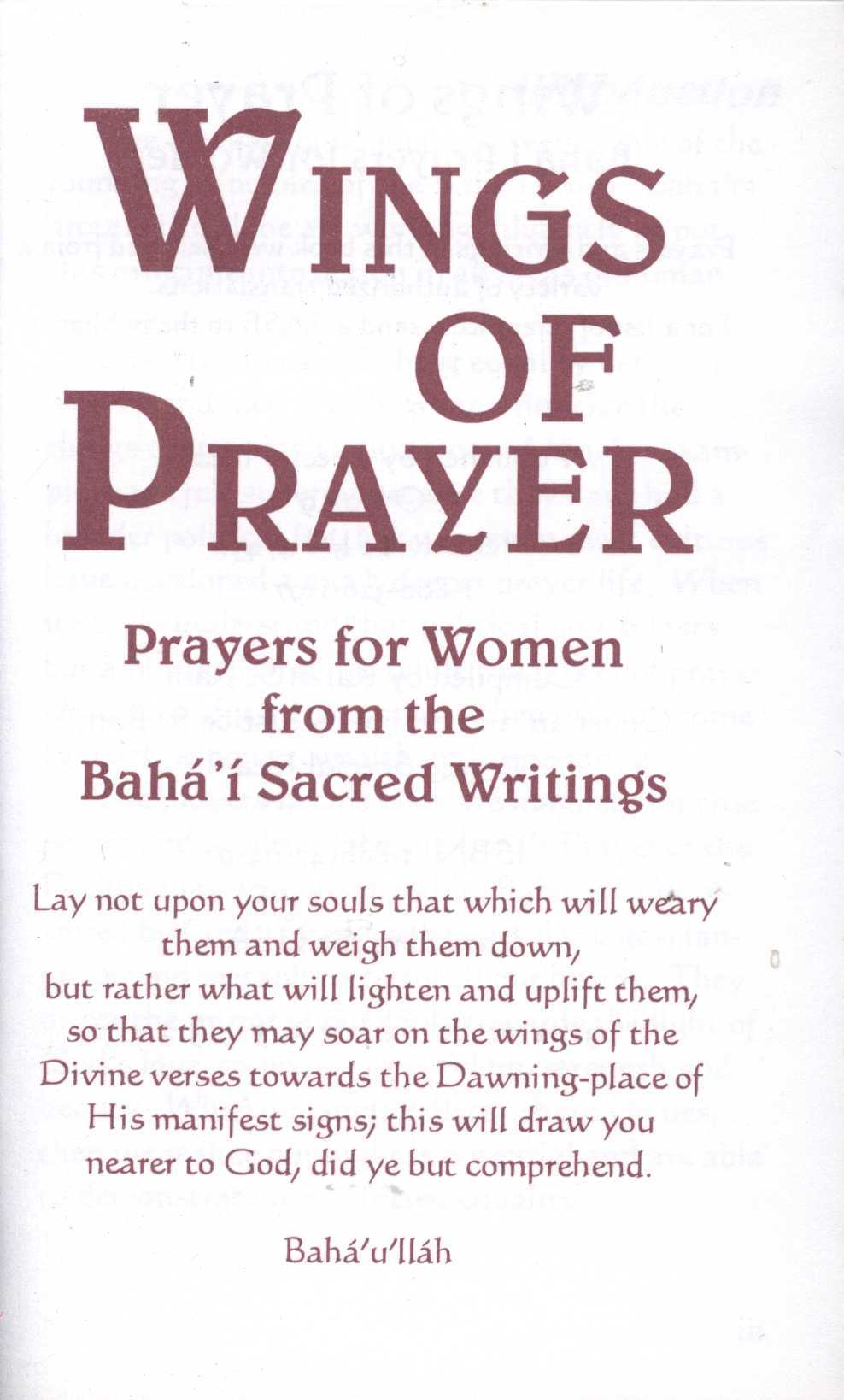 Title information Wings of Prayer : Prayers for Women from Baha'i Secred Writings Author Bahá'u'lláh, 1817-1892 (Author) Publication [S. l.] : Special Ideas, 1999 Scope iii, 41 s. ISBN 1-888547-04-9 (brož.) Country United States Language English Language of the original Persian Note Barevná obálka. - Úvod.
