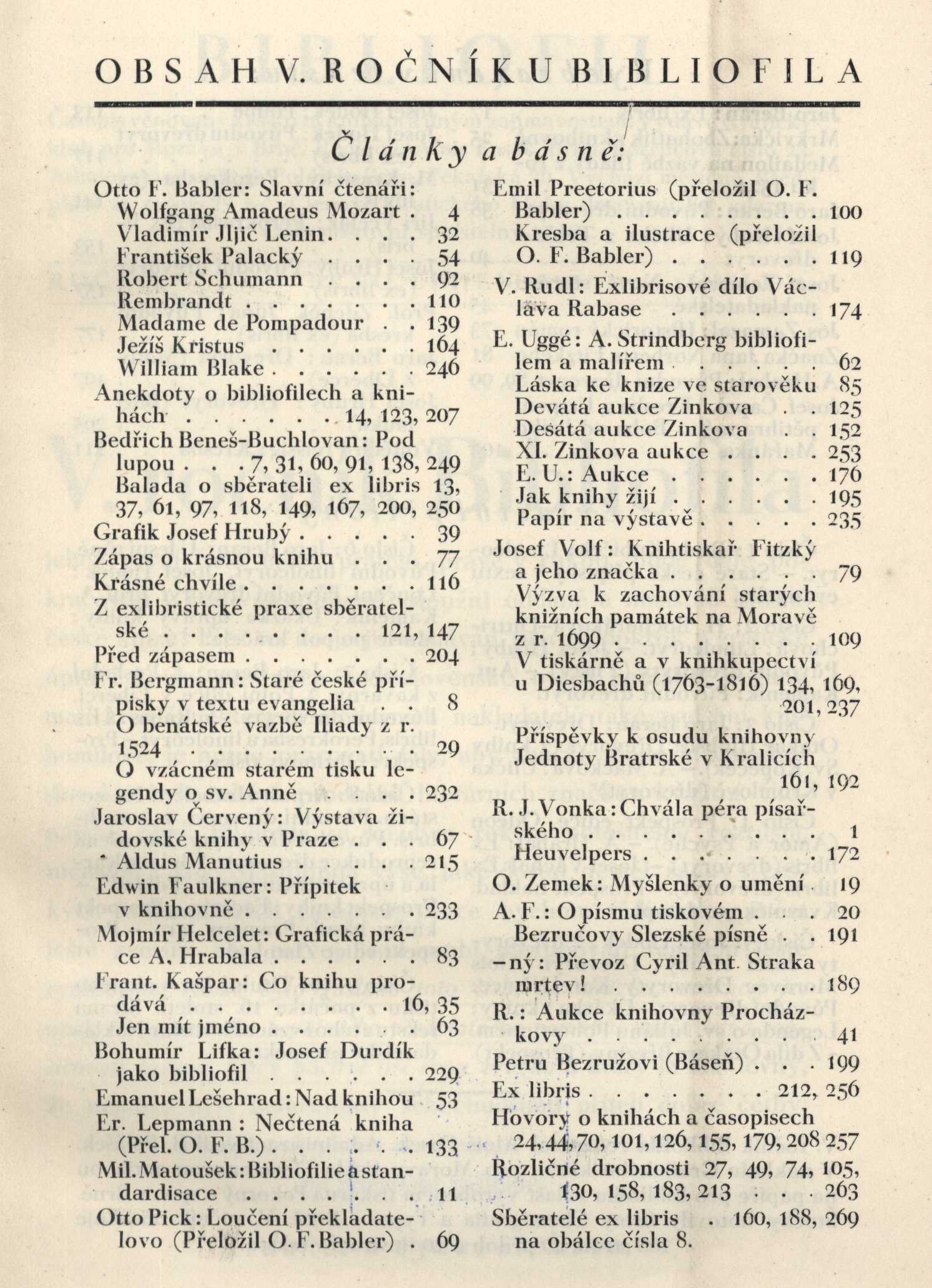 Title information Bibliofil : časopis věnovaný krásným knihám a jiným zajímavostem Další autoři Fosek, Alois, 1887-1931 (Editor) Corporation Pokorný a spol. (Brno) (prt (Brno)) Grafický klub pro Moravu (spolek) (pbl (spolek)) Roč., číslo ročník 5, číslo 1-10, 1927 Publication Brno : Nákladem Grafického klubu pro Moravu, 1927 Manufacture (Pokorný a spol.) Scope [40] obr. příl., [20] il. 268 s. Country Czech Republic Language Czech Note Na frontispisu barevný dřevoryt K. Němce. - Černobílé ilustrace na přílohách i v textu. - 1 červená zdobená iniciála. - Seznam vyobrazení v textu i na přílohách. - Občasné nakladatelské inzerce. - Seznamy sběratelů exlibris. - Obsahuje bibliografické odkazy.