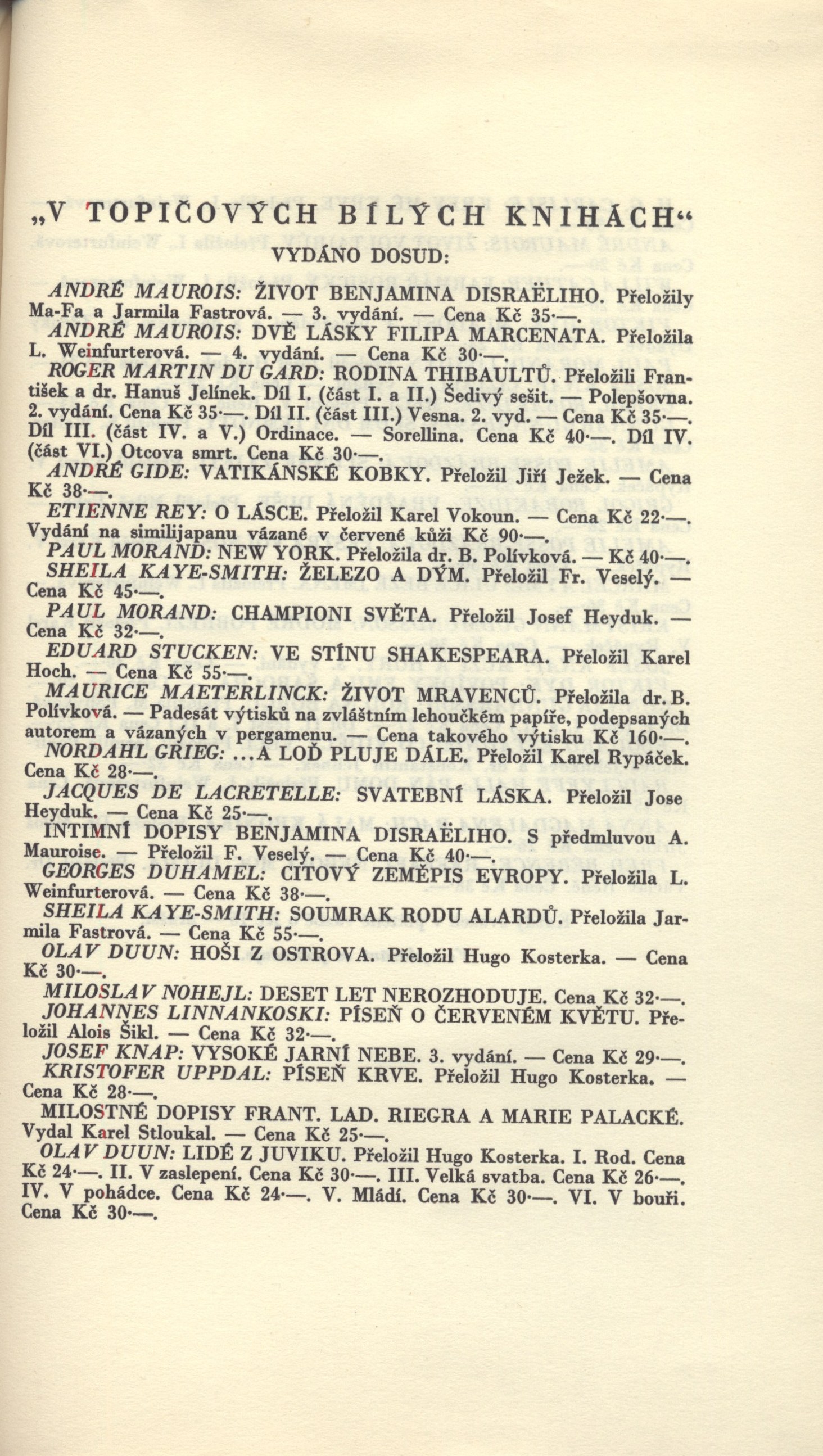 Topičovy Bílé knihy, (F. Topič)Country Czech Republic Language Czech Language of the original French Note Obálka s ilustrací. - Na záložkách upoutávky. - Dvoubarevný titulní list s ilustrací. - Vložená černobílá obrazová příloha. - Předmluva. - Bibliografie. - Obsah. - Edice nad tiráží, značka Kmene. - Seznam edice.