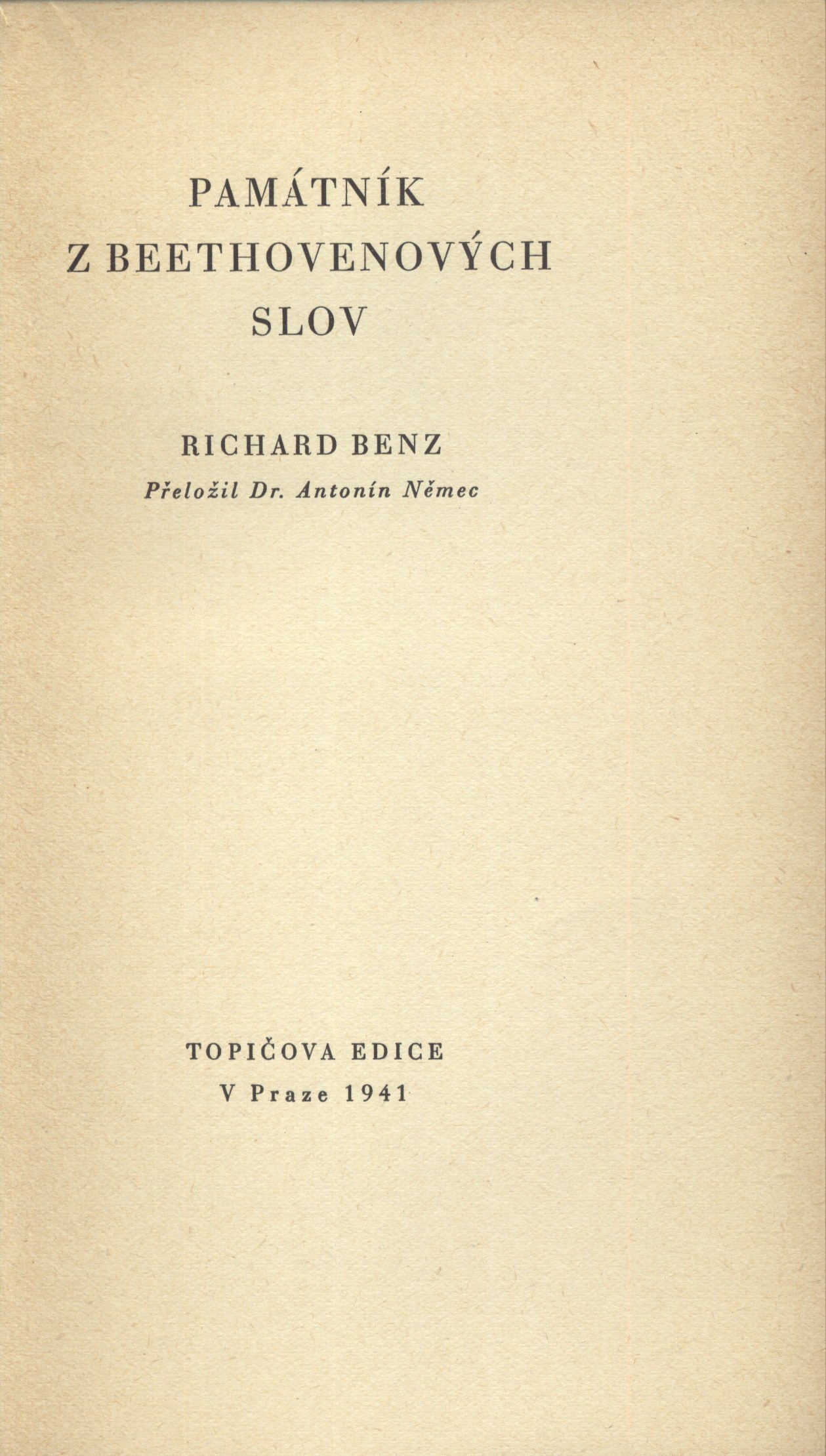 Title information Památník z Beethovenových slov / [uspořádal] Richard Benz ; [z němčiny] přeložil Antonín Němec ; obálka a grafická úprava Cyrila Boudy] Personal name Beethoven, Ludwig van, 1770-1827 (Artist) Další autoři Benz, Richard, 1884-1966 (Compiler) Němec, Antonín, 1894-1958 (Translator) Bouda, Cyril, 1901-1984 (Bookjacket designer) (Book designer) Corporation Topičova edice (nakladatelství) (Publisher) Müller a spol. (tiskárna) (Printer) Publication V Praze : Topičova edice, 1941 Manufacture knihtiskárna Müller a spol.) Scope 80 s. ; 20 cm ISBN brož. Country Czech Republic Language Czech Language of the original German Note Ilustrovaná obálka. - Titulní list. - Tiráž. - Na záložkách upoutávky.