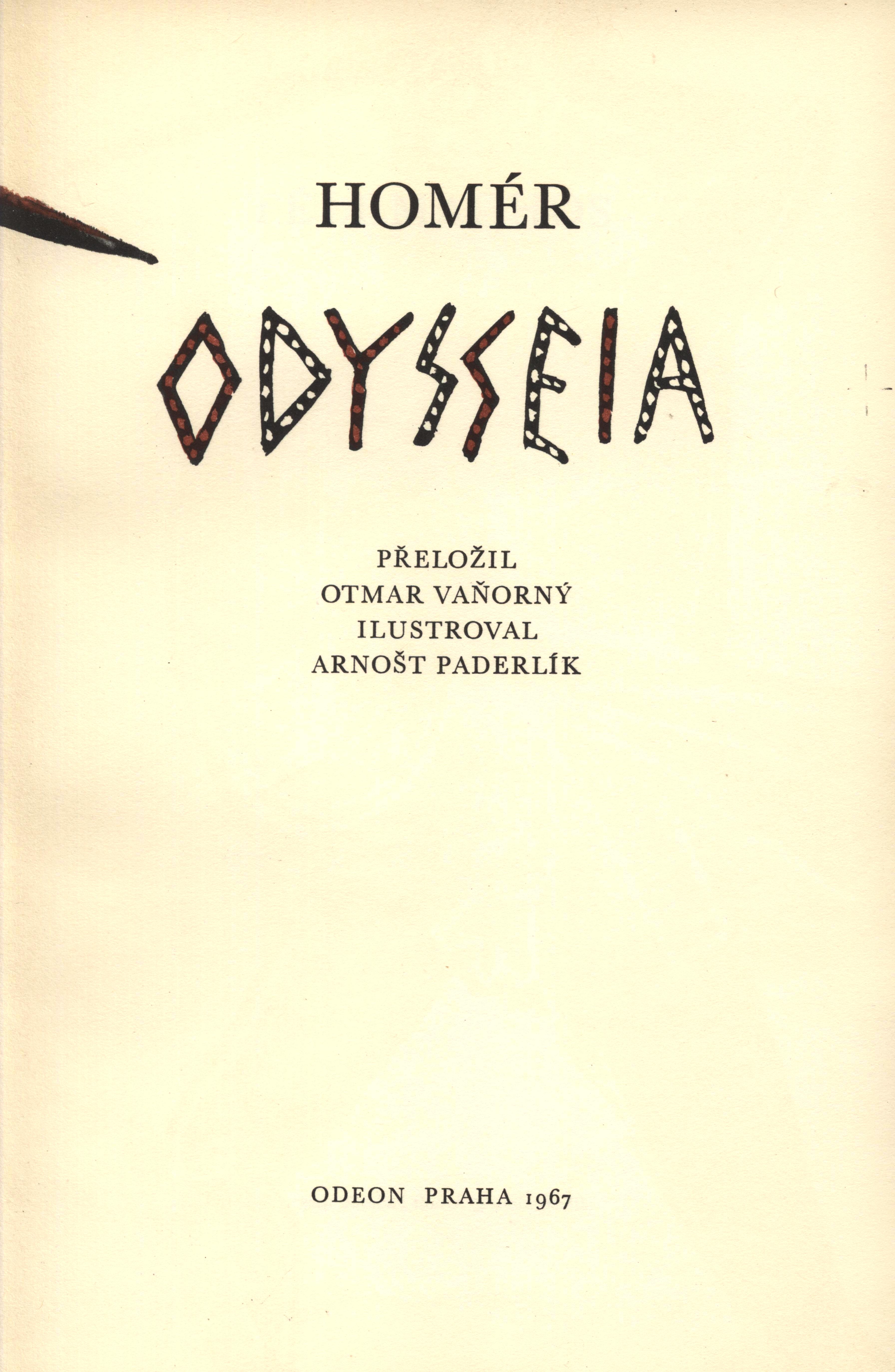 Title information Odysseia / Homér ; přeložil Otmar Vaňorný ; ilustroval Arnošt Paderlík ; [text redigovaný Ferdinandem Stiebitzem k vydání připravil Rudolf Mertlík ; doslov a poznámky napsal Ferdinand Stiebitz ; ilustroval, obálku, vazbu a grafickou úpravu navrhl Arnošt Paderlík] Author Homéros, činný 8. století př. Kr. (Author) Další autoři Vaňorný, Otmar, 1860-1947 (Translator) Stiebitz, Ferdinand, 1894-1961 (Editor) (Author of afterword, colophon, etc.) (Author of introduction) Mertlík, Rudolf, 1913-1985 (Editor) Paderlík, Arnošt, 1919-1999 (Illustrator) (Bookjacket designer) (Binding designer) (Graphic technician) Edition statement 2. vyd. v Odeonu Publication Praha : Odeon, 1967 Manufacture (PG 1) Scope 441 s. ; 8° ISBN (váz.) Edition Nesmrtelní / Řídí Jiří Zapletal. sv. 77