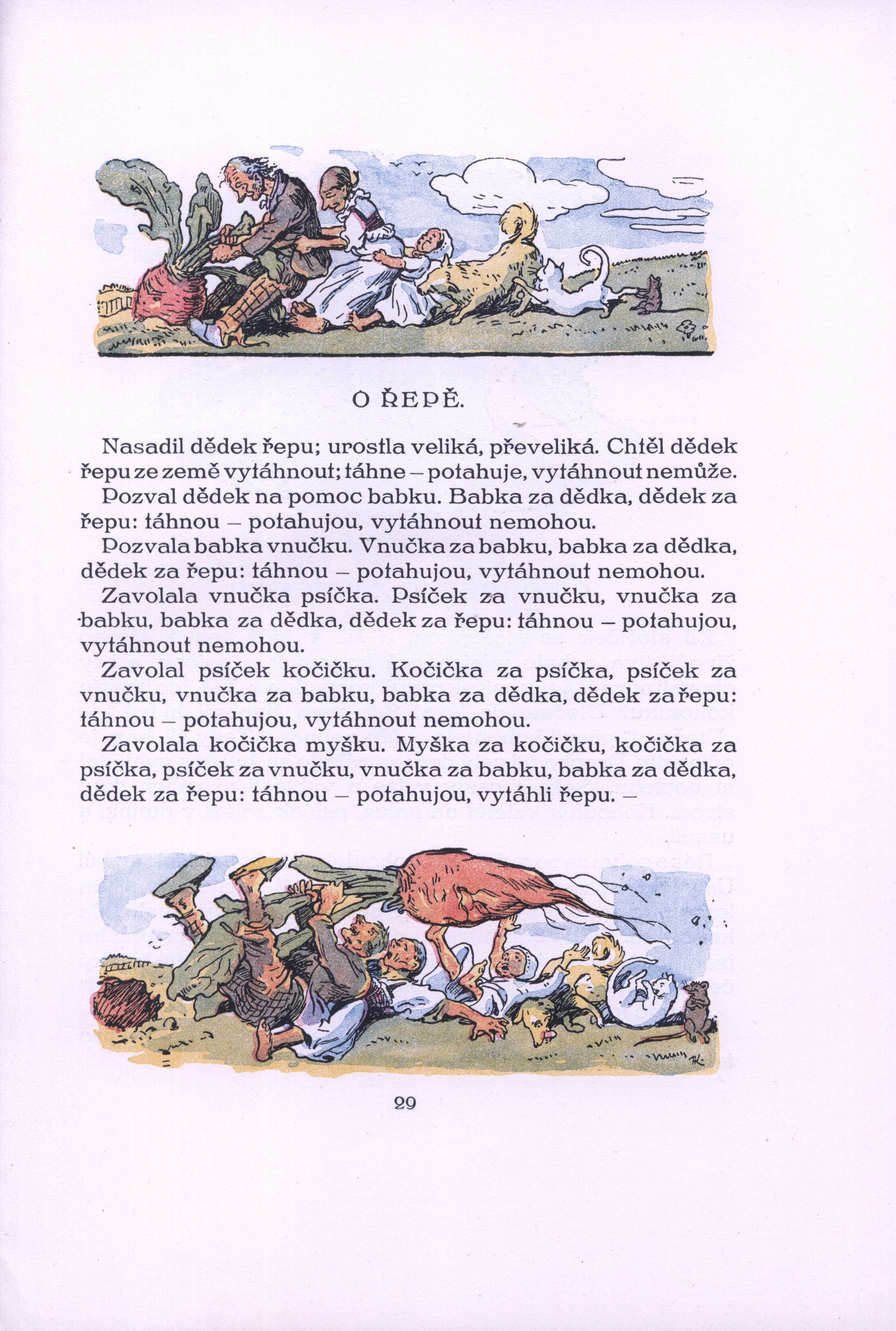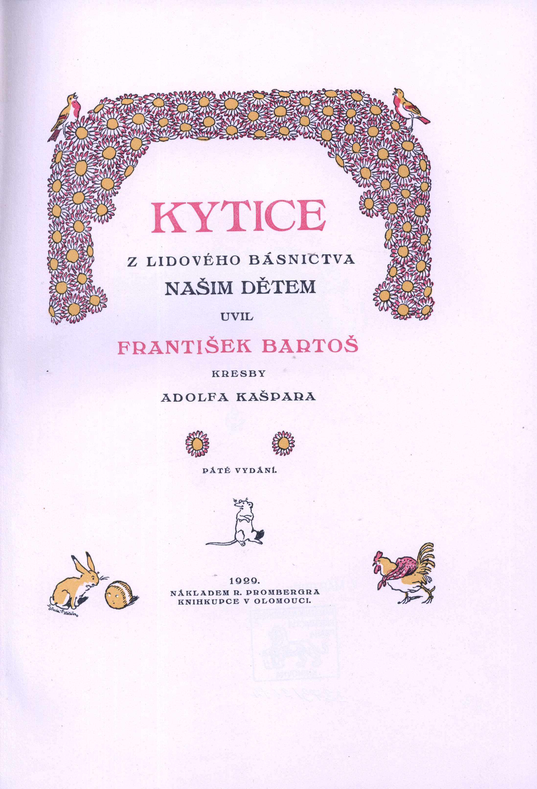 Title information Kytice : z lidového básnictva našim dětem uvil / František Bartoš ; kresby Adolfa Kašpara Personal name Bartoš, František, 1837-1906 (Author) Další autoři Kašpar, Adolf, 1877-1934 (Illustrator) Corporation R. Promberger (nakladatelství) (Publisher) Kramář a Procházka (firma) (Printer) Edition statement 5. vyd. Publication V Olomouci : Nákladem R. Prombergra, 1929 Manufacture (Tiskem národní knihtiskárny Kramář a Procházka) Scope 158 s. : il. ISBN (váz.) Country Czech Republic Language Czech Note Barevné ilustrace na přebalu, vazbě i titulním listu. - Na zadní straně přebalu nakladatelská upoutávka. - Barevné ilustrace v textu i celostránkové.