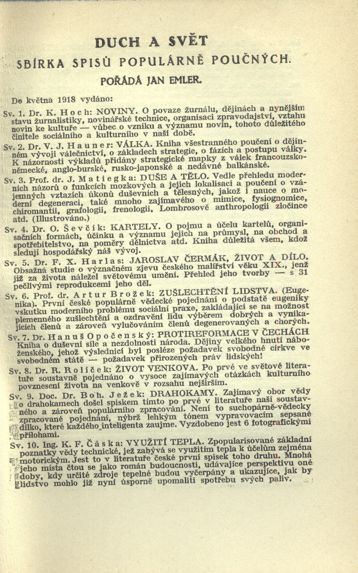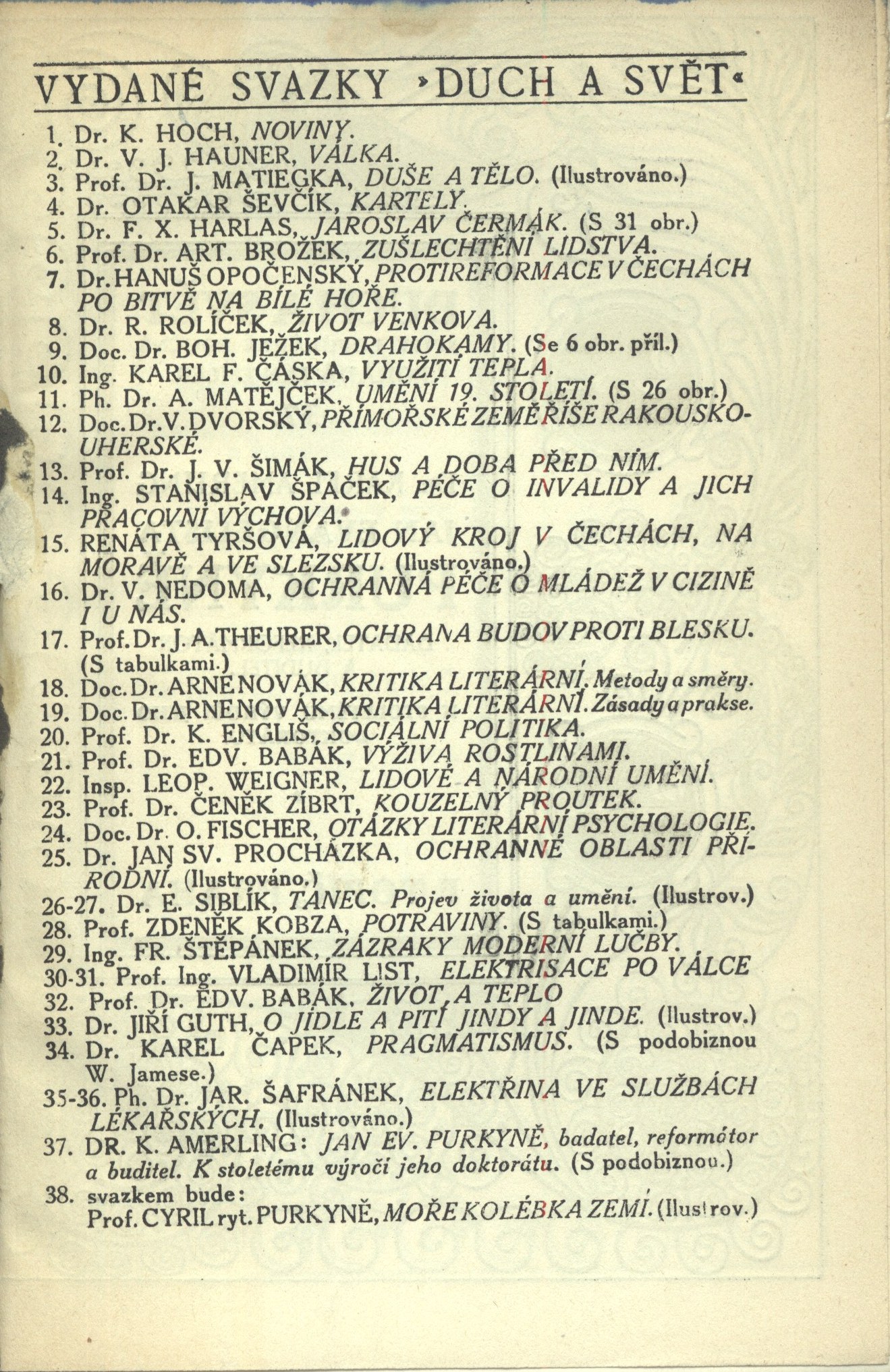 Duch a svět (F. Topič)Country Czech Republic Language Czech Note Typizovaný přebal. - Na záložkách nakladatelské upoutávky. - Obálka brože. - Zdobená přídeští obálky. - Seznam edice. - Edice proti titulu, ve zdobných rámcích. - Tiskárna a rok vydání. - Vložená nestránkovaná černobílá obrazová příloha. - Předmluva. - Zdobné záhlaví. - Poznámky pod čarou. - Koncová viněta. - Obsah. - Bez tiráže. - Ediční upoutávka. - Na zadní straně obálek opakující se nakladatelská značka a tiskárna.