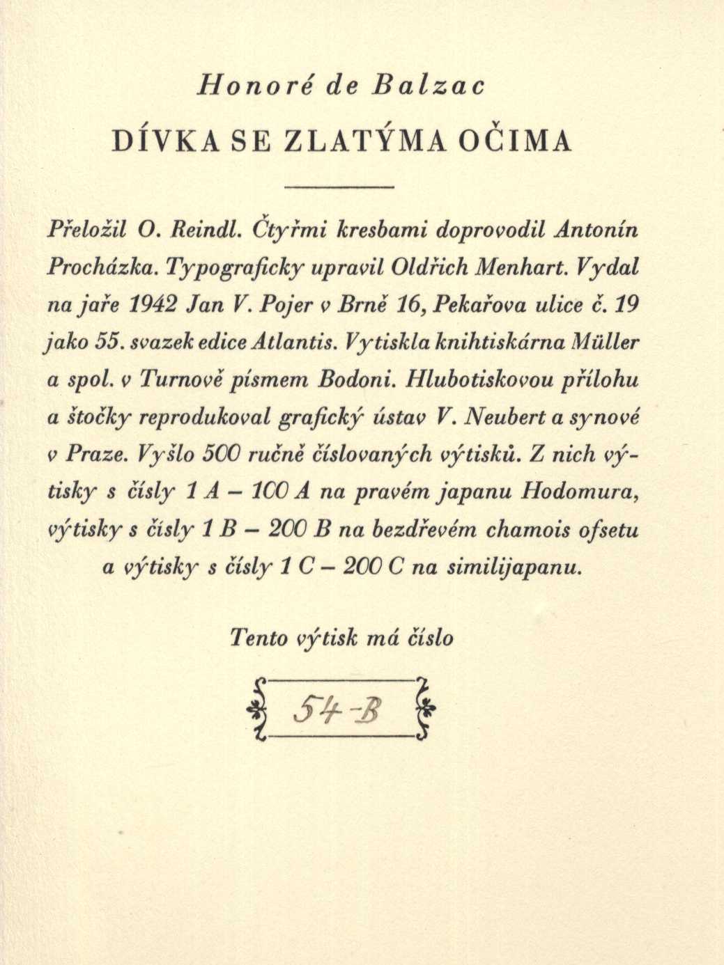 Title information Dívka se zlatýma očima / Honoré de Balzac ; [přeložil O. Reindl ; čtyřmi kresbami doprovodil Antonín Procházka ; typograficky upravil Oldřich Menhart] Personal name Balzac, Honoré de, 1799-1850 (Author) Další autoři Reindl, Oskar, 1902-1984 (Translator) Procházka, Antonín, 1882-1945 (Illustrator) Menhart, Oldřich, 1897-1962 (Typographer) Corporation Jan V. Pojer (Brno) (Publisher) Müller a spol. (tiskárna) (Printer) V. Neubert a synové (firma) (Printer of plates) Publication Brno : Jan V. Pojer, 1942 Manufacture Müller a spol. Scope 144 s. : il. ISBN (váz.) Edition Atlantis sv. 55