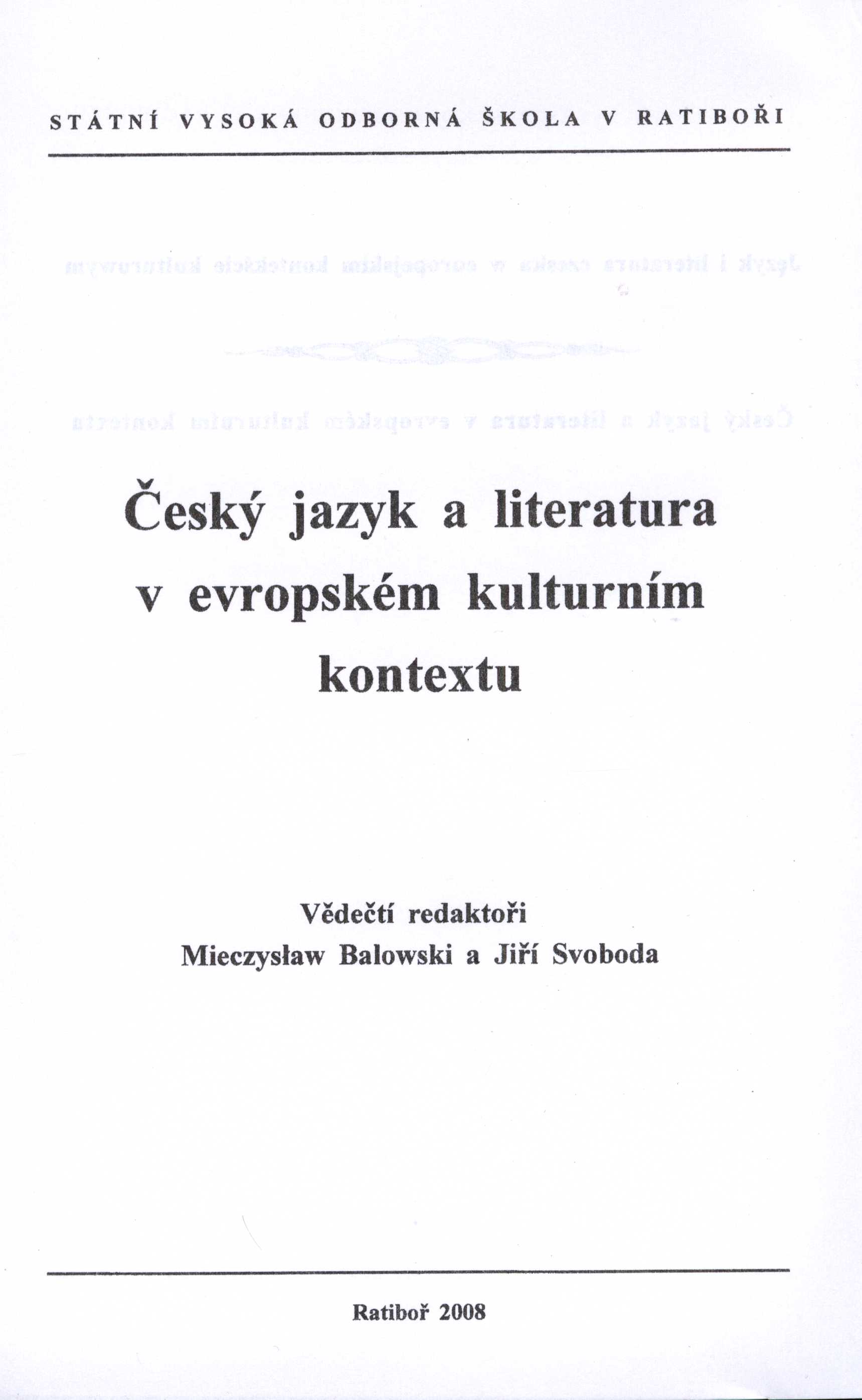 Title information Język i literatura czeska w interakcji = Český jazyk a literatura v evropském kulturním kontextu / redakcja naukowa Mieczysław Balowski i Jiří Svoboda Další autoři Balowski, Mieczysław, 1956- (Editor) Svoboda, Jiří, 1931- (Editor) Corporation Państwowa Wyższa Szkoła Zawodowa w Raciborzu (Publisher) Publication Racibórz : Państwowa Wyższa Szkoła Zawodowa, 2008 Scope 507 s. ISBN 978-83-60730-15-7 (brož.) Country Poland Language Polish * Czech Note Zdobená obálka. - Rozložený titulní list. - Obsahuje bibliografie. - Český a polský text. - Anglická nebo německá resumé.