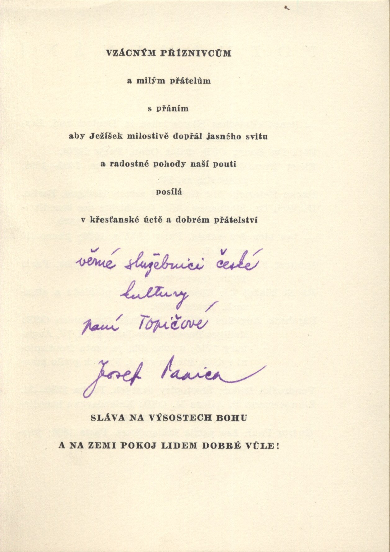Title information Povolání svatého Odona / Josef Papica ; [upravila a vyzdobila Marie Floriánová[sic!]-Stritzková] Personal name Papica, Josef, 1903-1970 (Author) (Inscriber) (Dedicator) Další autoři Florianová Stritzková, Marie, 1909-1998 (Book designer) (Illustrator) (Bookjacket designer) Topičová, Milada, 1888-1961 (Dedicatee) Corporation Odon Řezníček (firma) (Publisher) Č.A.T., Českomoravské akciové tiskařské a vydavatelské podniky (Praha) (Printer) (Printer of plates) Publication Ve Stolíně : u Odona Řezníčka, 1940 Manufacture vytiskly lisy Č. A. T., Českomoravských akciových tiskařských a vydavatelských podniků) Scope 61 s. : il. ; 16 cm ISBN brož. Country Czech Republic Language Czech Note Zdobená obálka. - Frontispis. - Titulní list. - Černobílé ilustrace, některé celostránkové. - Tiráž. - Literatura.