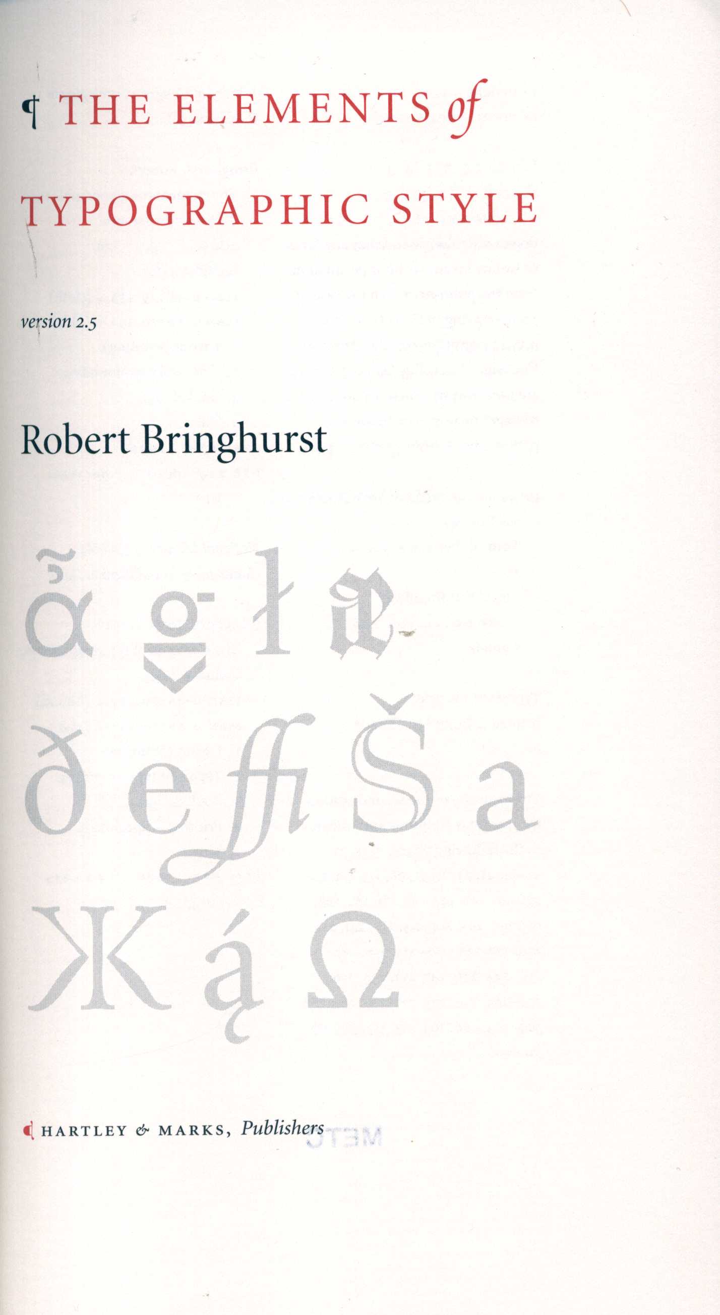 Title information The elements of typographic style : version 2.5 / Robert Bringhurst ; [this book was designed by Robert Bringhurst] Personal name Bringhurst, Robert, 1946- (Author) (Typographer) Edition statement 2. ed. Publication Vancouver, BC ; Point Roberts, WA : Hartley & Marks, 2002 Manufacture Friesens) Scope 350 s. ISBN 0-88179-132-6 (brož.) Country Canada Language English Note Zdobená obálka. - Na záložkách obálky informace o knize. - Proti titulnímu listu seznam děl R. Bringhursta. - Černobílé ilustrace. - Rejstřík. - Dodatek.