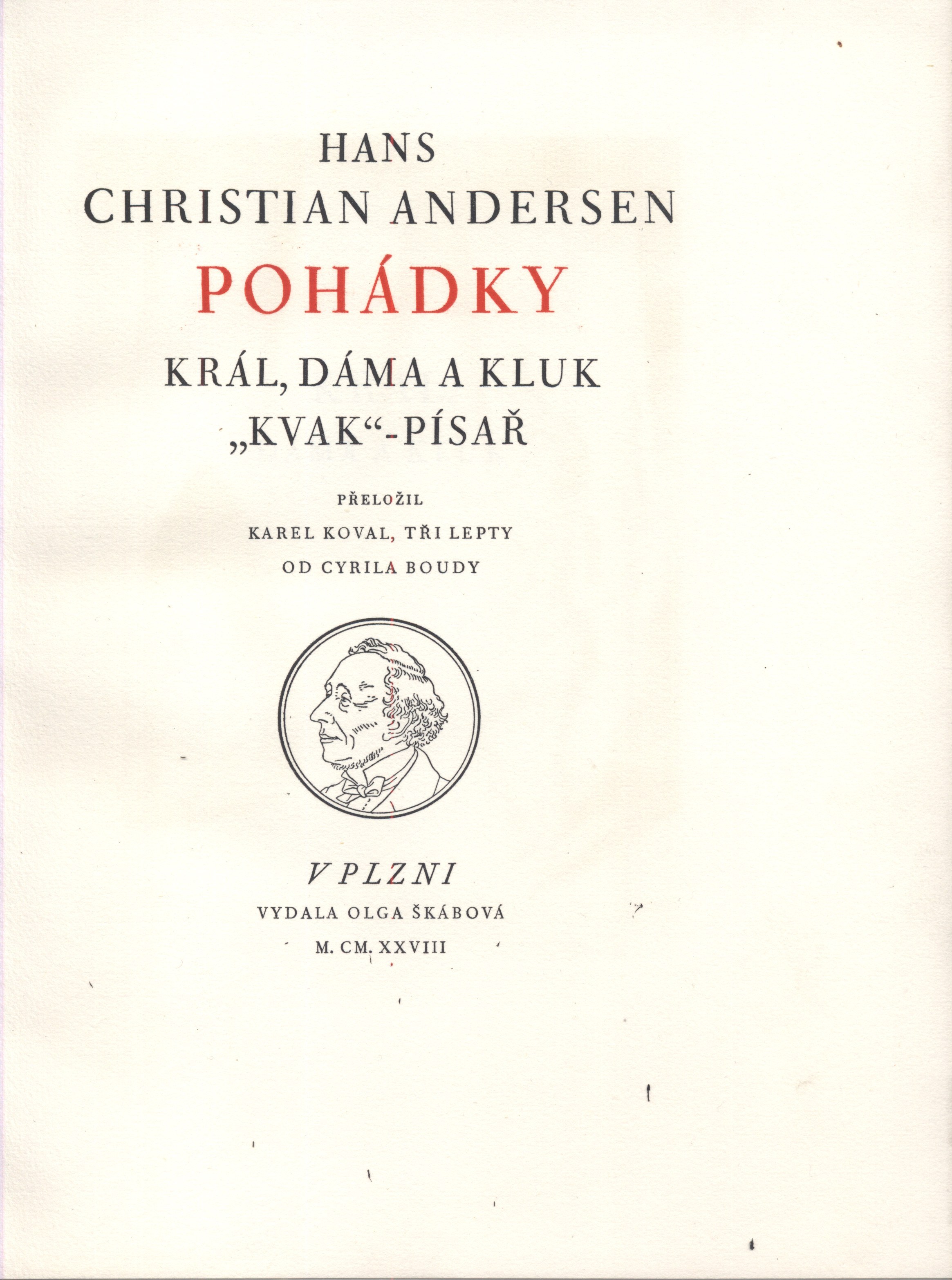 Tiráž: "H. C. Andersen. Pohádky. Tuto knihu přeložil a studii o autoru napsal Karel Koval. Tři lepty, grafická úprava a návrh na vazbu od Cyrila Boudy. Typy Fournierovými vytiskla dvoubarevně na papíru van Gelderově Průmyslová tiskárna Praze. Lepty tiskl Mirro Pegrassi v graf. ústavu A. de Pian. Vydala ji Olga Škábová v Plzni v březnu 1928 ve 120 výtiscích, číslovaných 1-120, z nichž prvních 40 svázal do pergamenu Karel Šilingr v Plzni. Kromě toho tištěno 30 neprodejných výtisků číslovaných I-XXX. Tento výtisk má číslo"