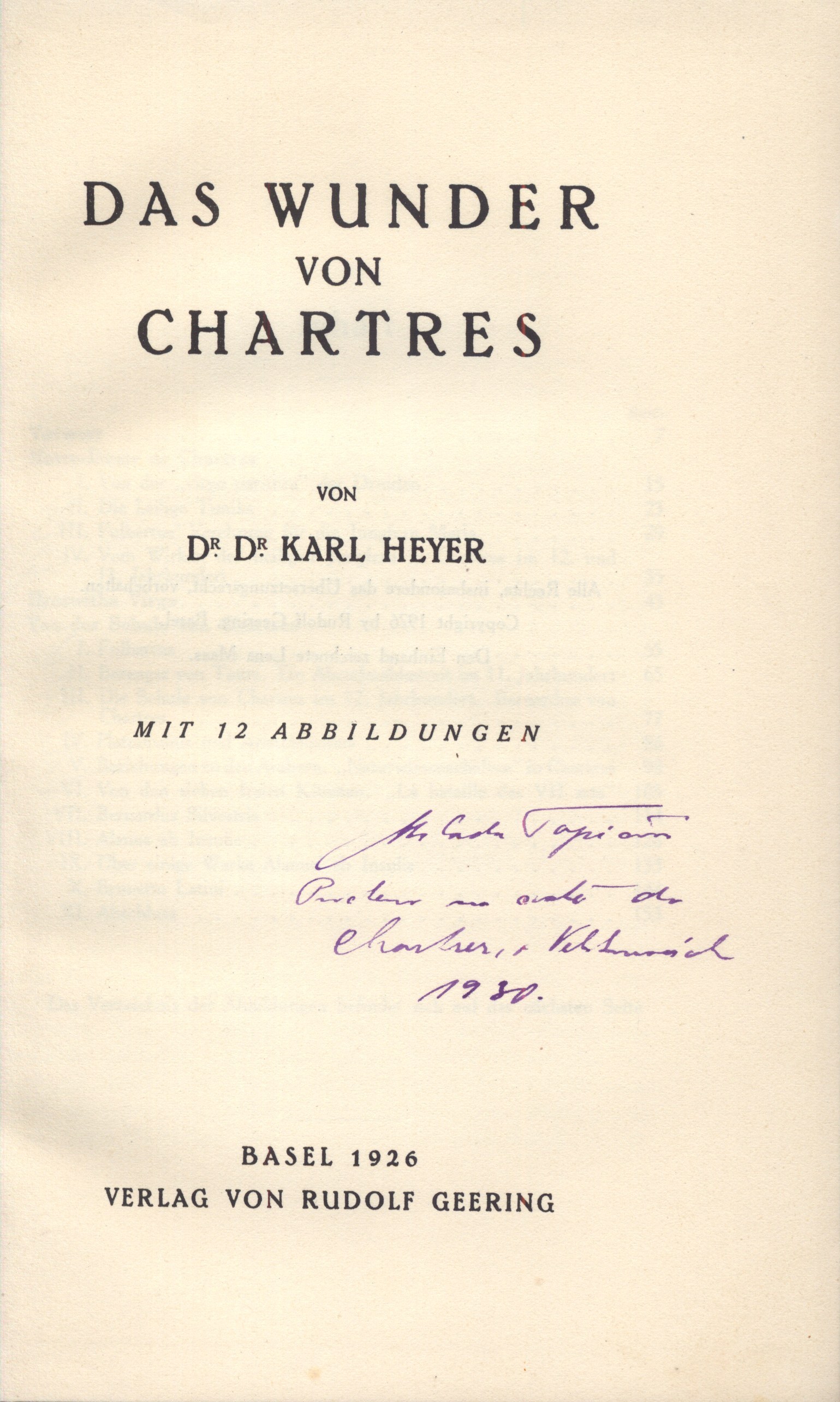 Title information Das Wunder von Chartres : mit 12 Abbildungen / von Karl Heyer ; [den Einband zeichnete Lena Maas] Personal name Heyer, Karl, 1888-1964 (Author) (Author of introduction) Další autoři Maas Lena, nar. 1891 (Binding designer) Topičová, Milada, 1888-1961 (Former owner) (Inscriber) Corporation Verlag von Rudolf Geering (nakladatelství) (Publisher) Další var.názvy Das Wunder von Chartres Publication Basel : Verlag von Rudolf Geering, 1926 Scope 155 s., [12] l. obr. příl. ; 23 cm ISBN (váz.) Country Switzerland Language German Note Zdobená vazba. - Frontispis. - Titulní list. - Text německy. - Předmluva. - Poznámky pod čarou. - Černobílé fotografie jako obrazové přílohy. - Bez tiráže. - Nakladatelské upoutávky.